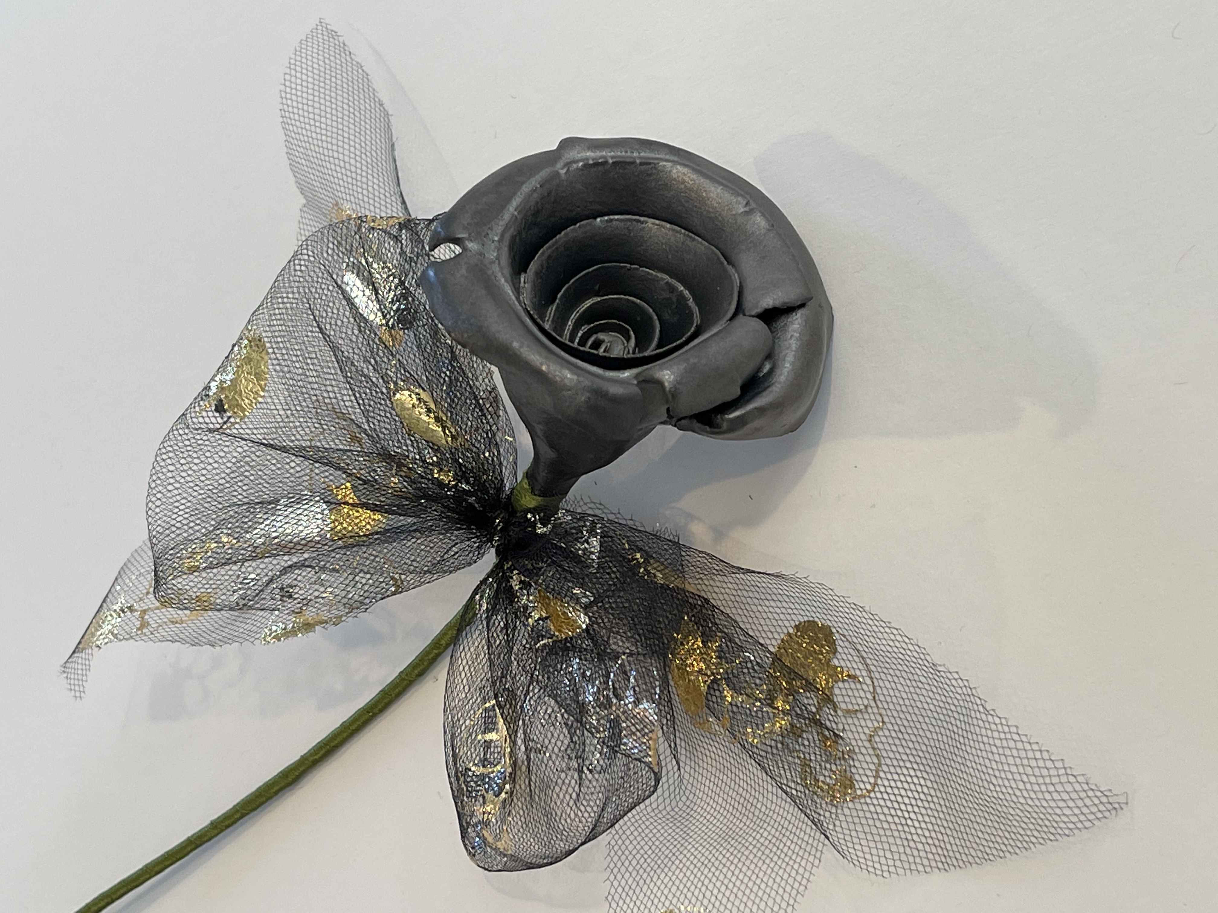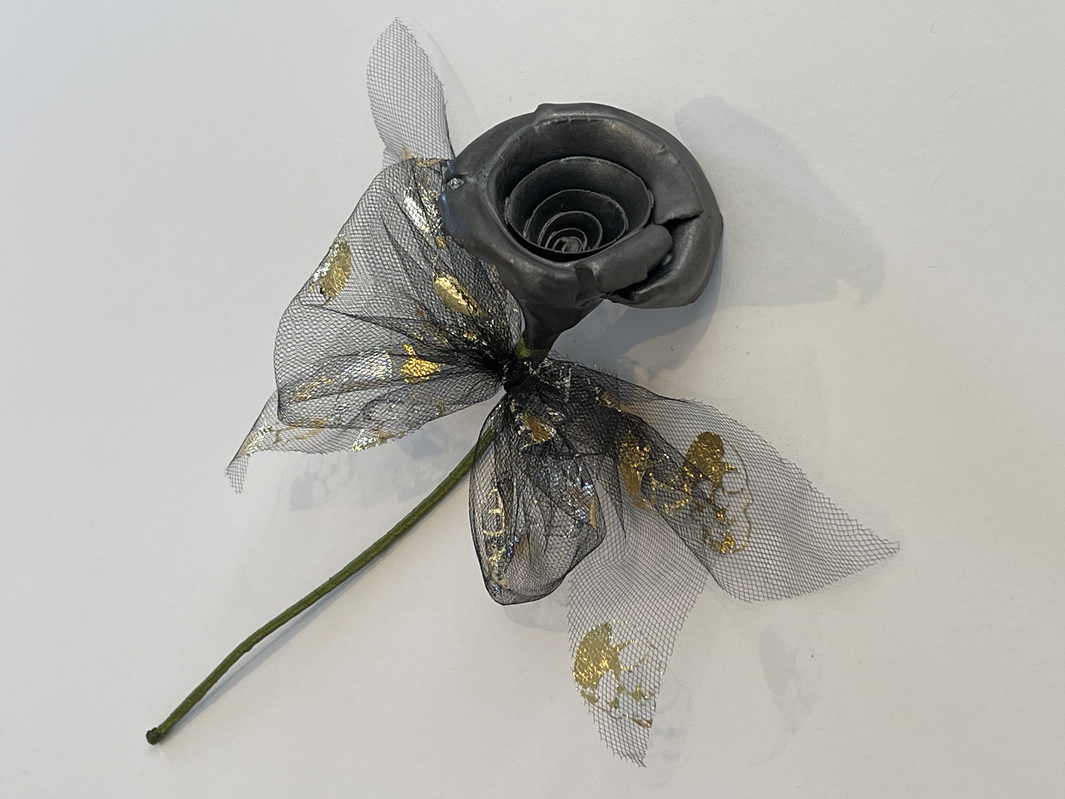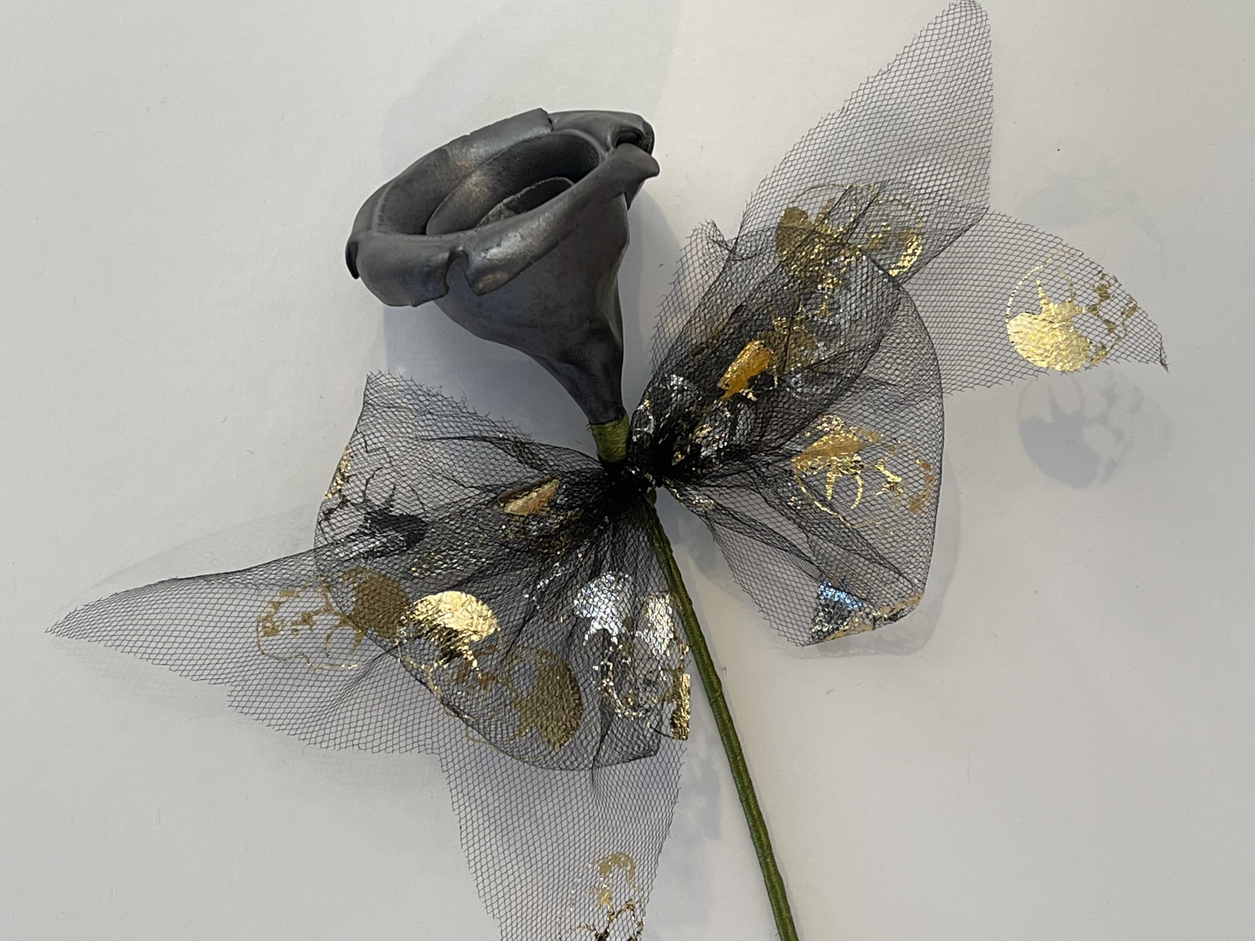 Hand sculpted porcelain rose glaze with a brushed steel black. Stem is wrapped with green ribbon. Bow is tulle and has the design of metallic gold skulls.