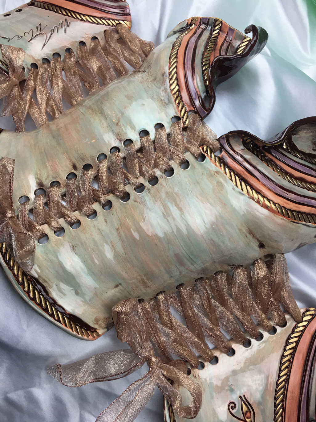 Nicole Moan Ceramic Corsets are all hand sculpted clay pieces, glazed with traditional pottery glazes. They are made to be worn or displayed as art. She creates custom pieces as well.