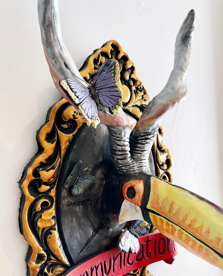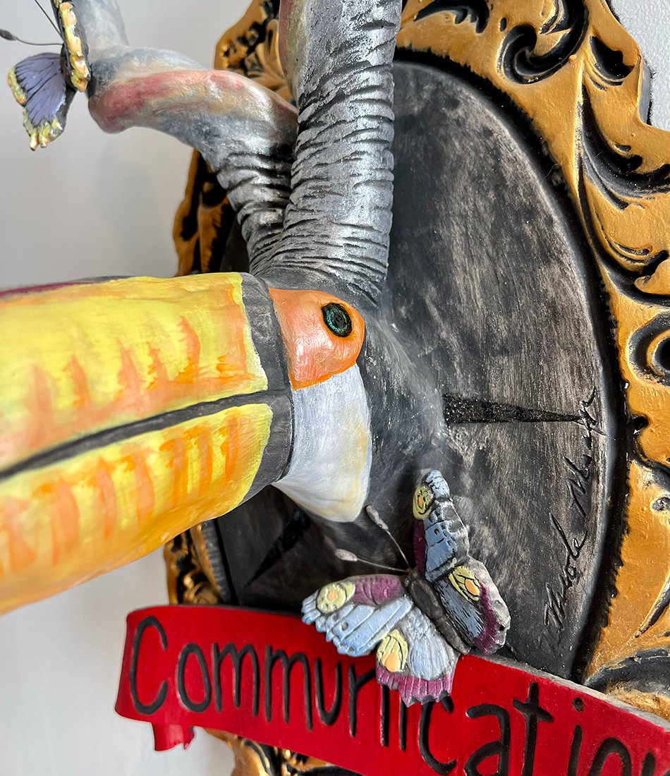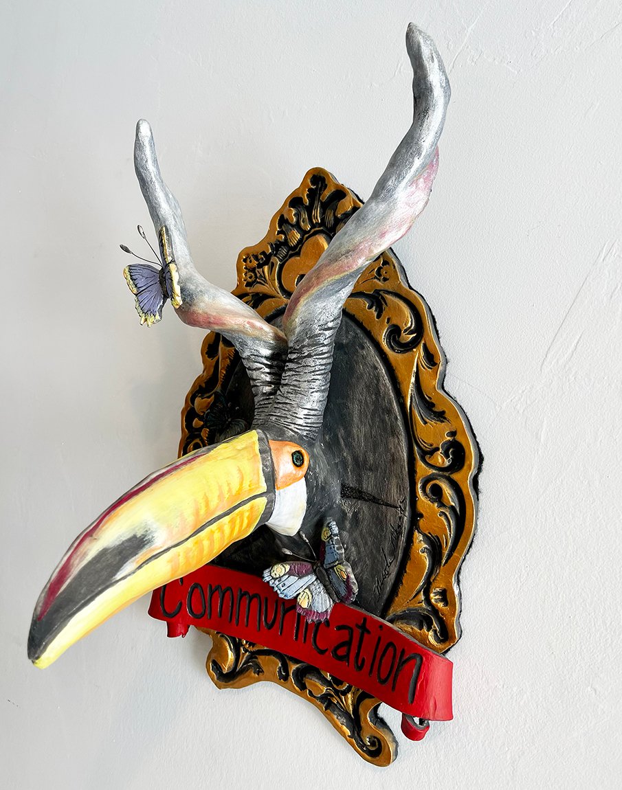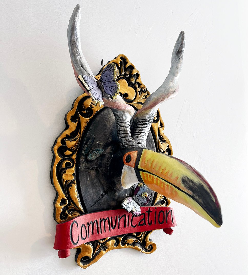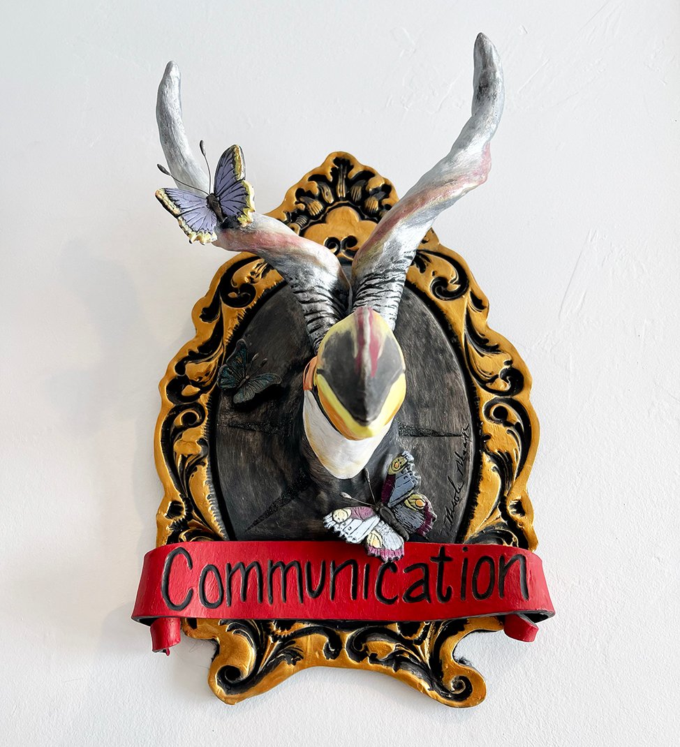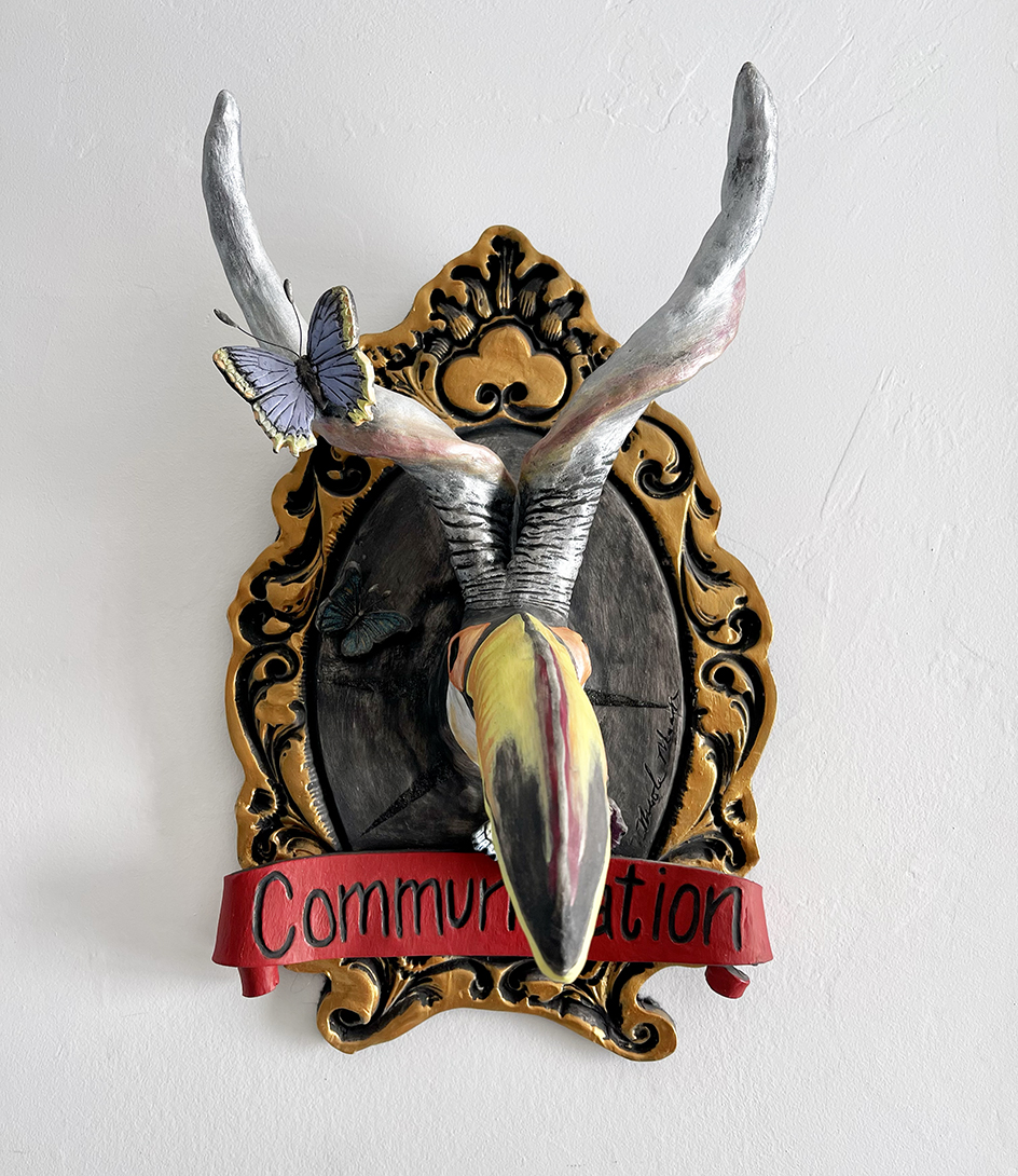 Communication is part of my "Anthropomorphism " series. Hand sculptured clay, acrylic and resin. Size is 17" X 11" X 10" wall hung with felt backing and hanging wire.