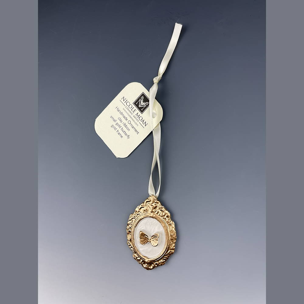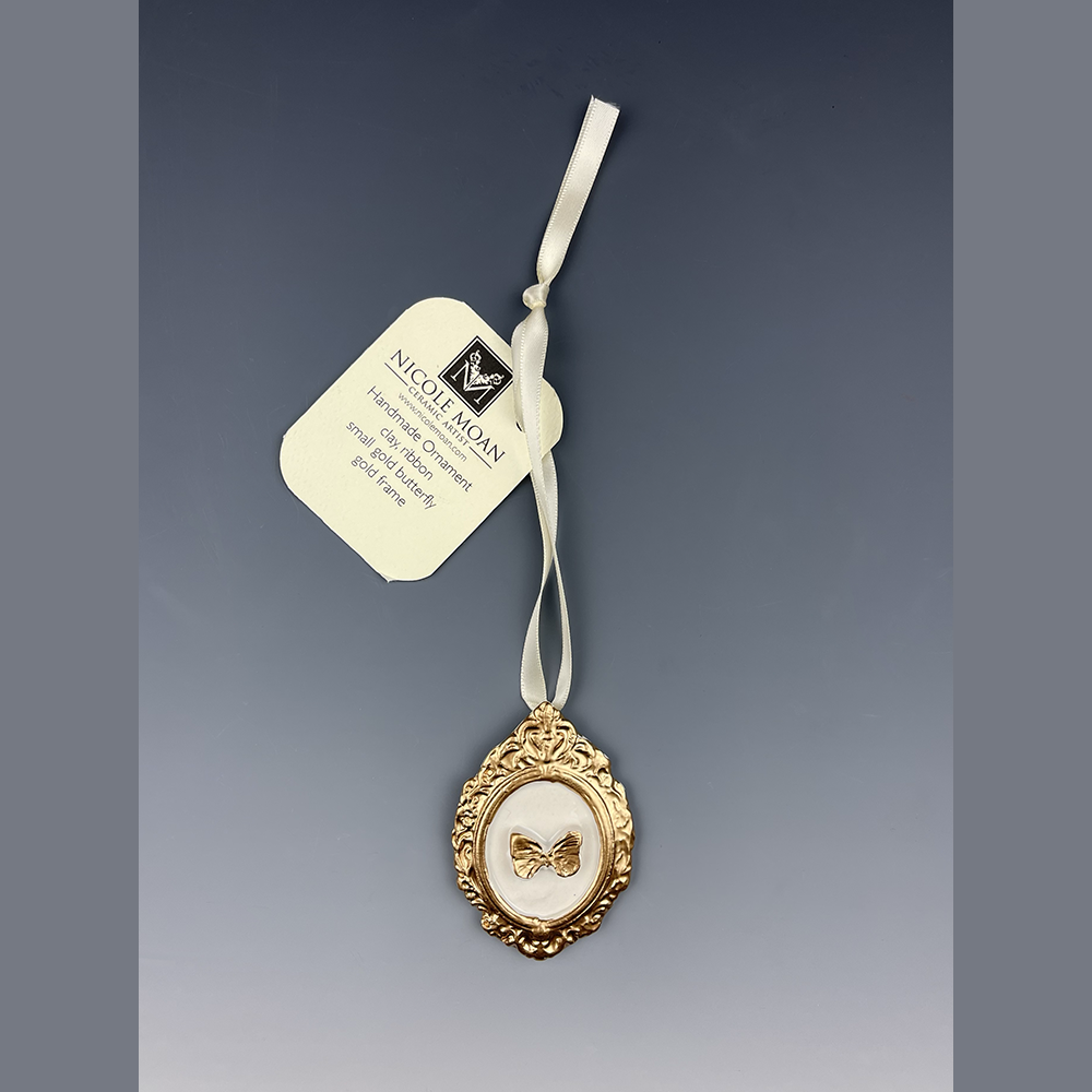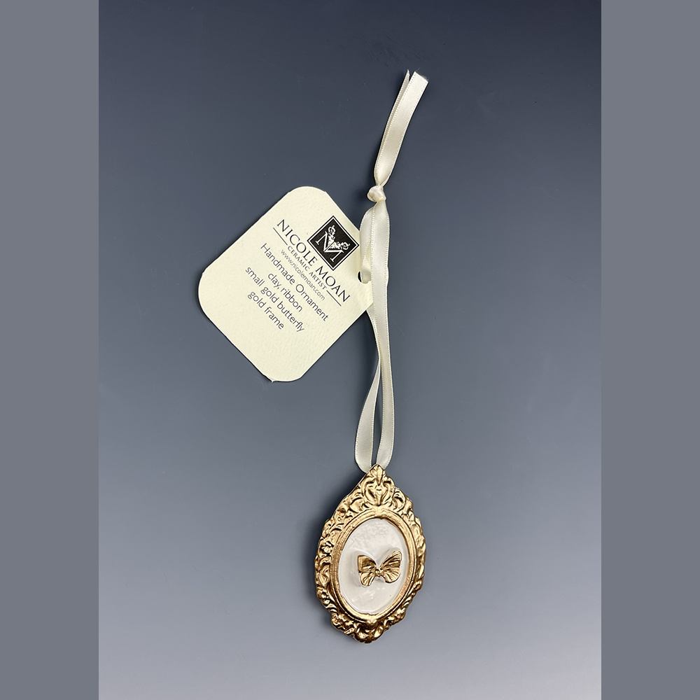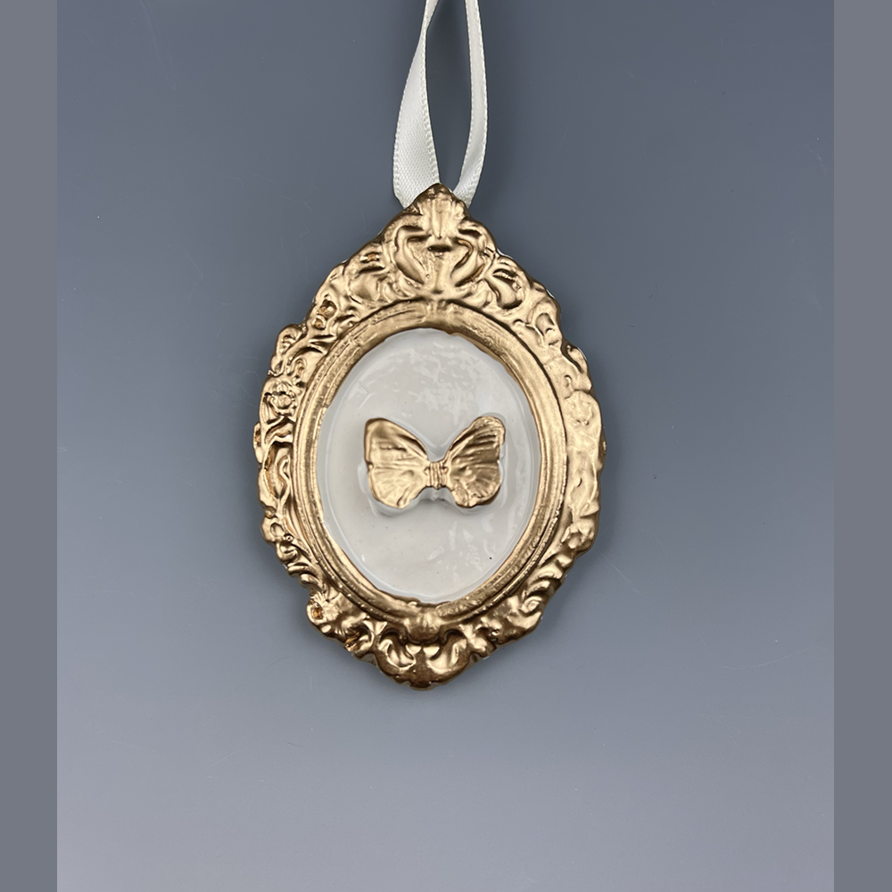 Hand sculpted clay Ornament with hand painted large gold butterfly with a white frame