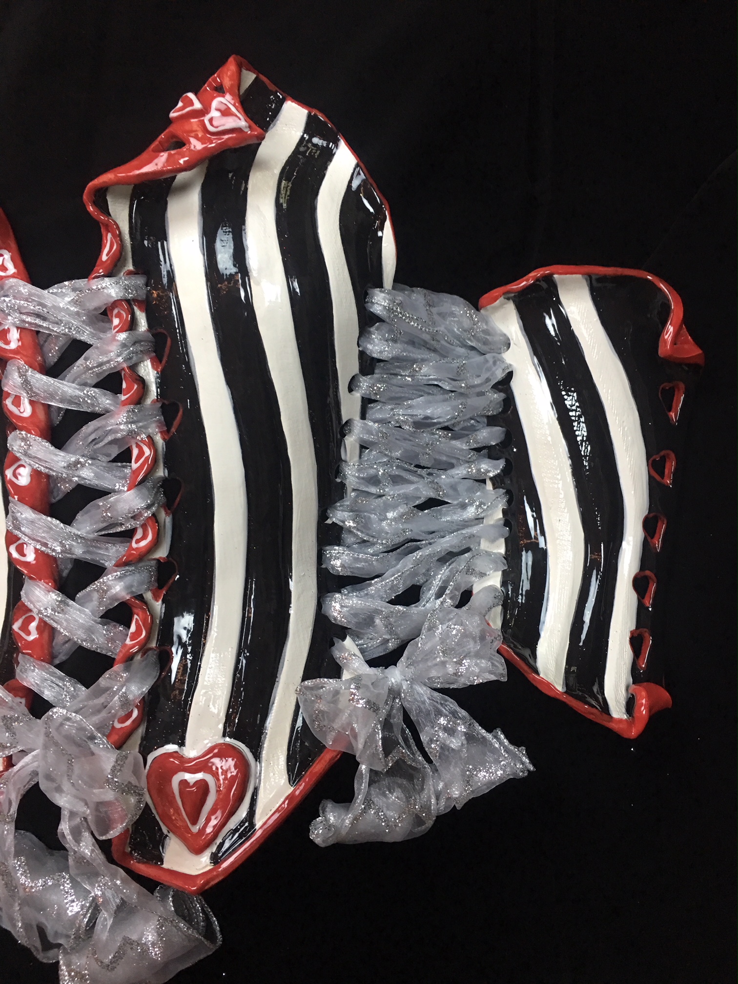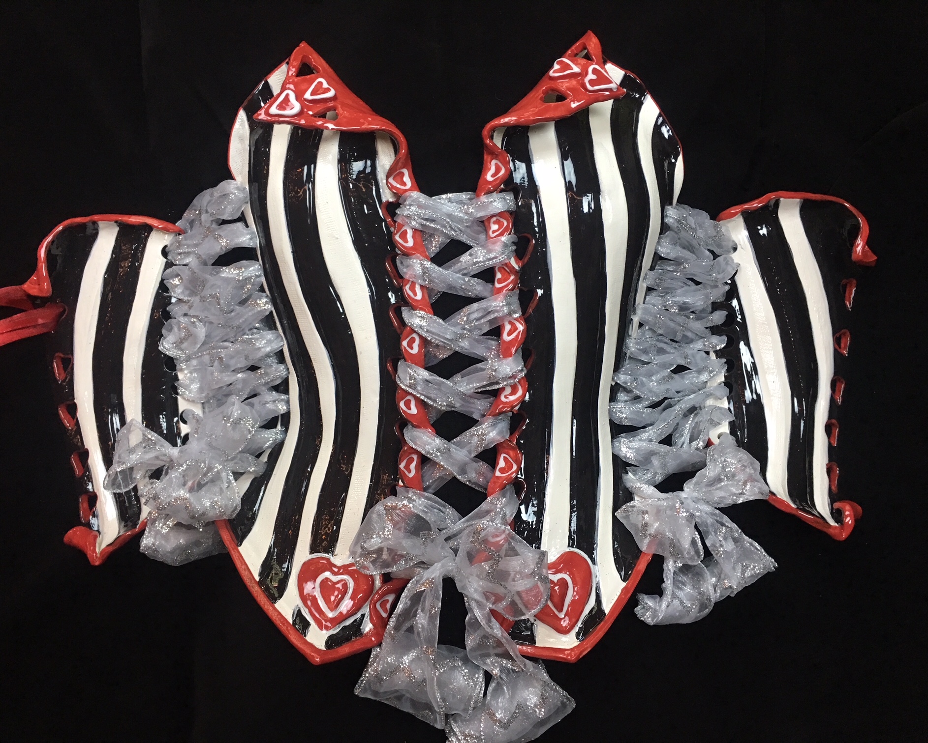 Nicole Moan Ceramic Corsets are all hand sculpted clay pieces, glazed with traditional pottery glazes. They can be worn or displayed as art.