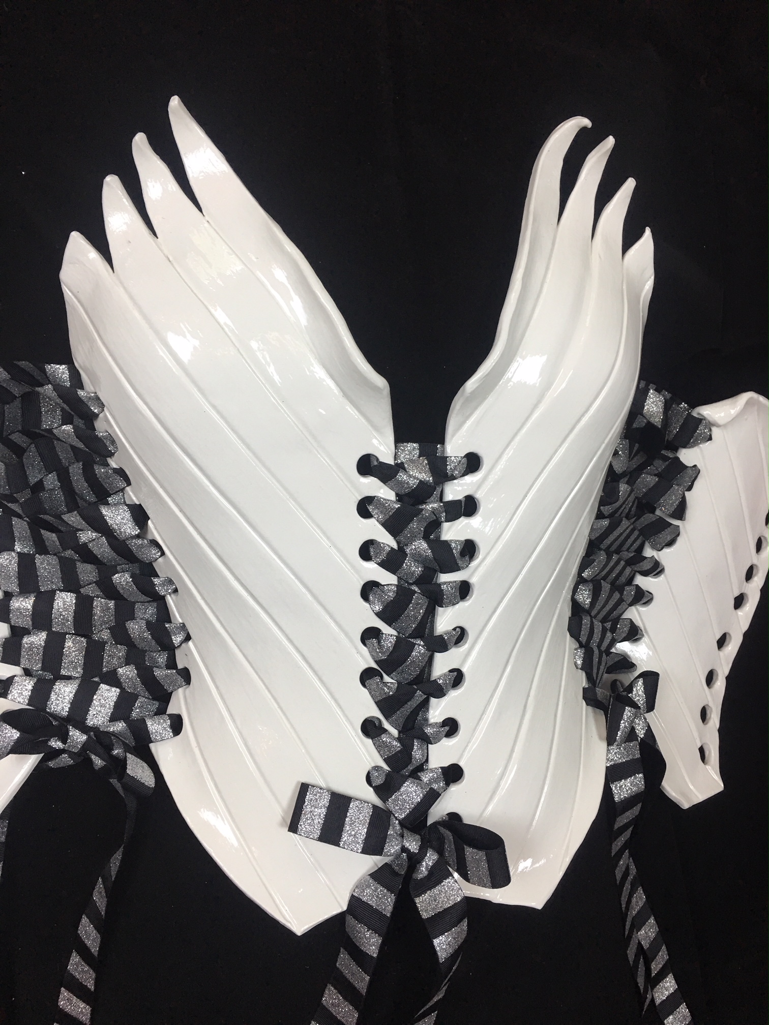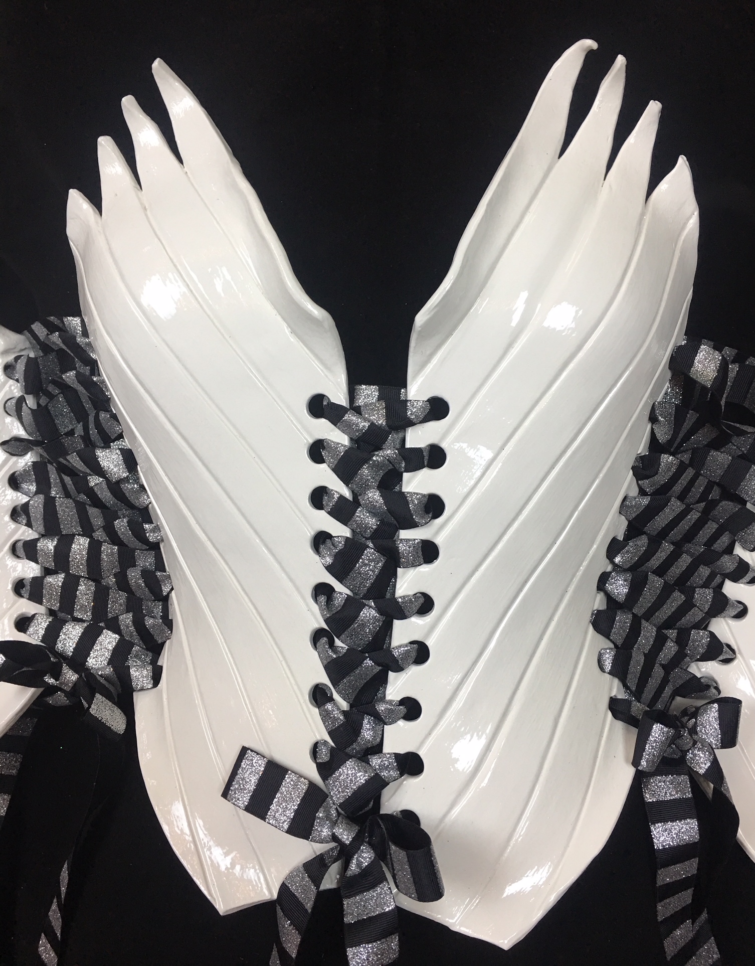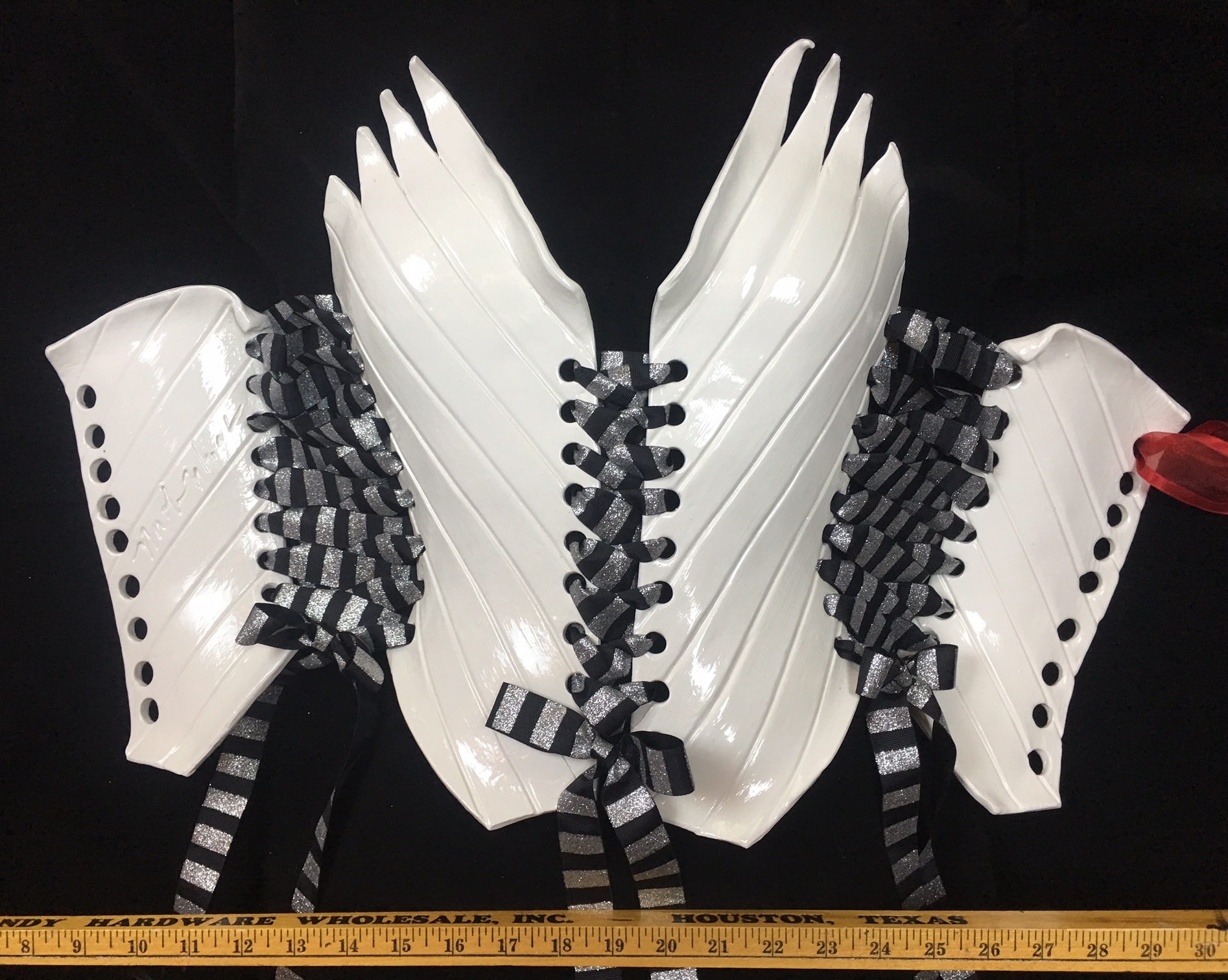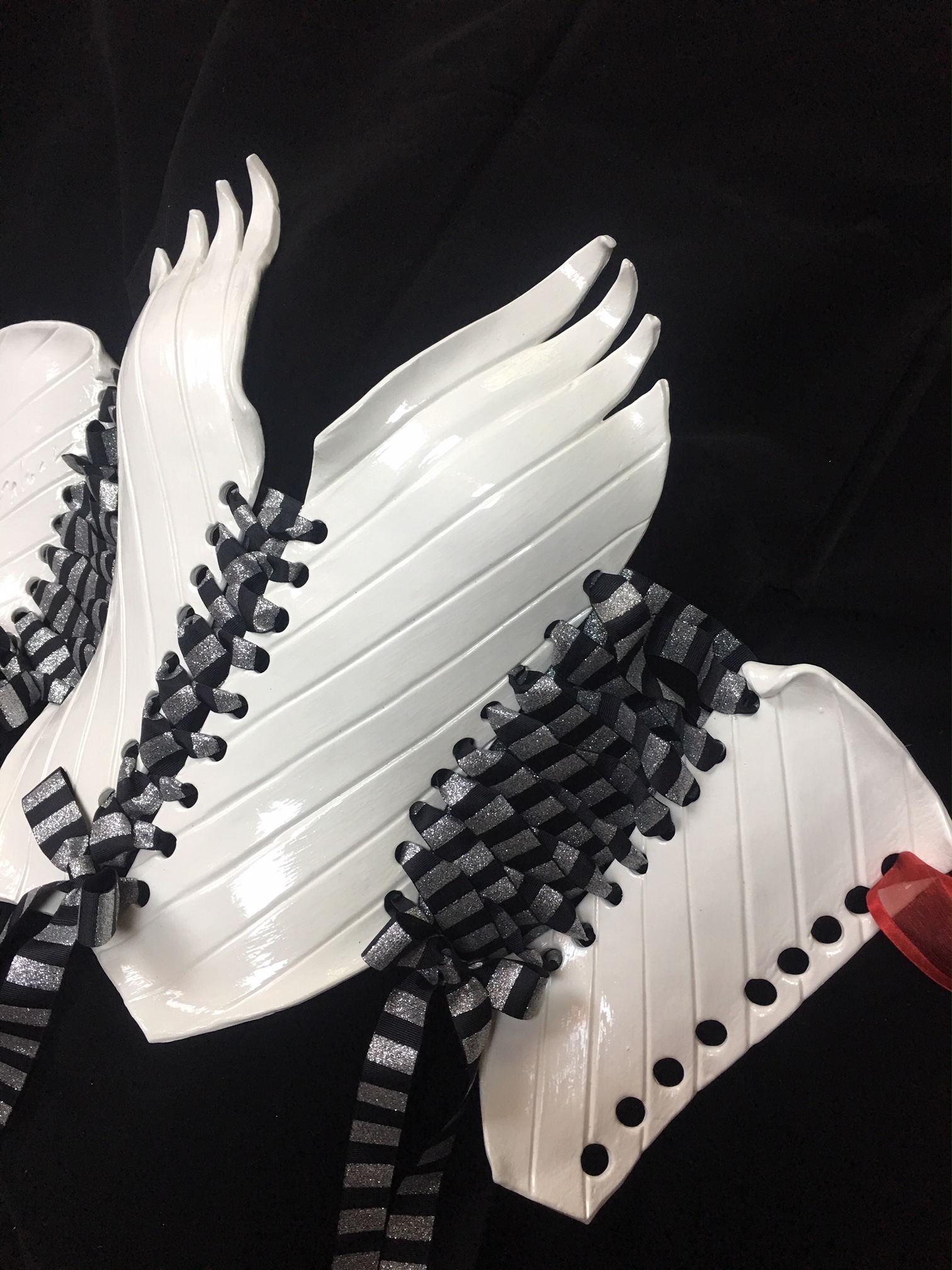 Nicole Moan Ceramic Corsets are all hand sculpted clay pieces, glazed with traditional pottery glazes. They can be worn or displayed as art.