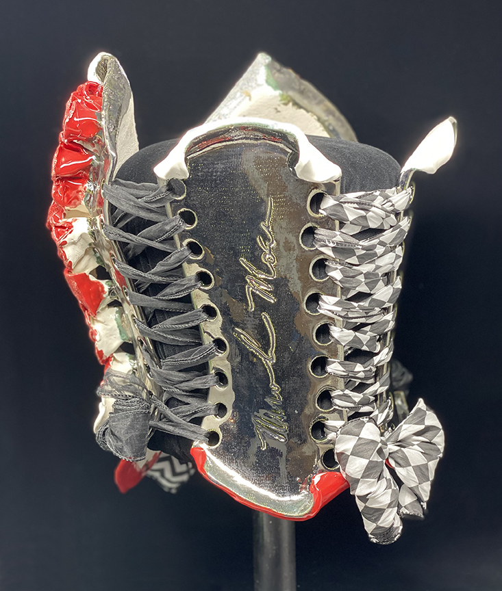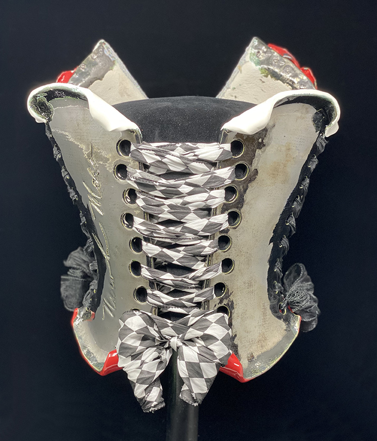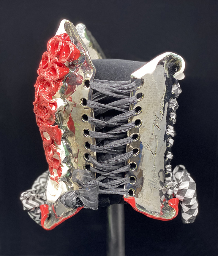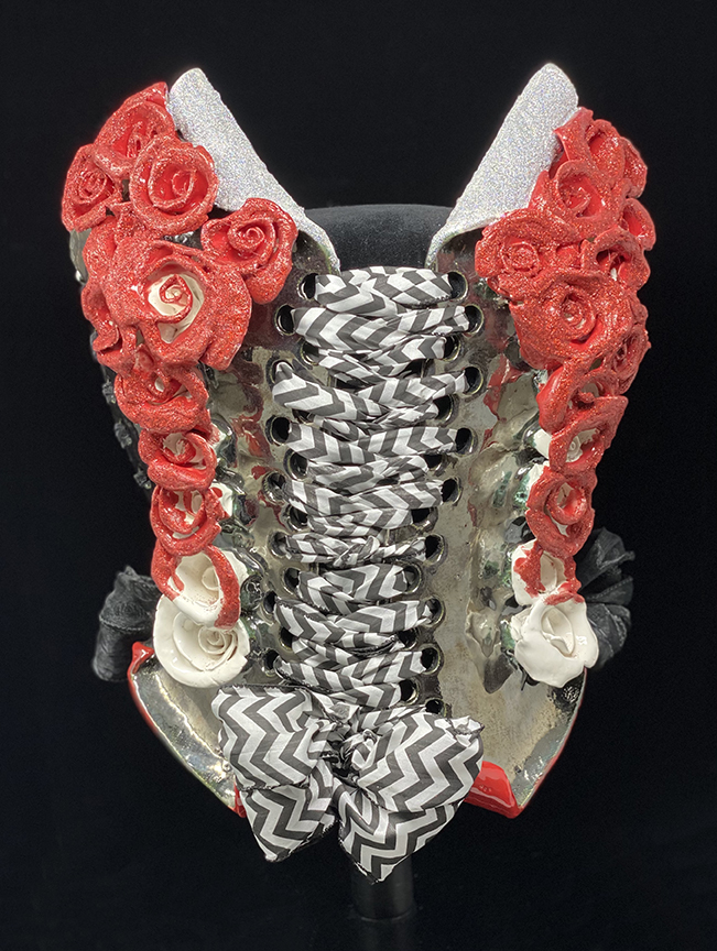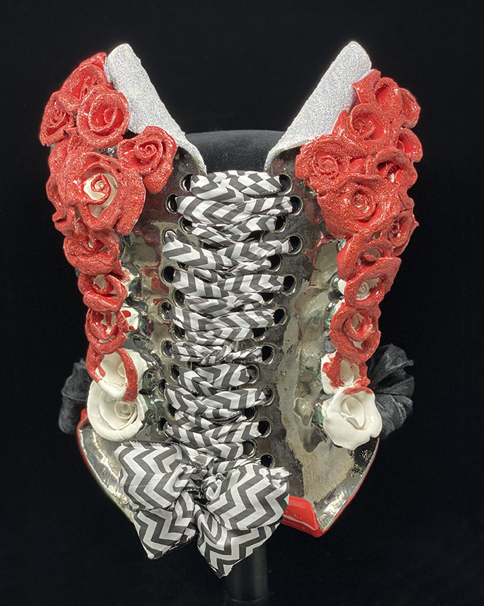 Nicole Moan Ceramic Corsets are all hand sculpted clay pieces, glazed with traditional pottery glazes. They can be worn or displayed as art.