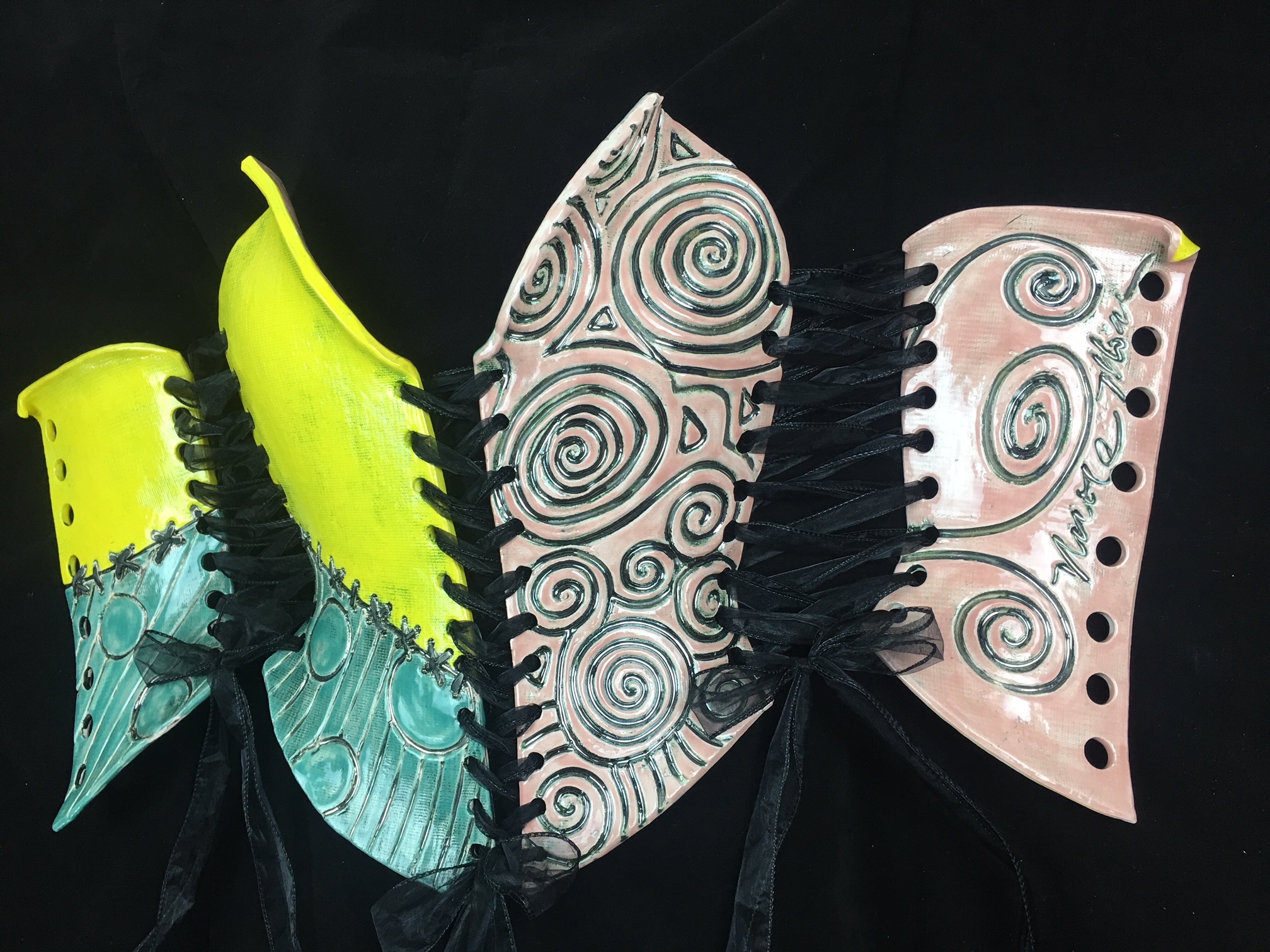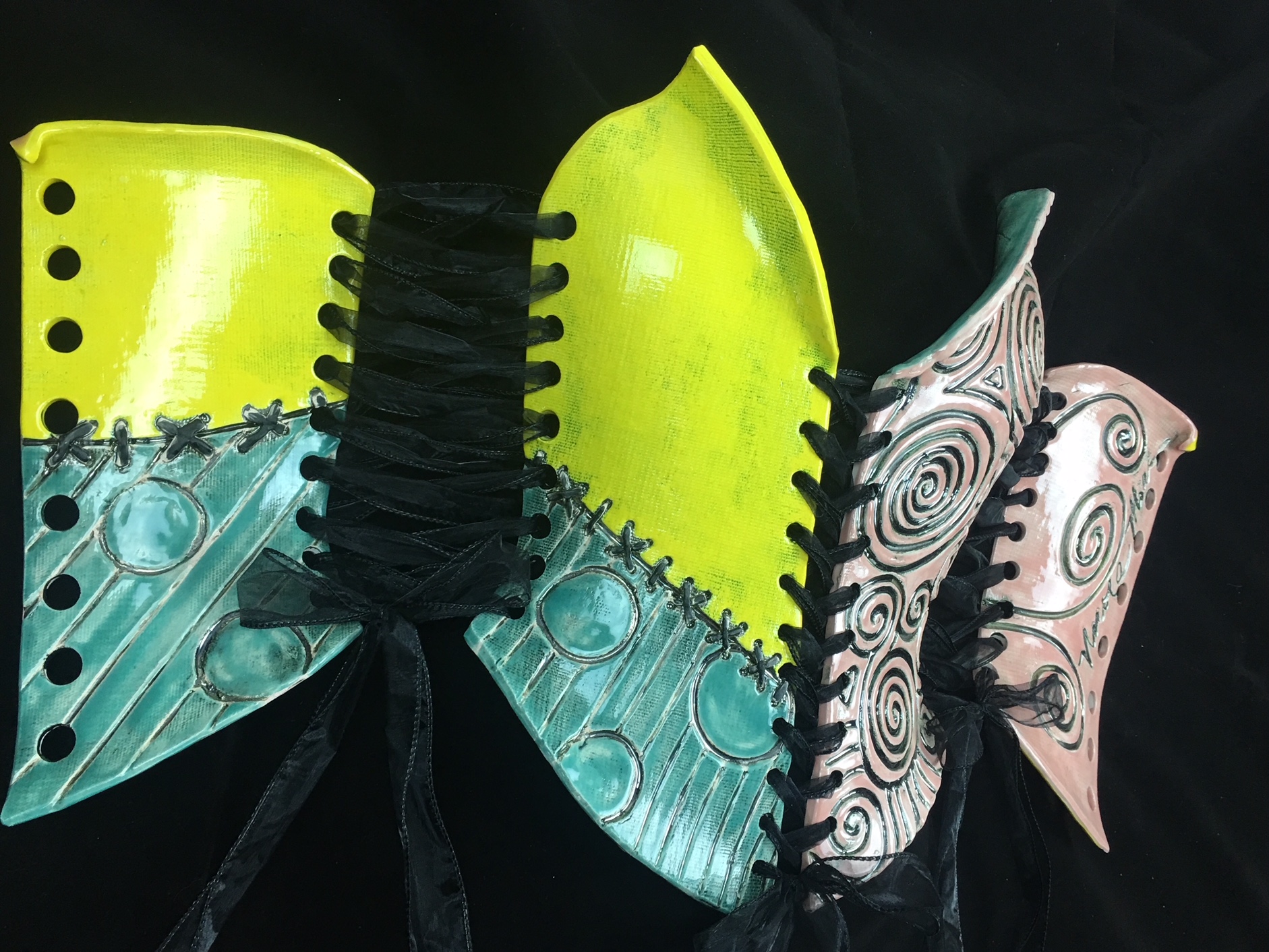 Nicole Moan Ceramic Corsets are all hand sculpted clay pieces, glazed with traditional pottery glazes. They can be worn or displayed as art.