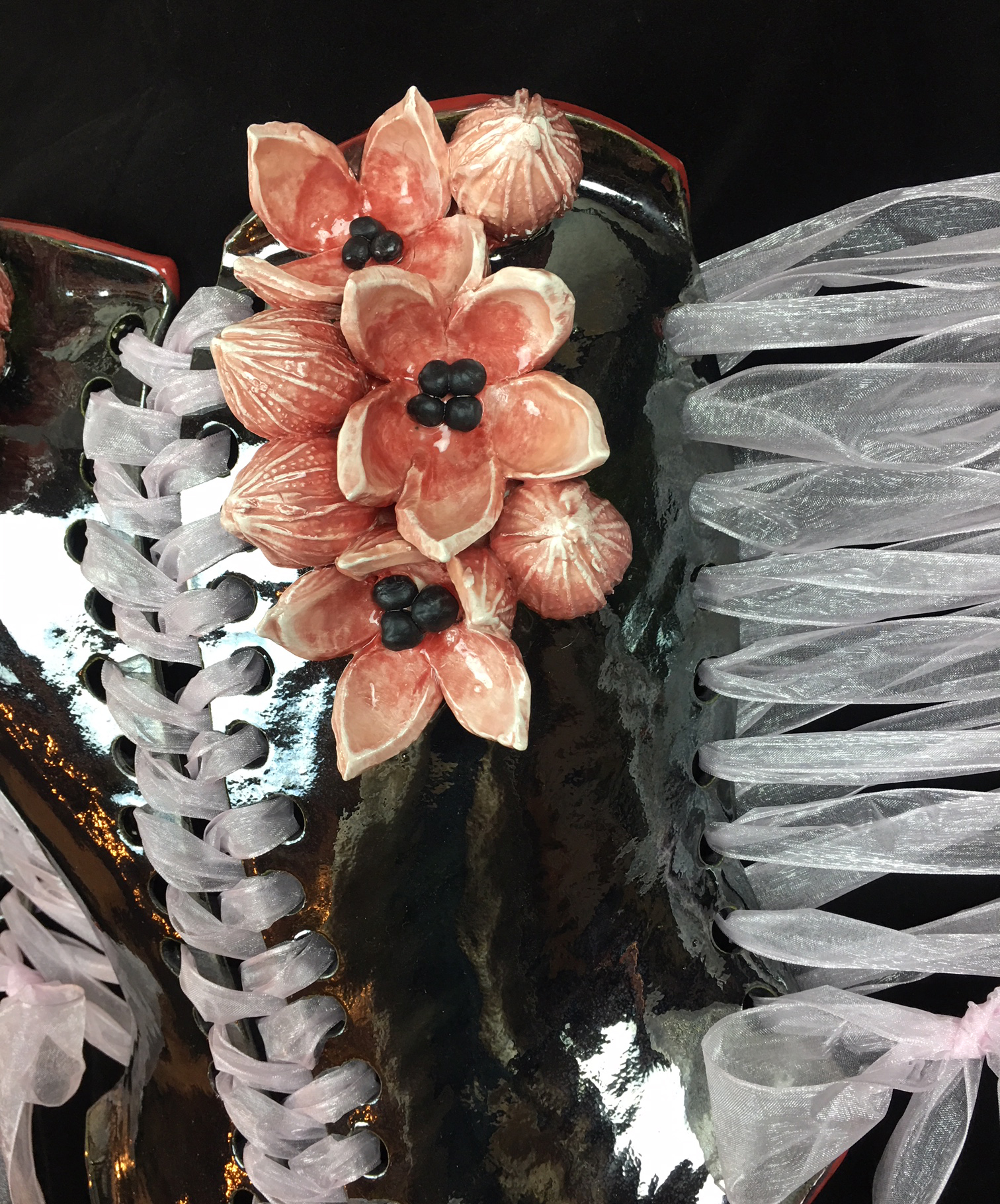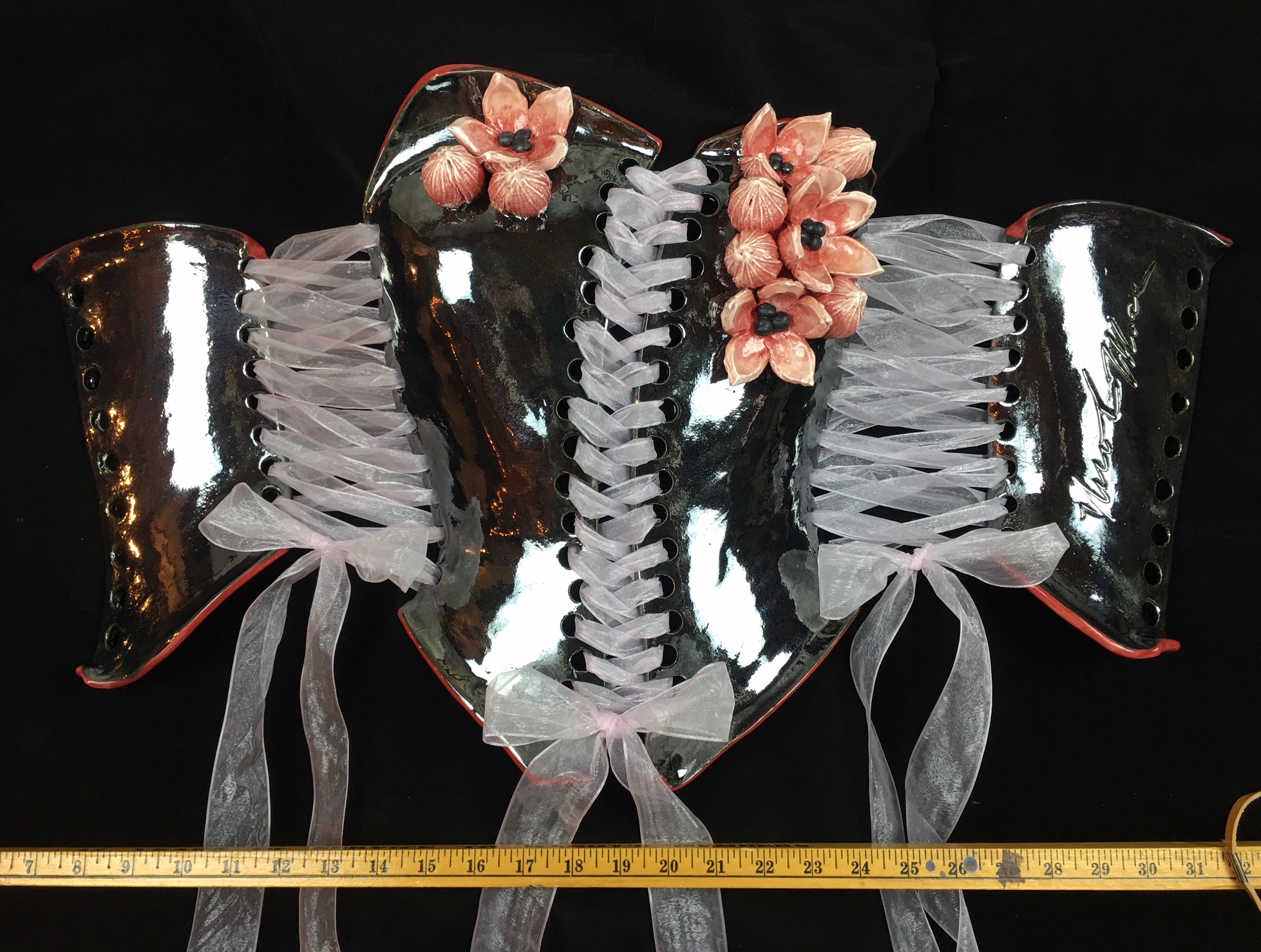 Nicole Moan Ceramic Corsets are all hand sculpted clay pieces, glazed with traditional pottery glazes. They can be worn or displayed as art.