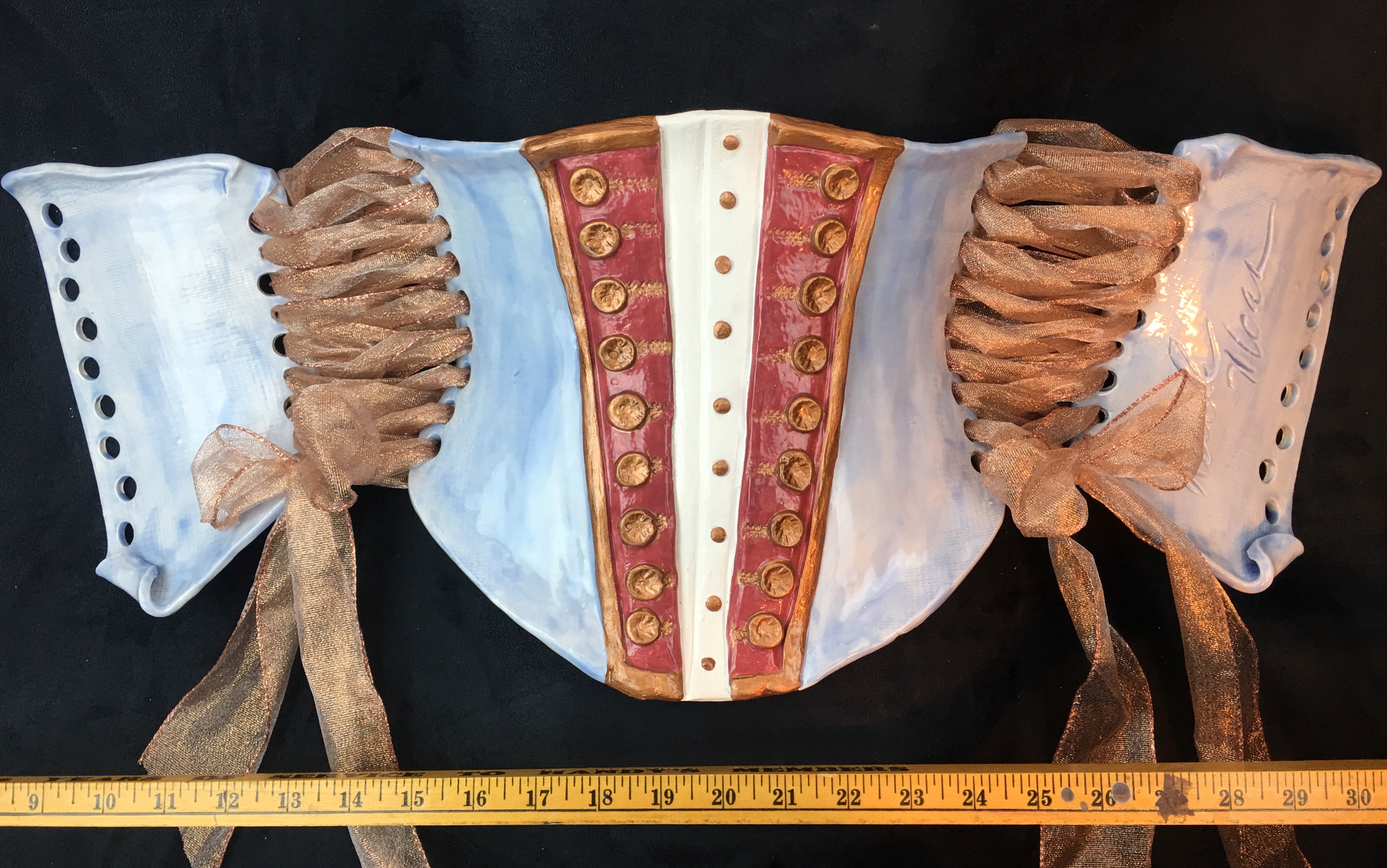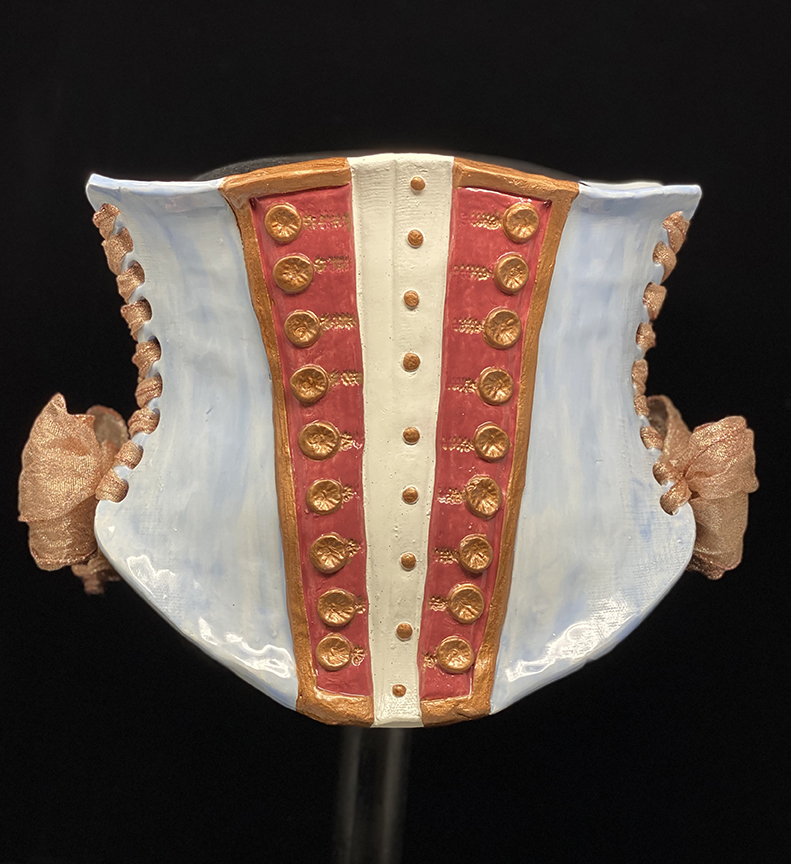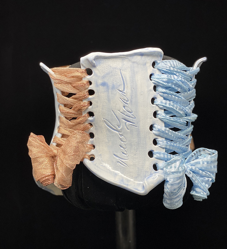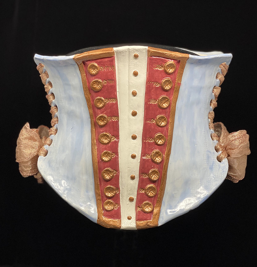 Nicole Moan Ceramic Corsets are all hand sculpted clay pieces, glazed with traditional pottery glazes. They can be worn or displayed as art.