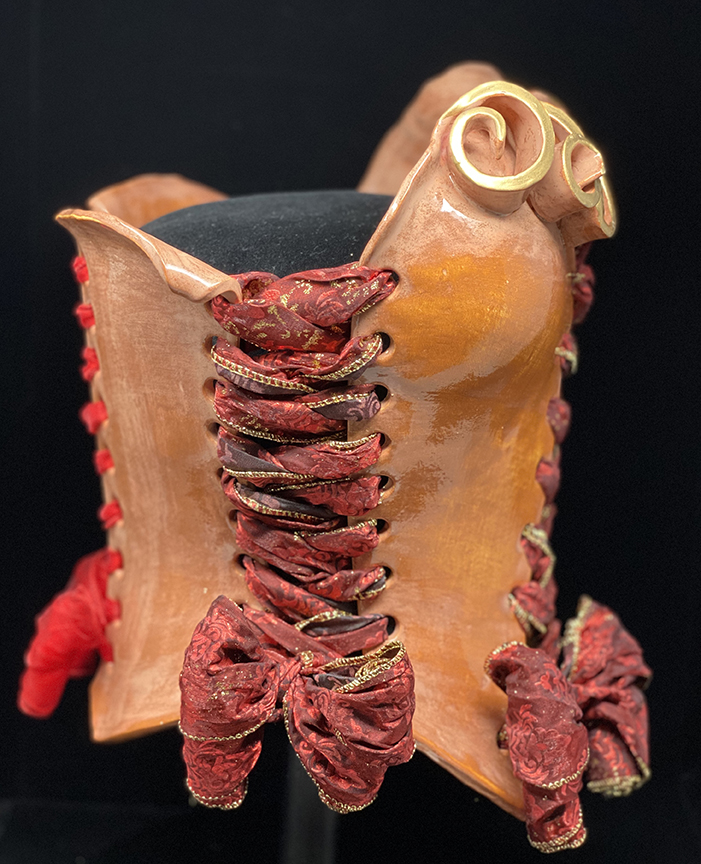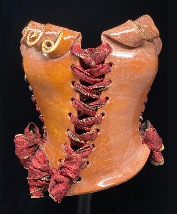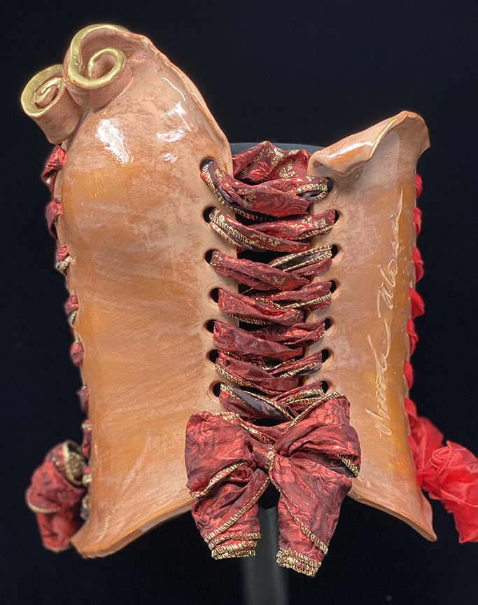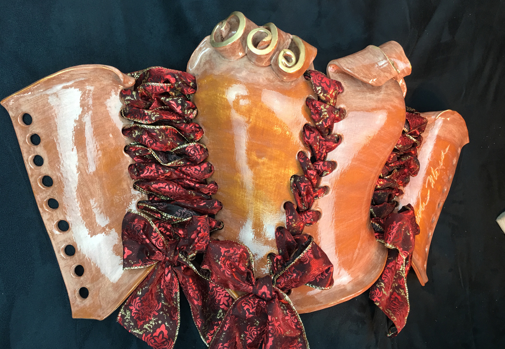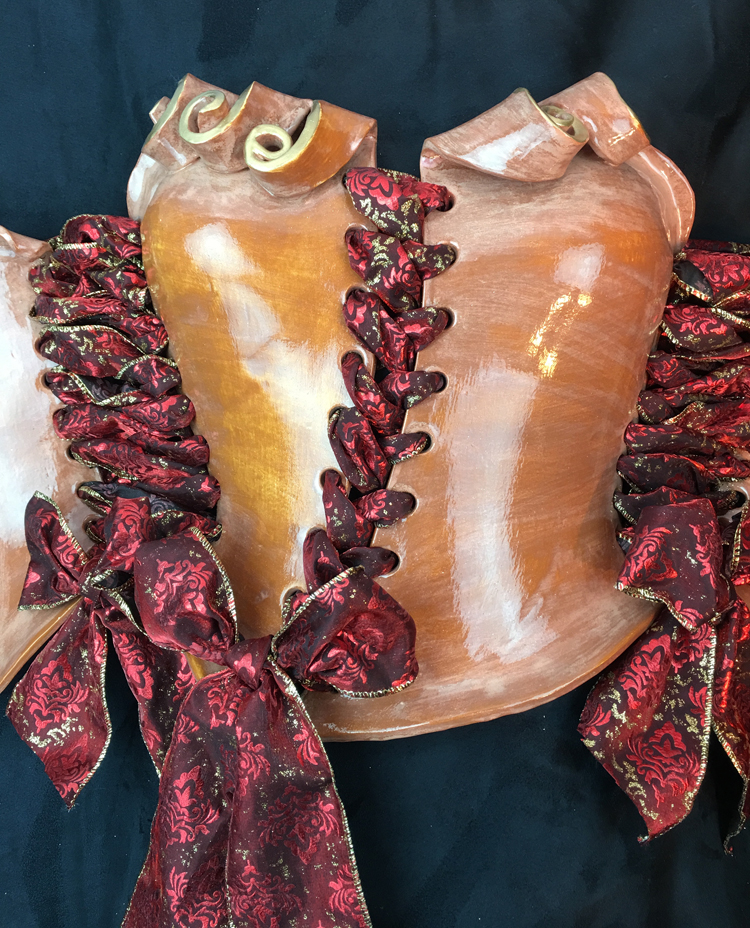 Nicole Moan Ceramic Corsets are all hand sculpted clay pieces, glazed with traditional pottery glazes. They can be worn or displayed as art.