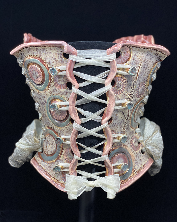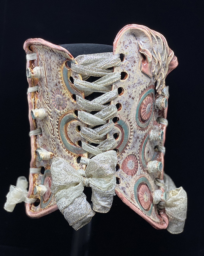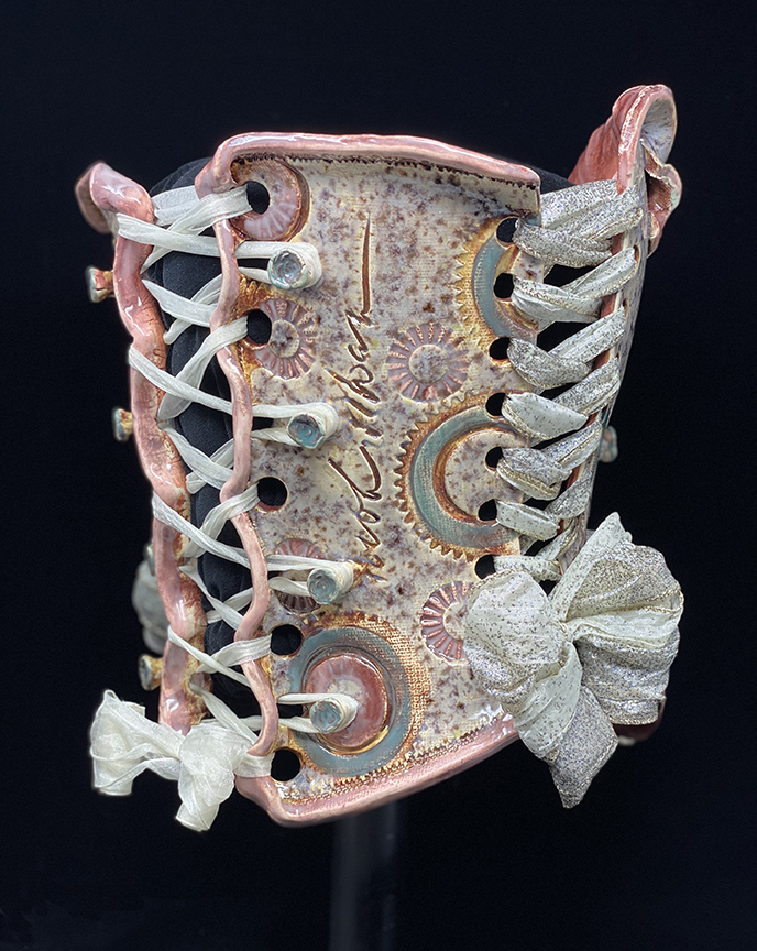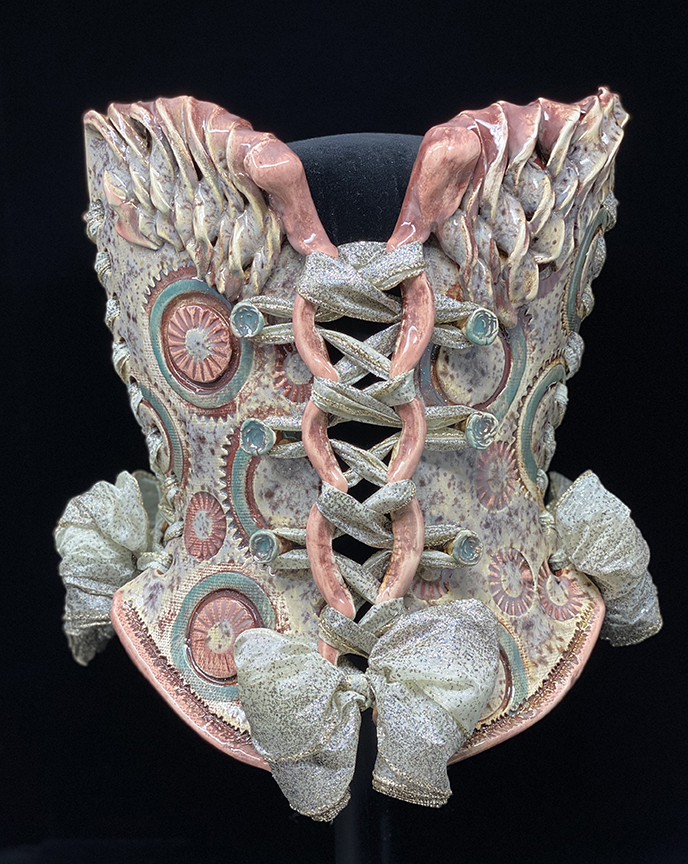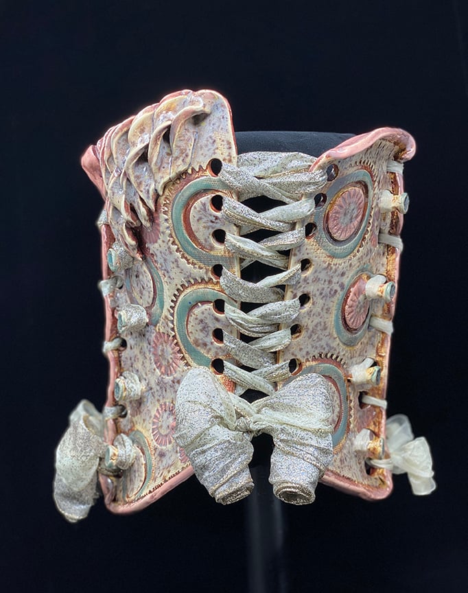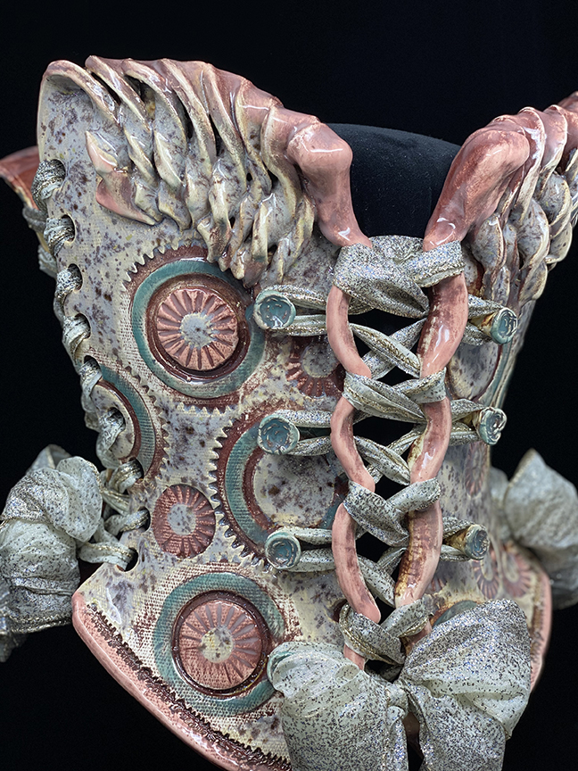 Nicole Moan Ceramic Corsets are all hand sculpted clay pieces, glazed with traditional pottery glazes. They can be worn or displayed as art.