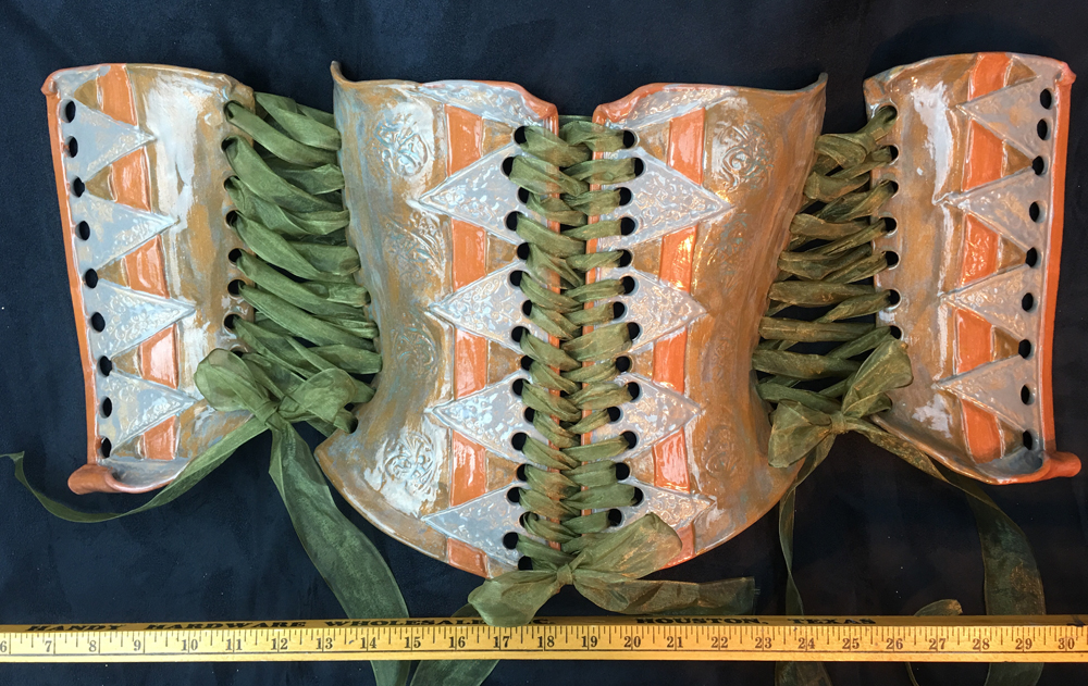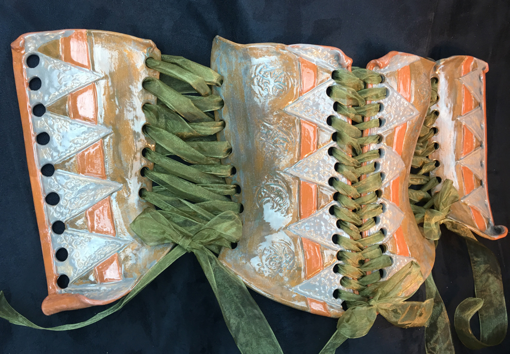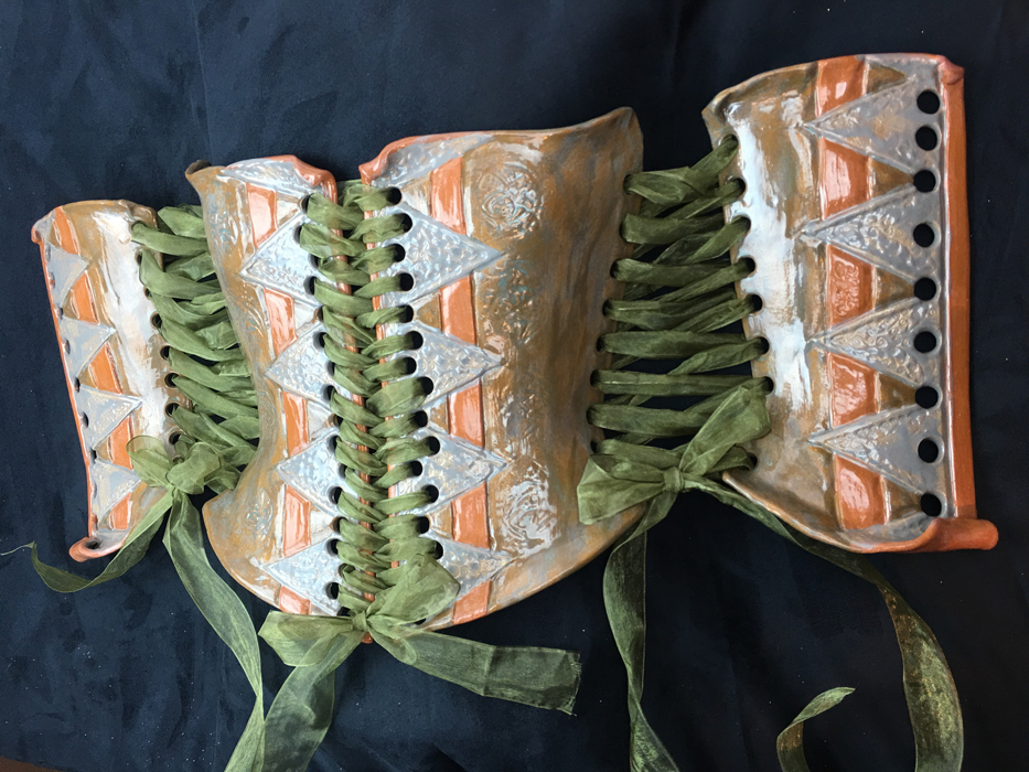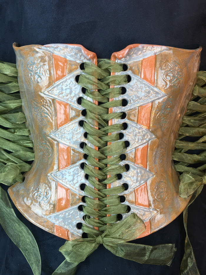 Nicole Moan Ceramic Corsets are all hand sculpted clay pieces, glazed with traditional pottery glazes. They can be worn or displayed as art.