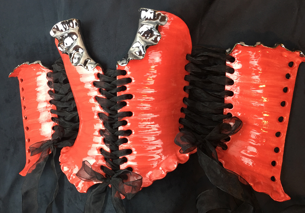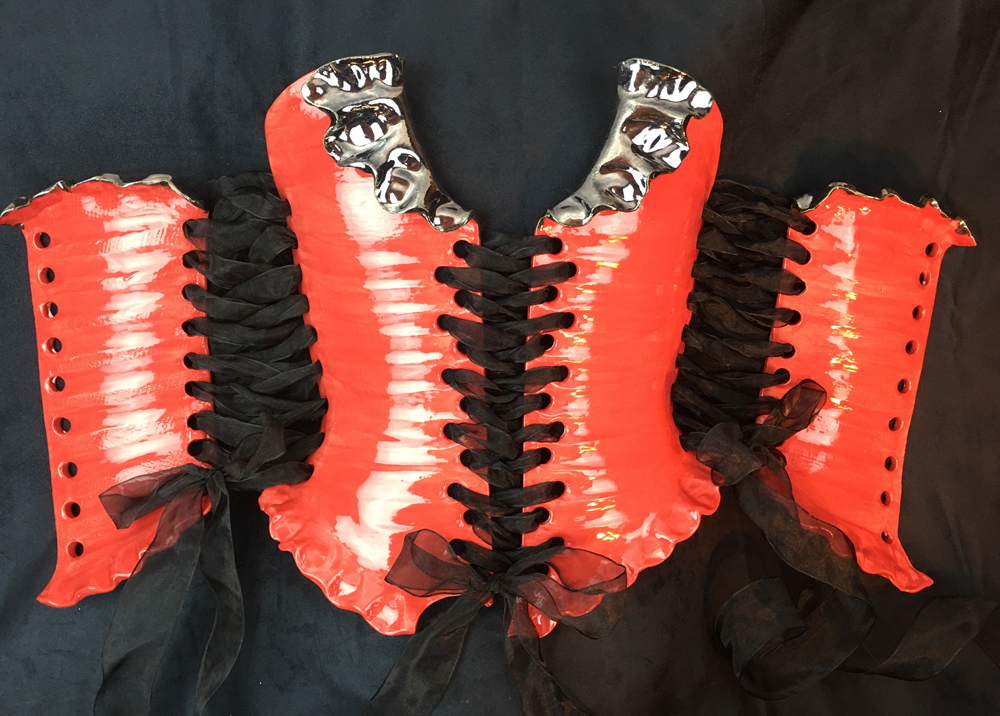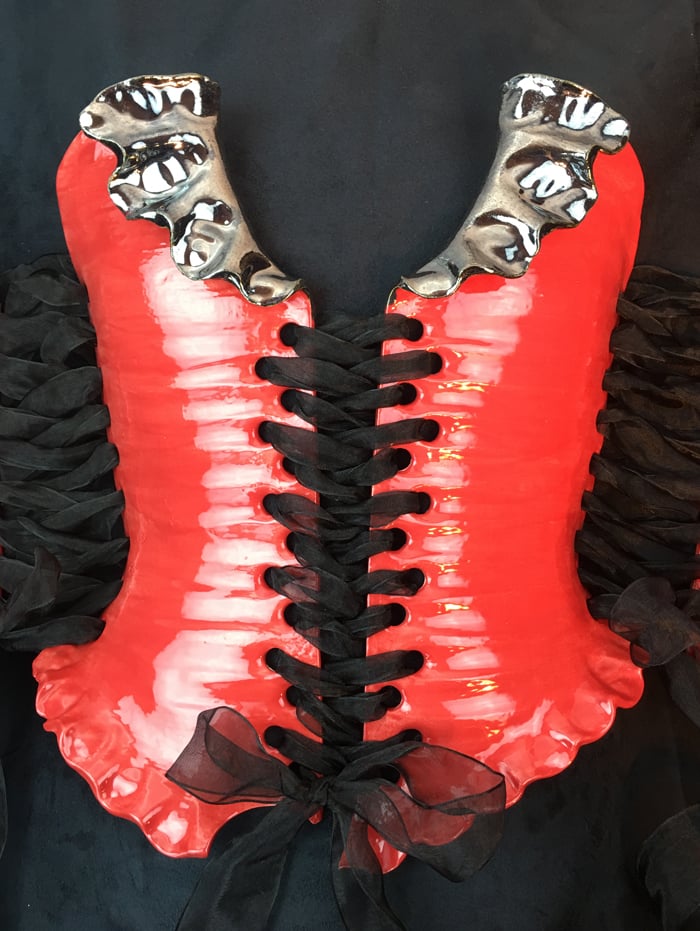 Nicole Moan Ceramic Corsets are all hand sculpted clay pieces, glazed with traditional pottery glazes. They can be worn or displayed as art.