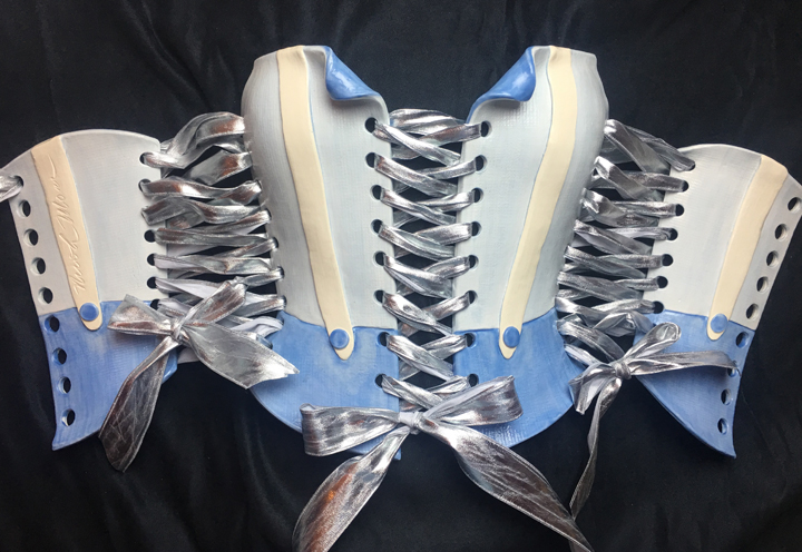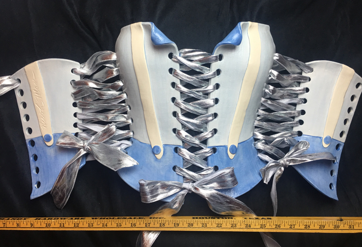 Nicole Moan Ceramic Corsets are all hand sculpted clay pieces, glazed with traditional pottery glazes. They are made to be worn or displayed as art. Each Piece is one of a kind.