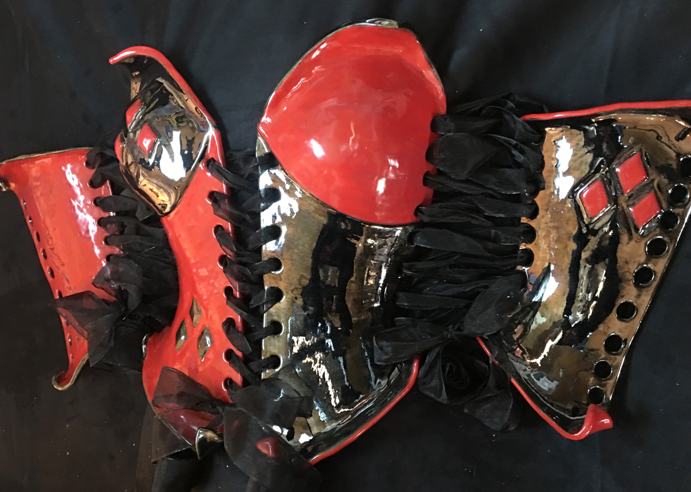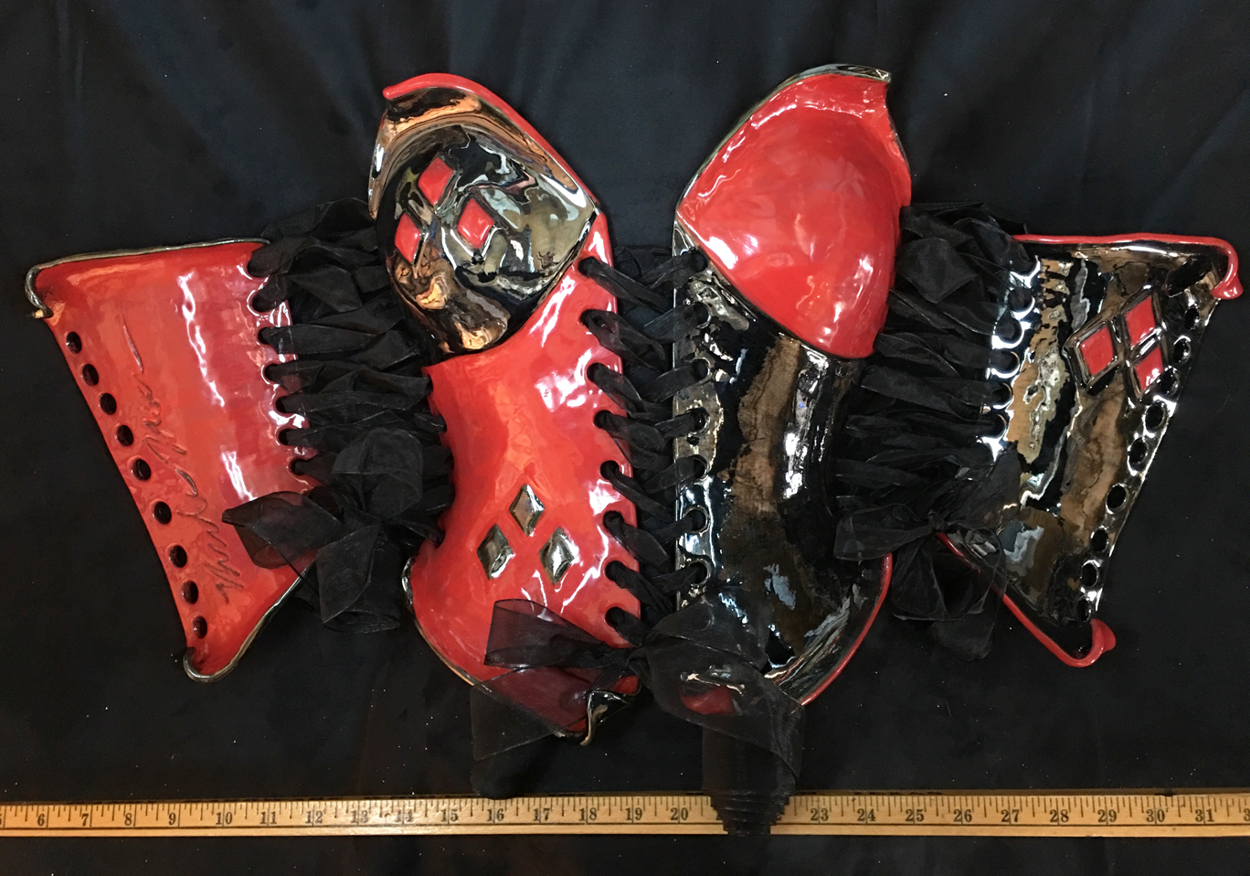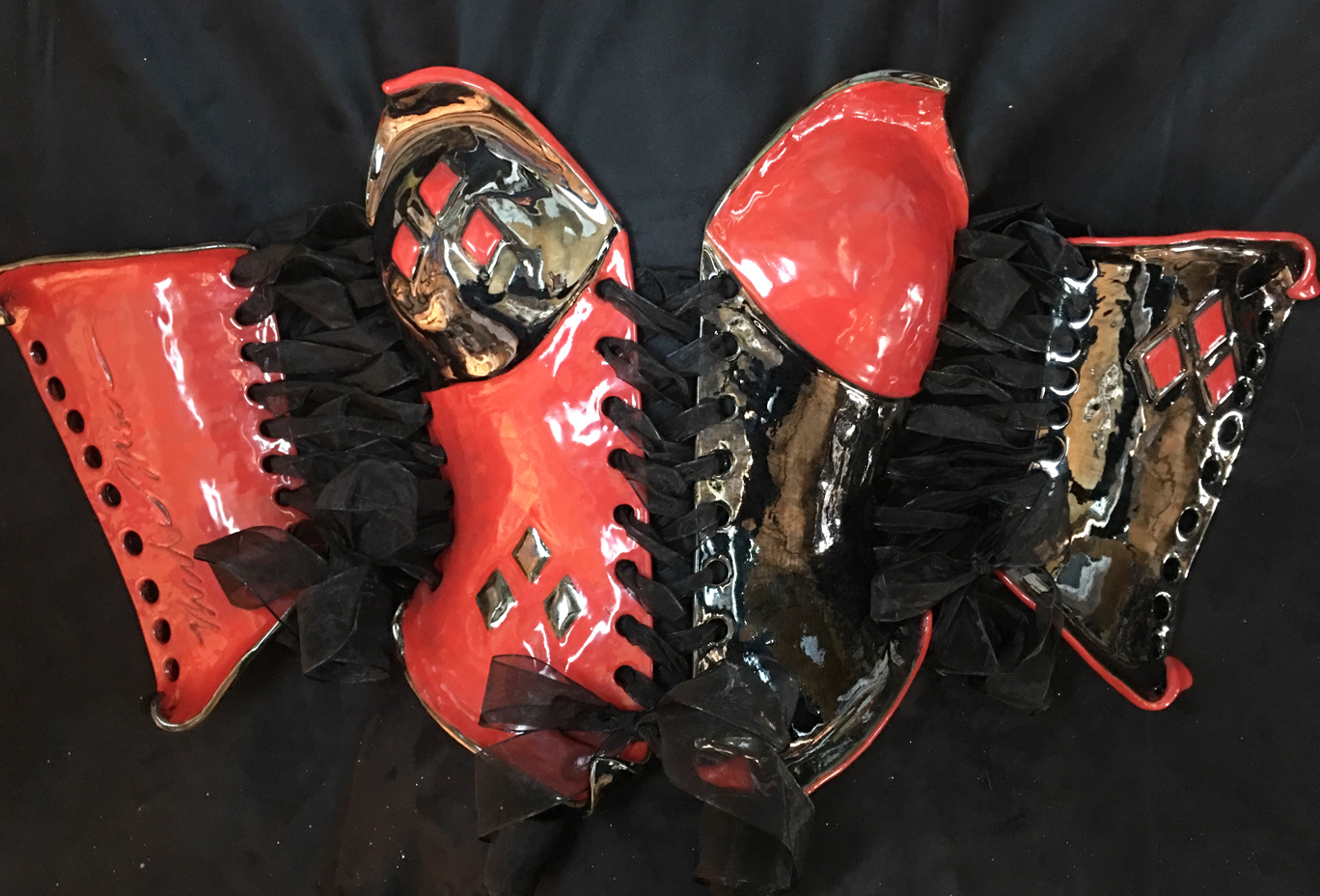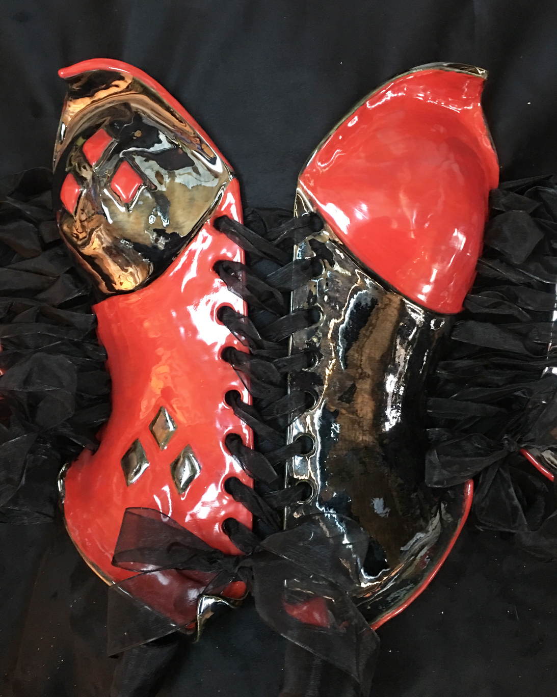 Nicole Moan Ceramic Corsets are all hand sculpted clay pieces, glazed with traditional pottery glazes. They are made to be worn or displayed as art. She creates custom pieces as well.