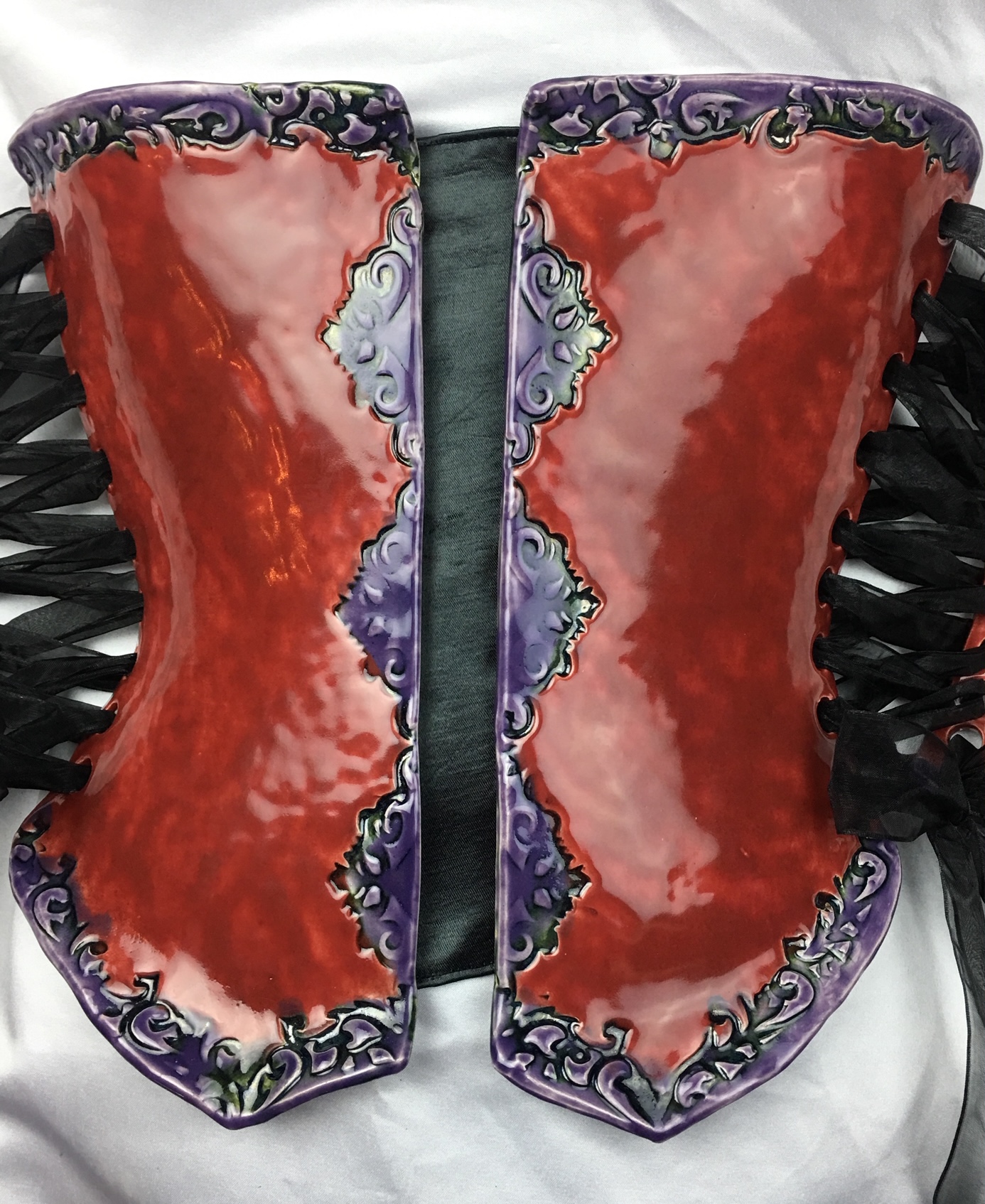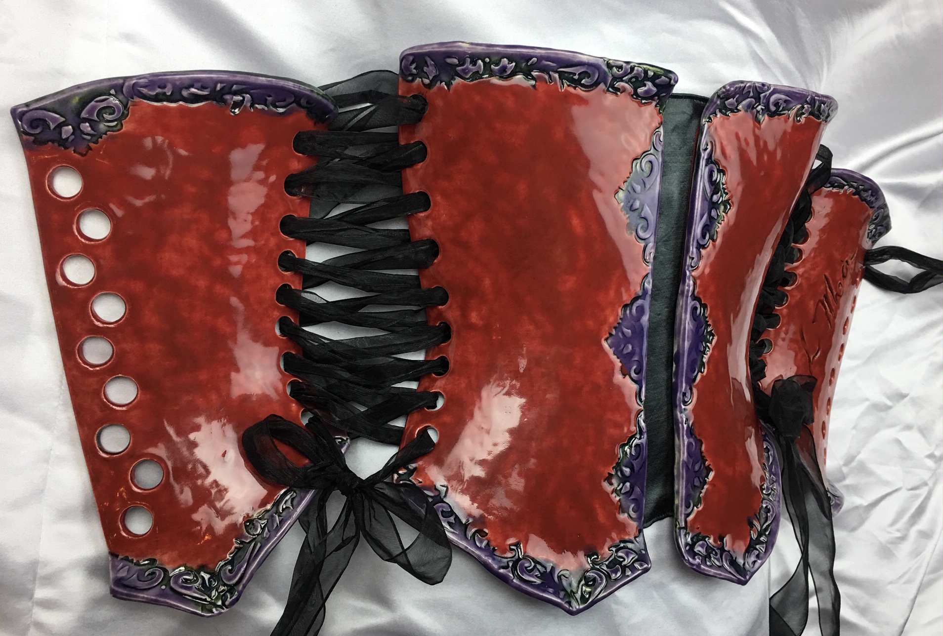 Nicole Moan Ceramic Corsets are all hand sculpted clay pieces, glazed with traditional pottery glazes. They are made to be worn or displayed as art. She creates custom pieces as well.