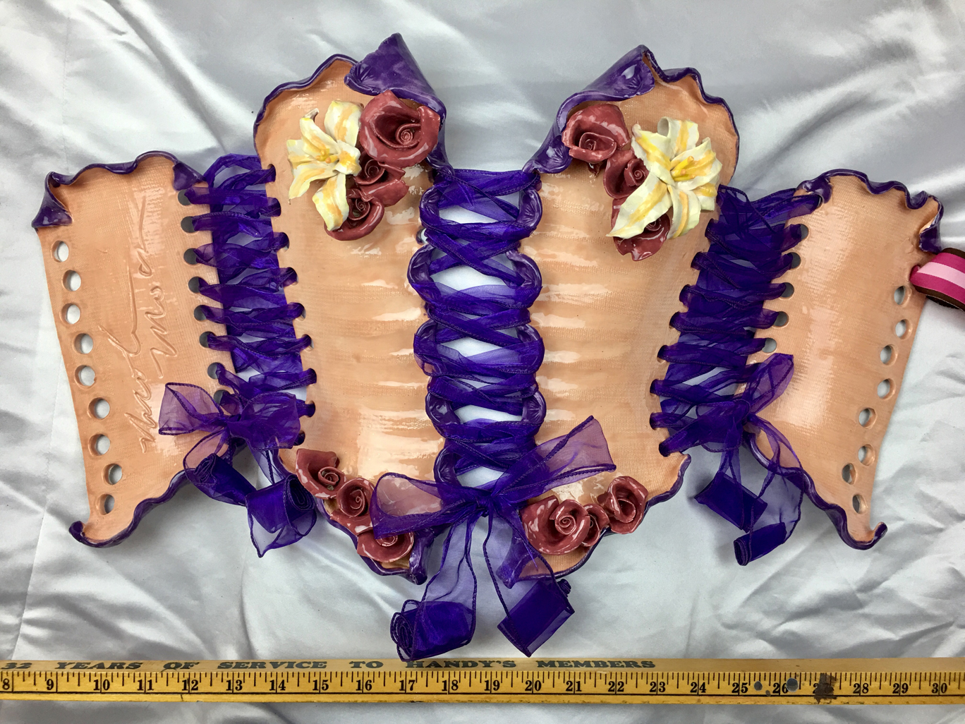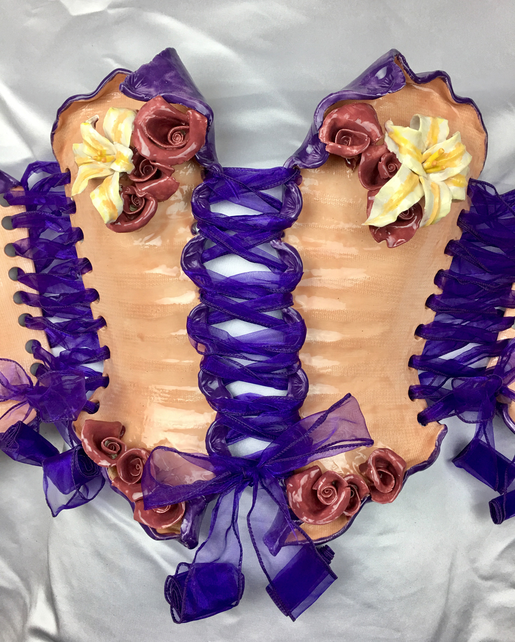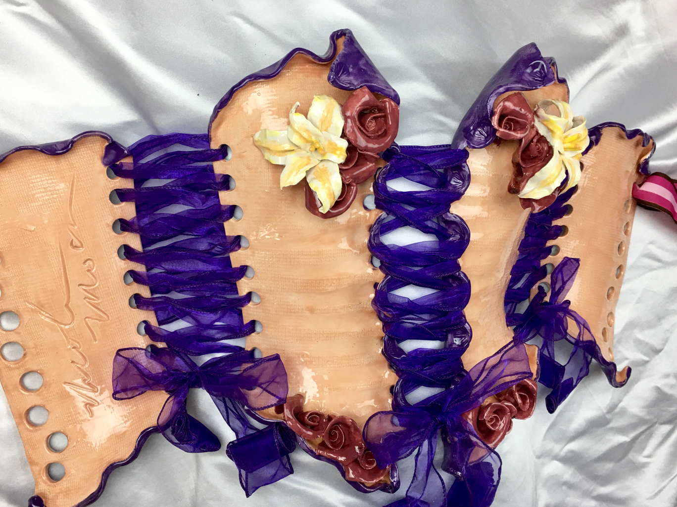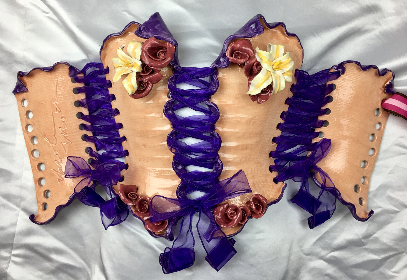 4 piece clay ceramic glazed corset with hand sculpted roses and Lilies