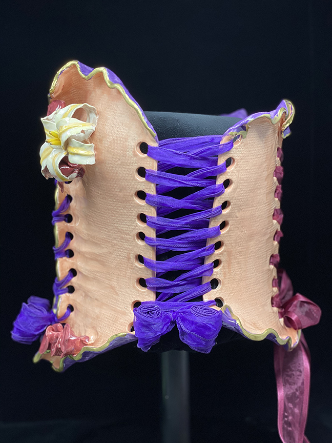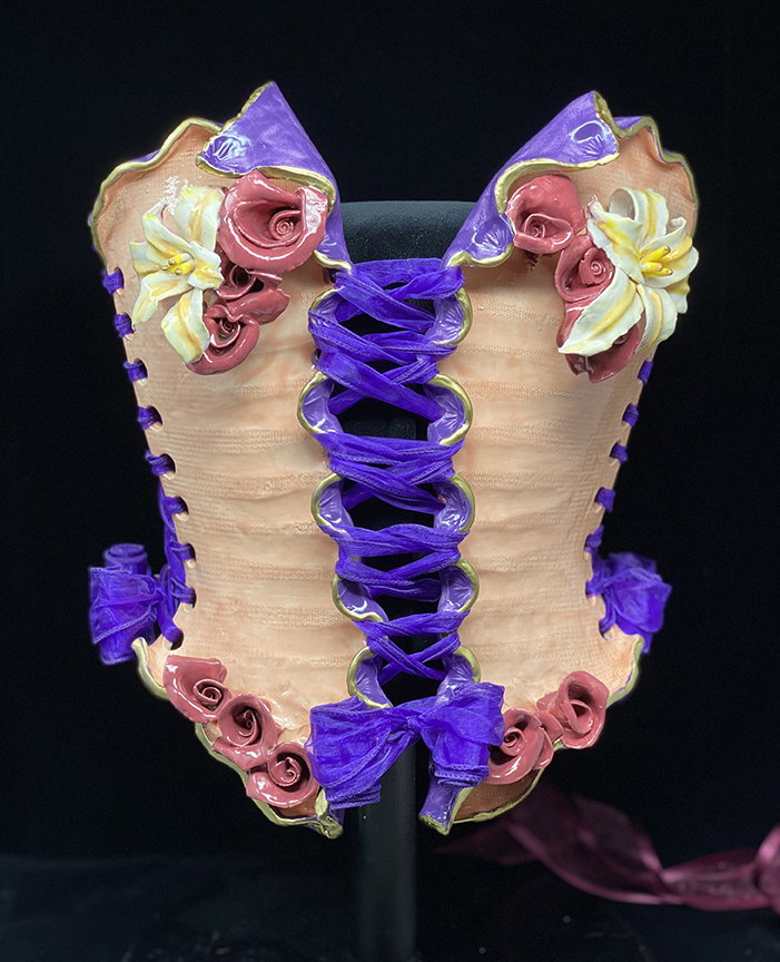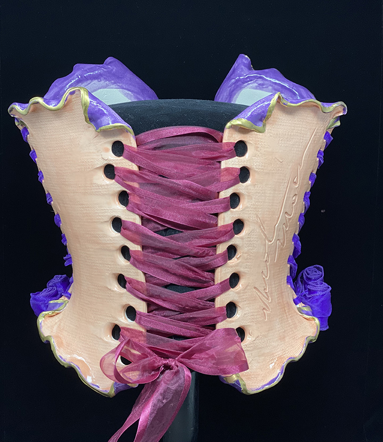 Nicole Moan Ceramic Corsets are all hand sculpted clay pieces, glazed with traditional pottery glazes. They are made to be worn or displayed as art. She creates custom pieces as well.