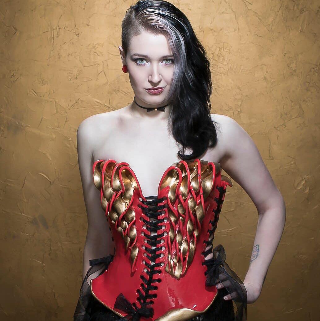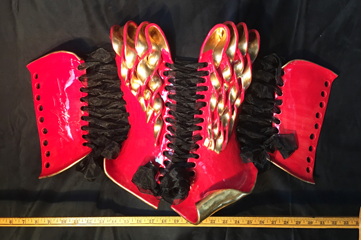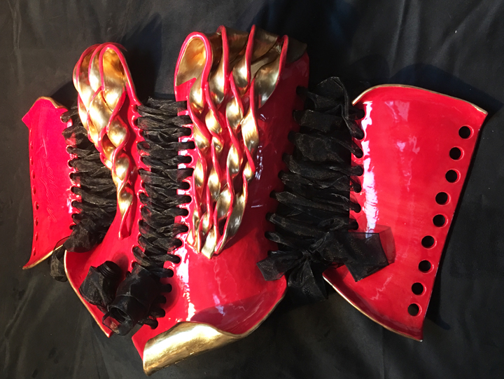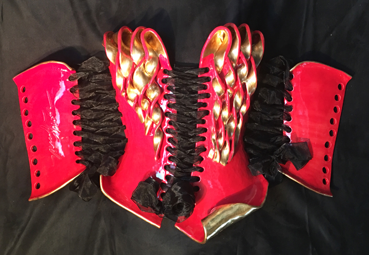 Nicole Moan Ceramic Corsets are all hand sculpted clay pieces, glazed with traditional pottery glazes. They are made to be worn or displayed as art. She creates custom pieces as well.