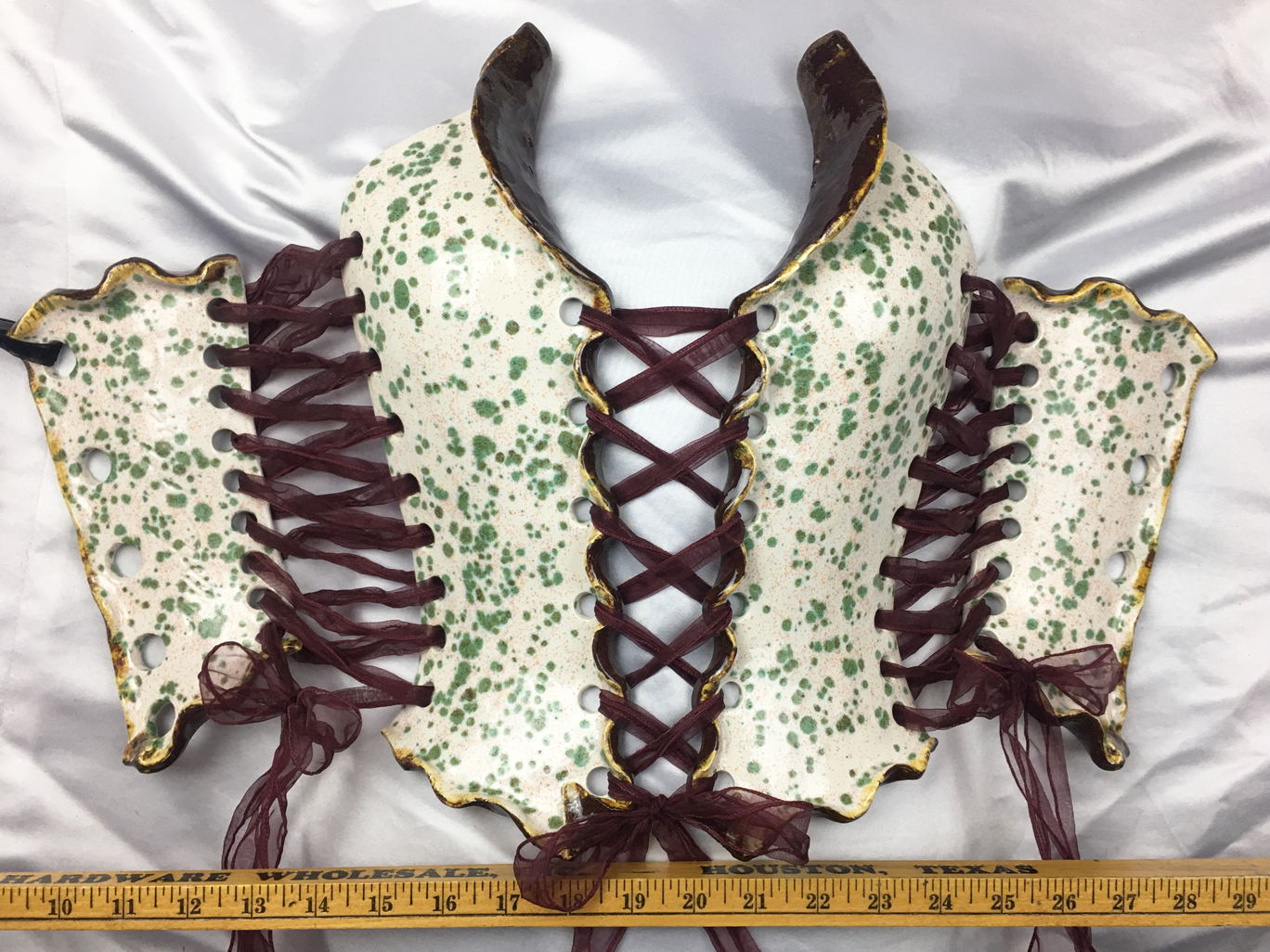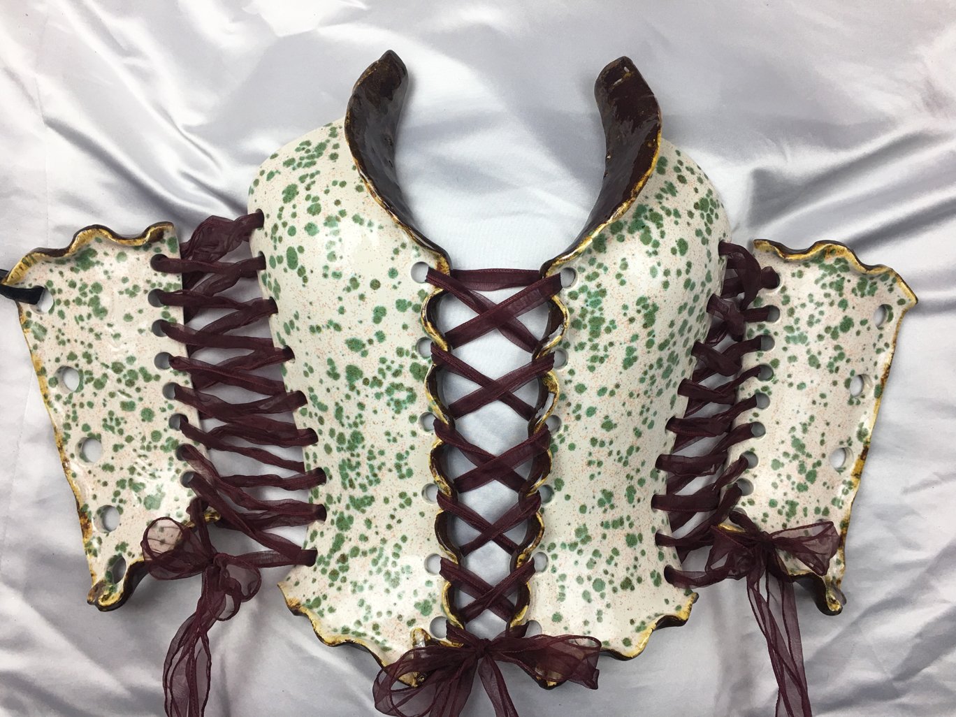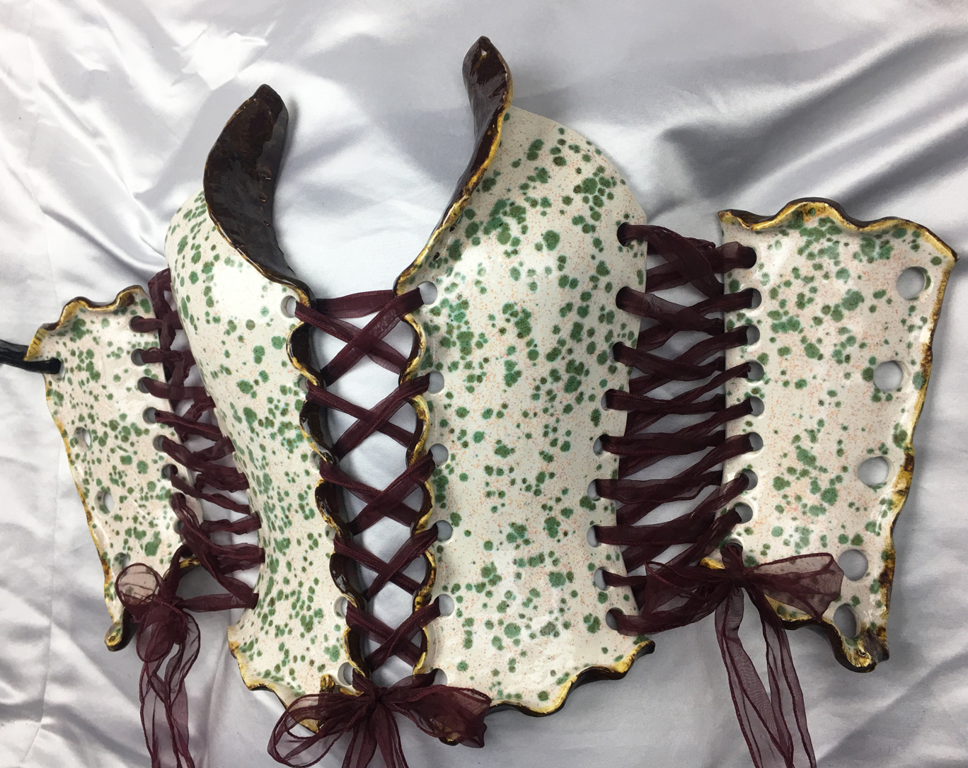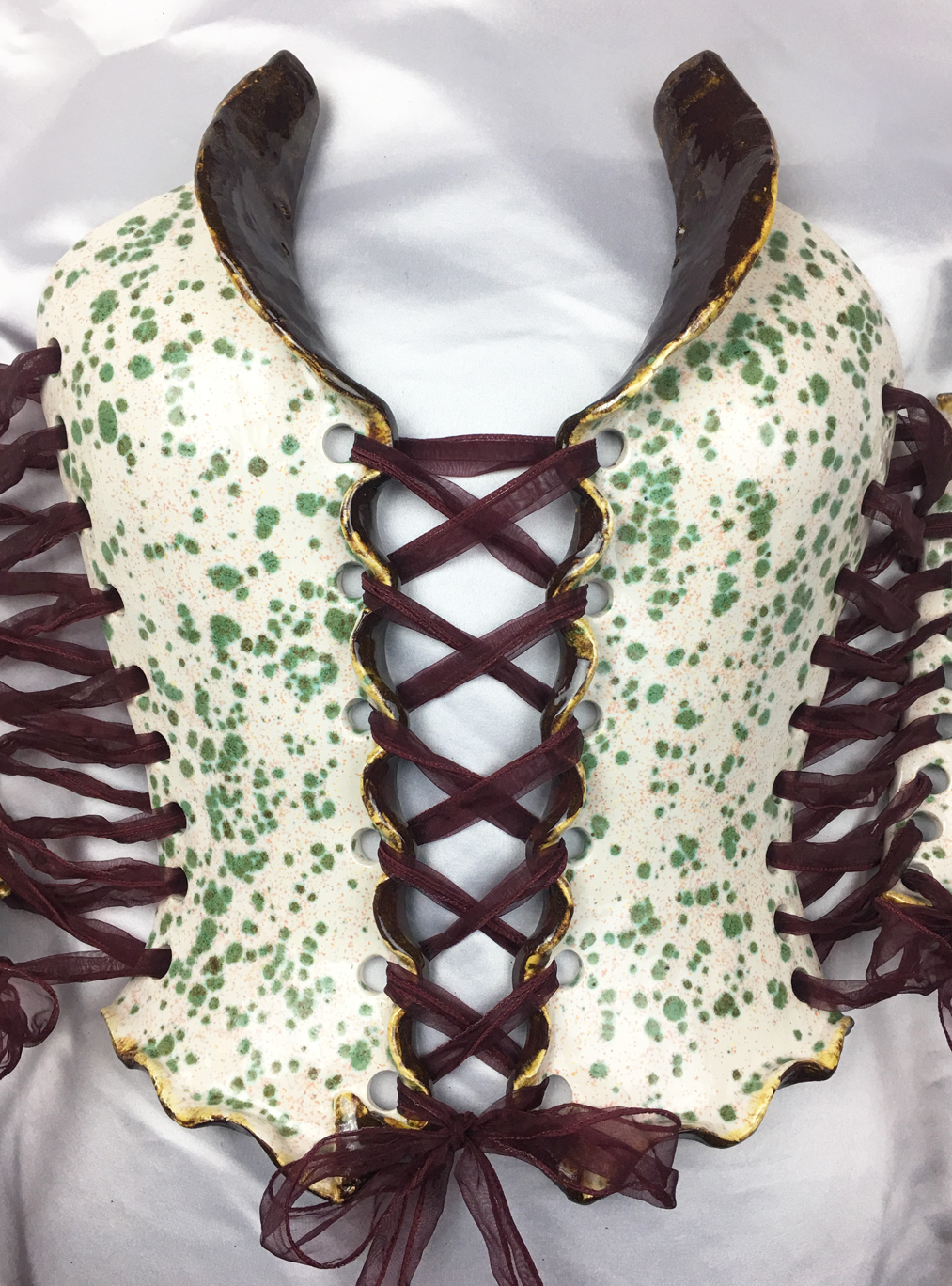 Nicole Moan Ceramic Corsets are all hand sculpted clay pieces, glazed with traditional pottery glazes. They are made to be worn or displayed as art. She creates custom pieces as well.