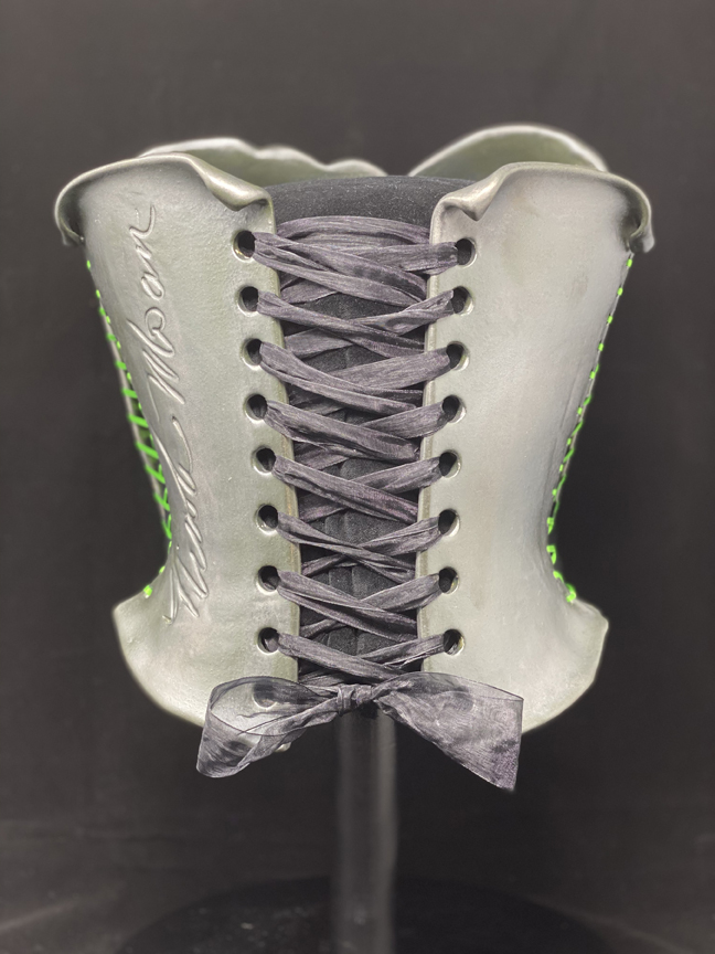 Nicole Moan Ceramic Corsets are all hand sculpted clay pieces, glazed with traditional pottery glazes. They are made to be worn or displayed as art.