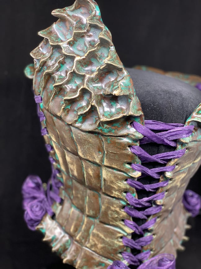 Nicole Moan Ceramic Corsets are all hand sculpted clay pieces, glazed with traditional pottery glazes. They are made to be worn or displayed as art.