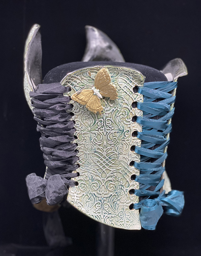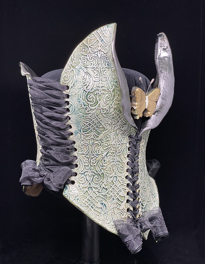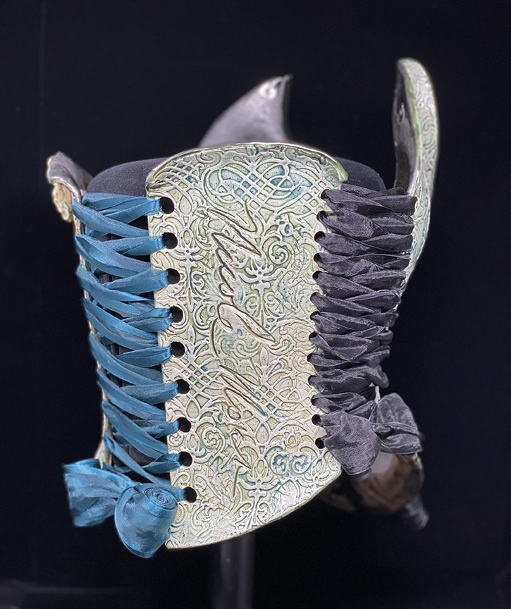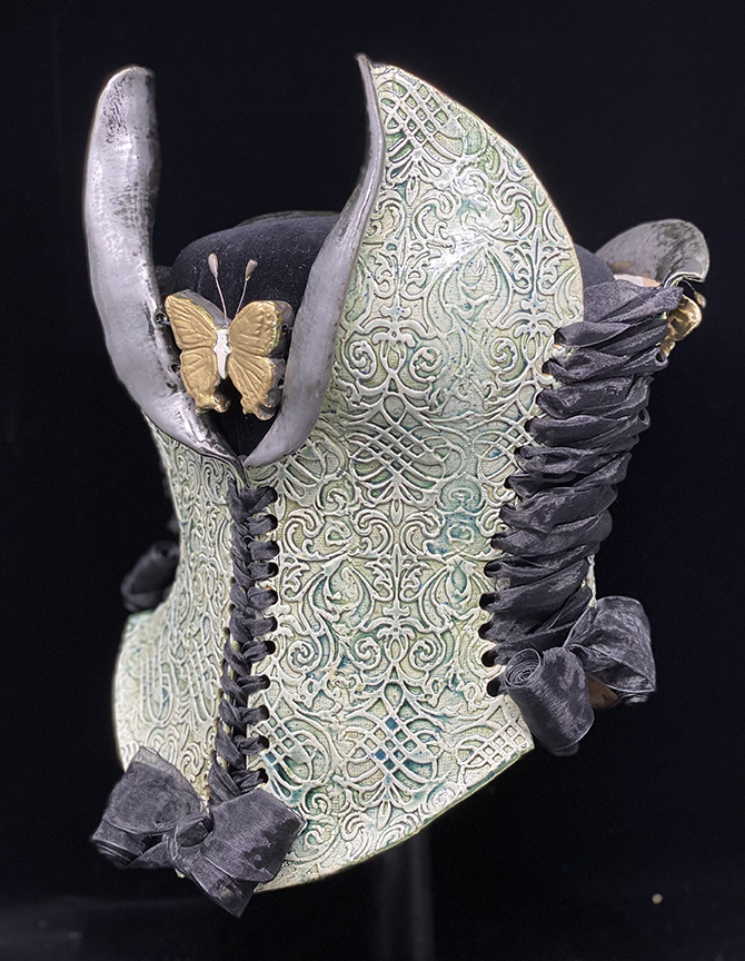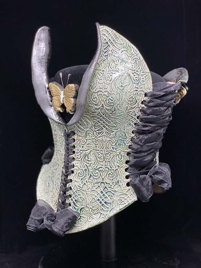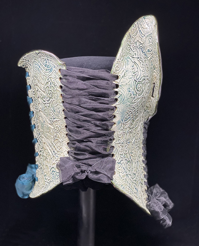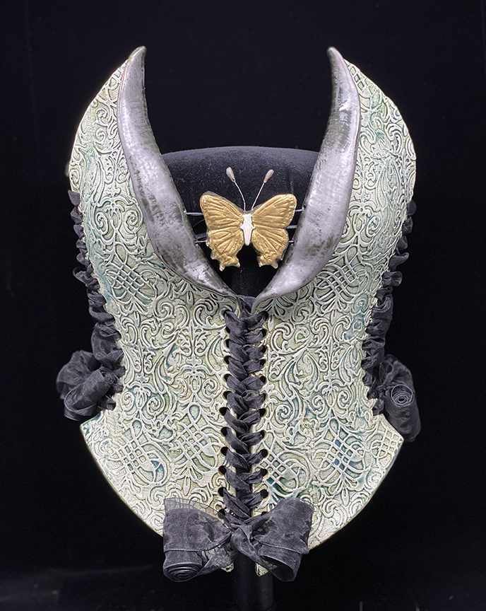 Nicole Moan Ceramic Corsets are all hand sculpted clay pieces, glazed with traditional pottery glazes. They are made to be worn or displayed as art.