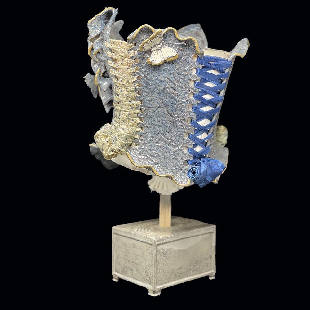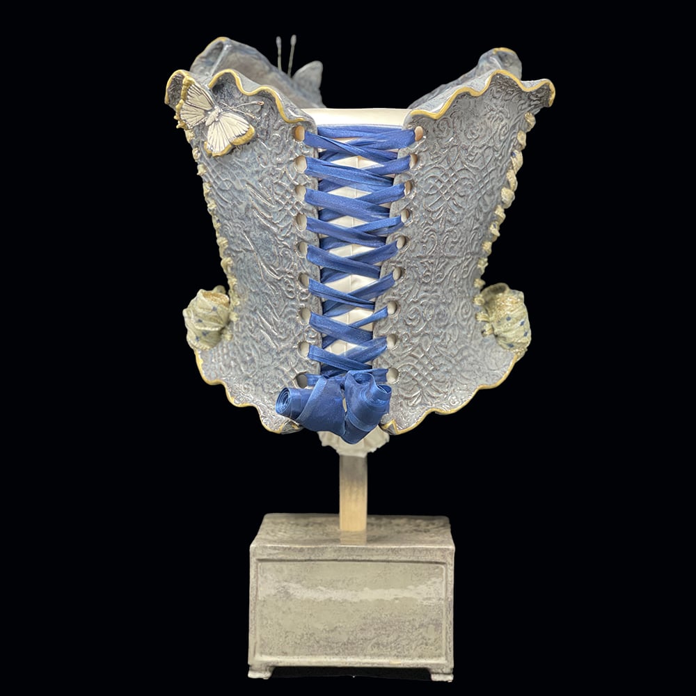 Nicole Moan Ceramic Corsets are all hand sculpted clay pieces, glazed with traditional pottery glazes. They are made to be worn or displayed as art.