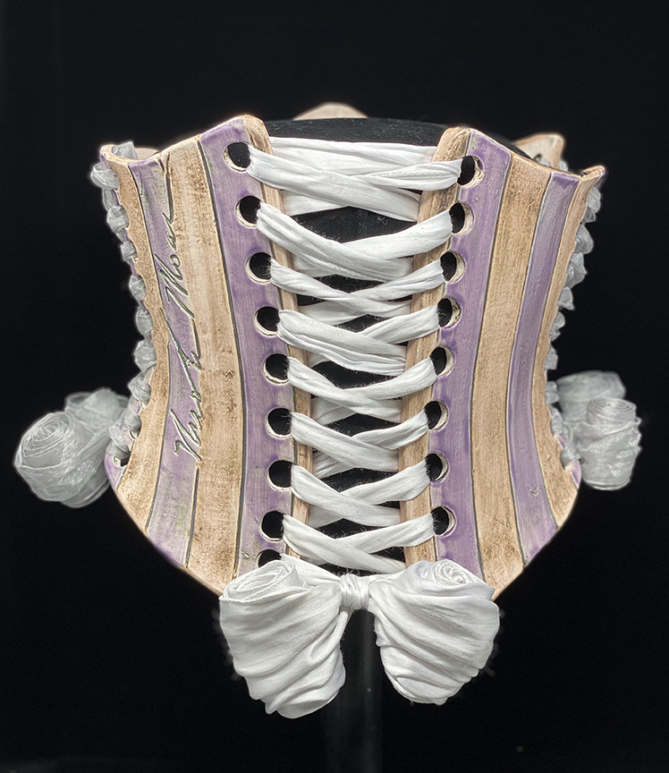 Nicole Moan Ceramic Corsets are all hand sculpted clay pieces, glazed with traditional pottery glazes. They are made to be worn or displayed as art.