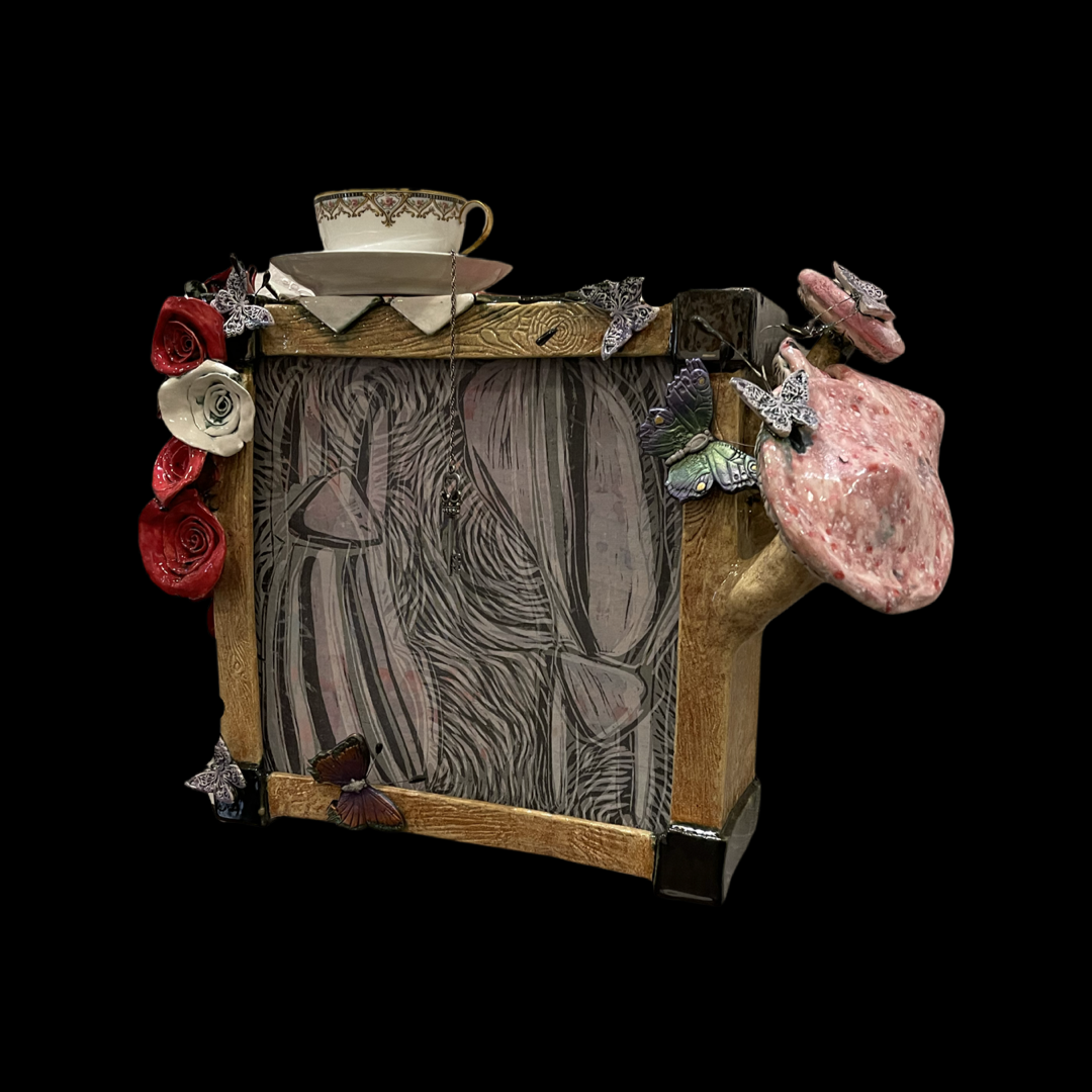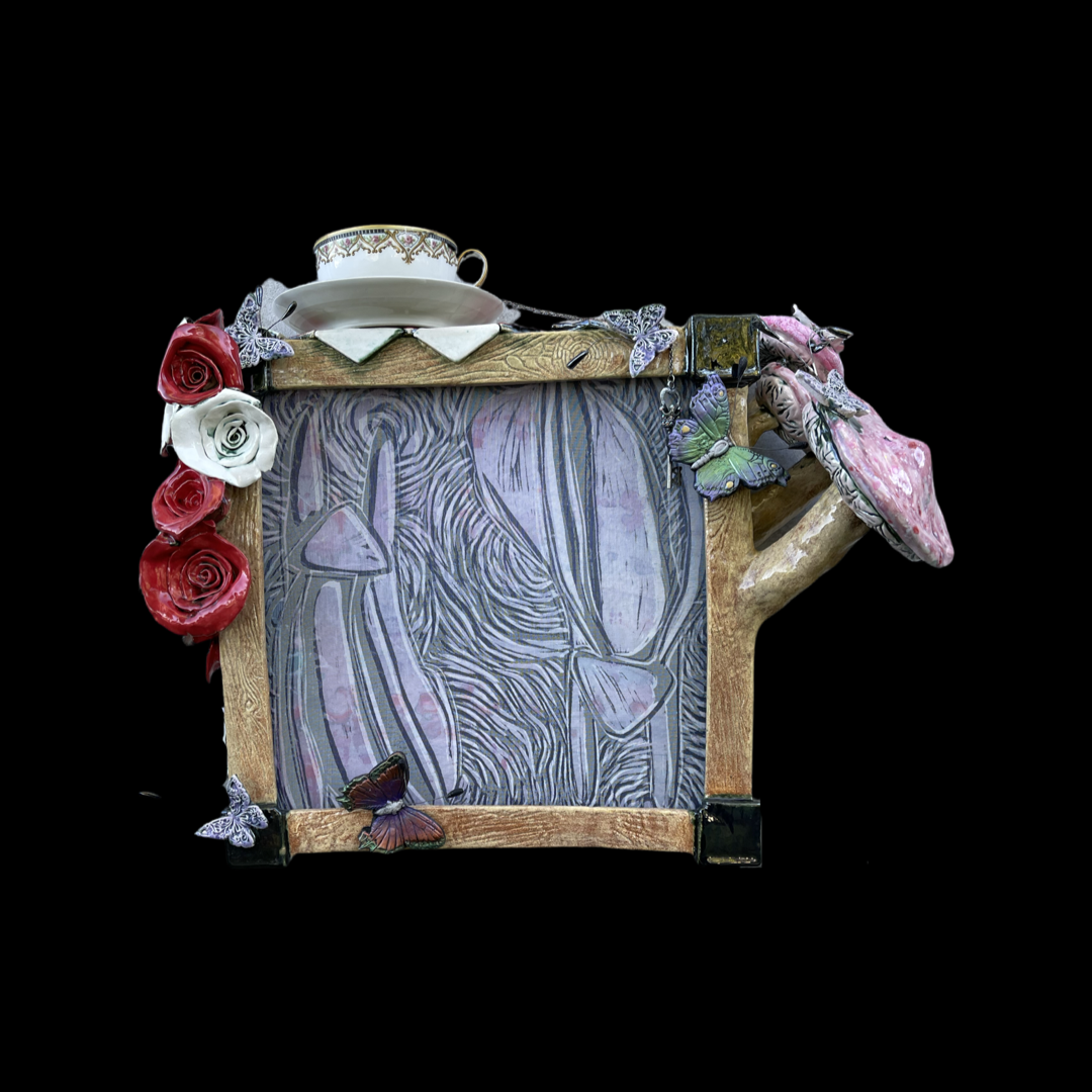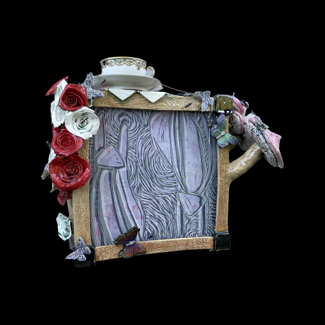 2 Rabbits image is 2 stacked layers of block printed chiffon fabric created by Aztrid Moan. frame is hand sculpted clay to represent a wood box, mushrooms, teacup and butterflies.