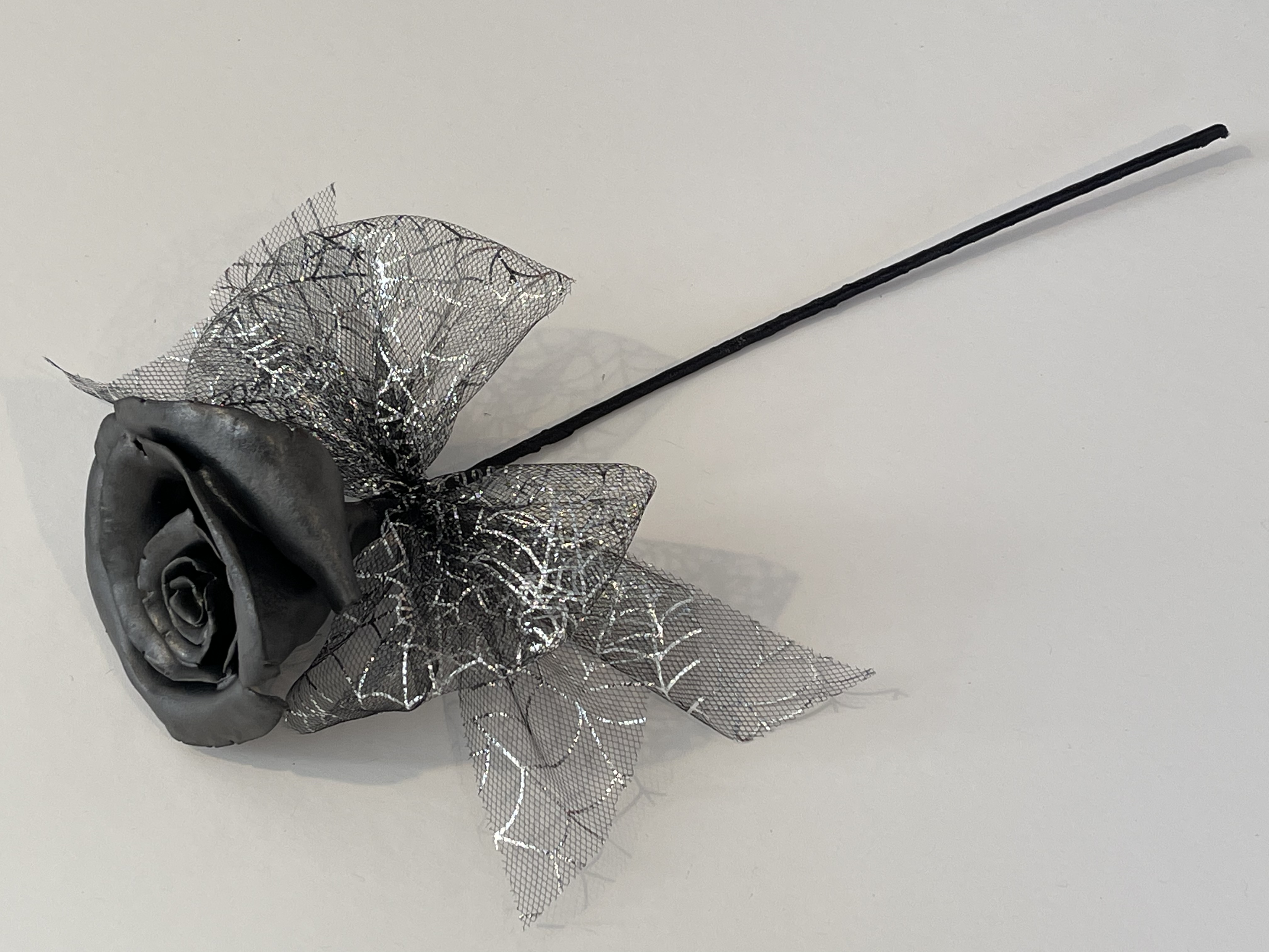 Hand sculpted porcelain rose glaze with a brushed steel black. Stem is wrapped with black ribbon. Bow is tulle and has the design of splattered spiderweb