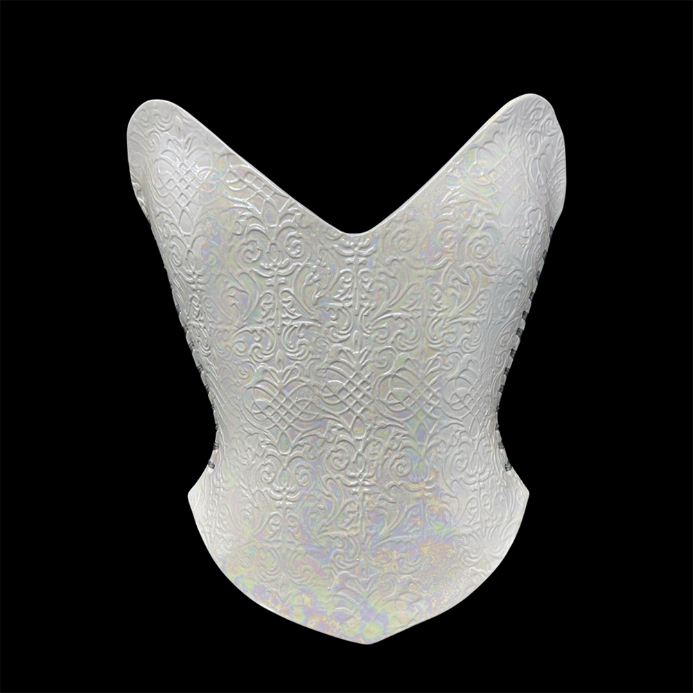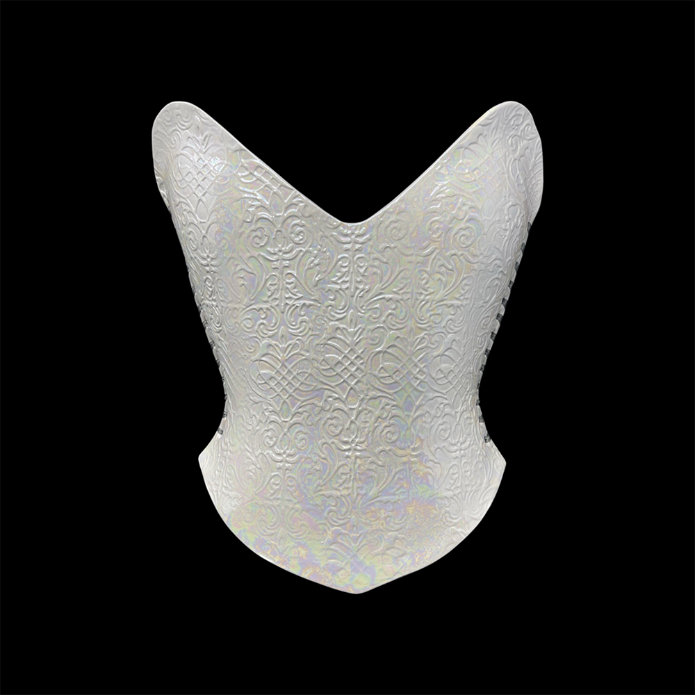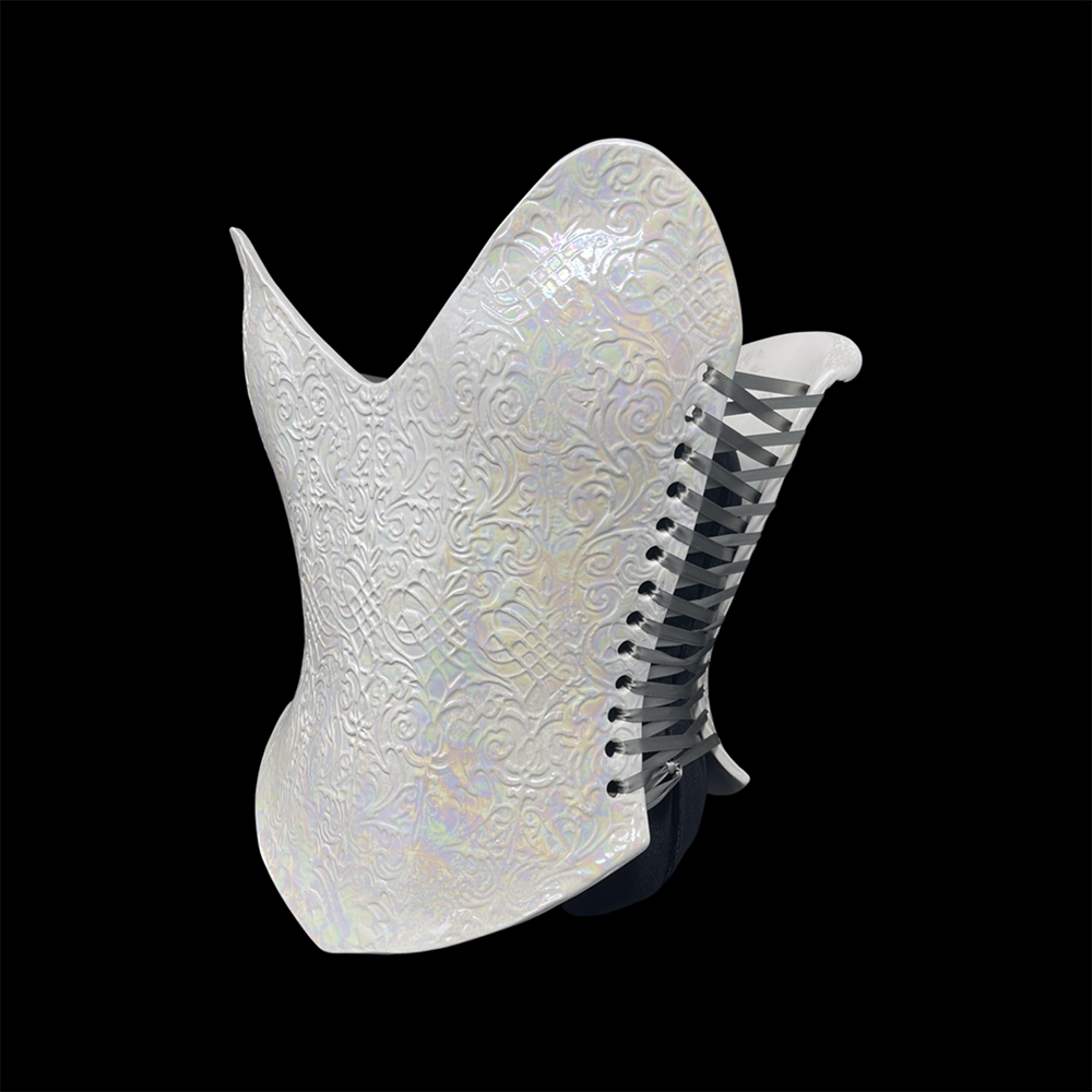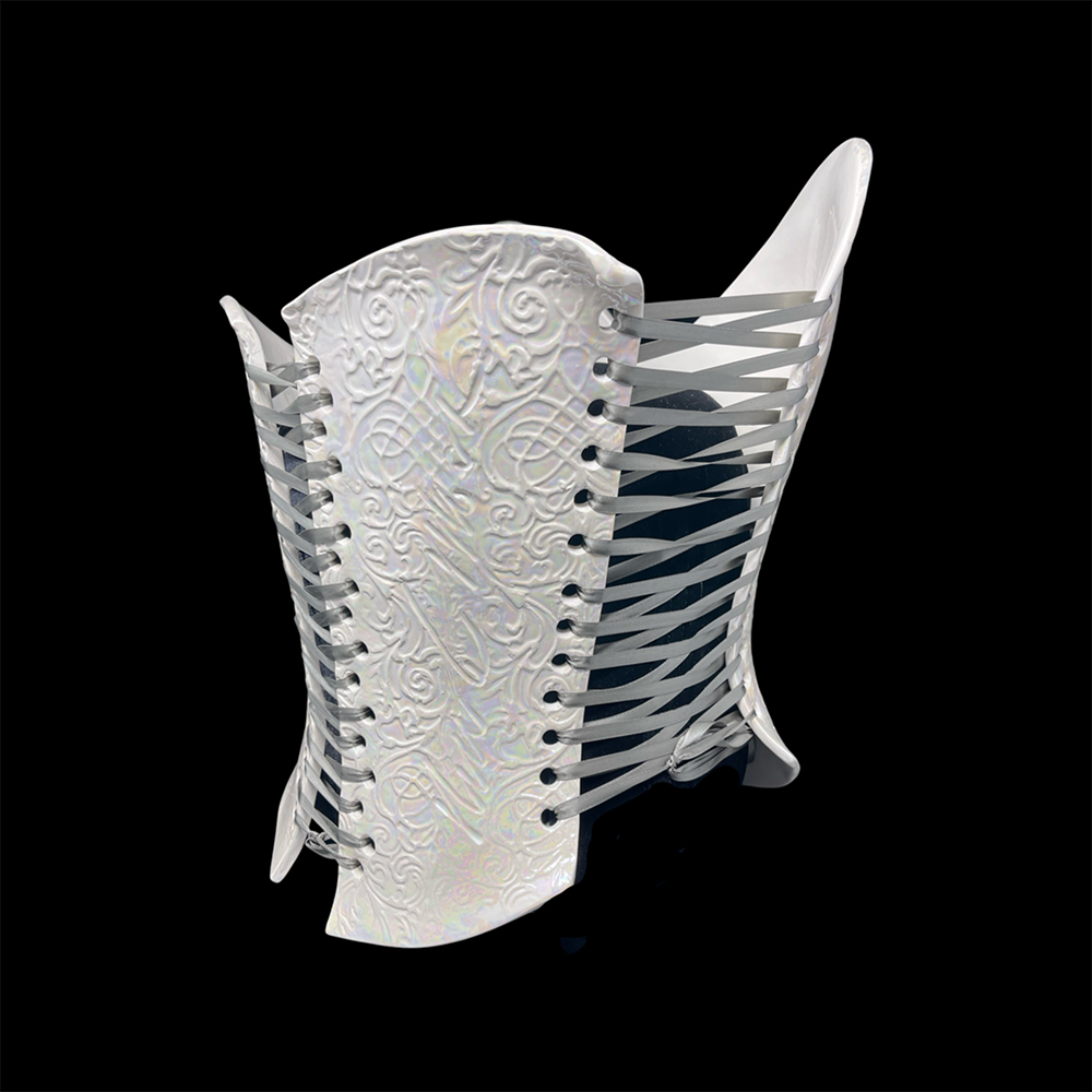 Gothic Damask Flocked Wallpaper series wearable ceramic corset by Nicole Moan