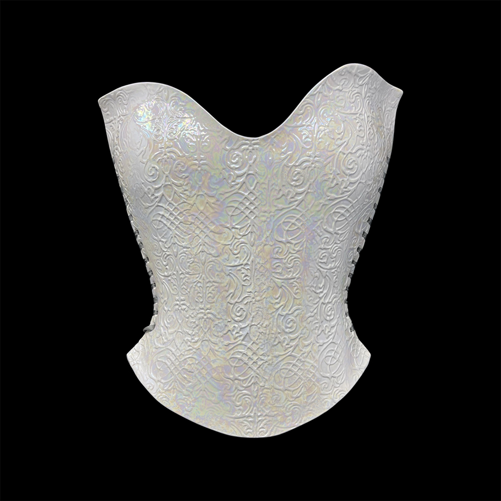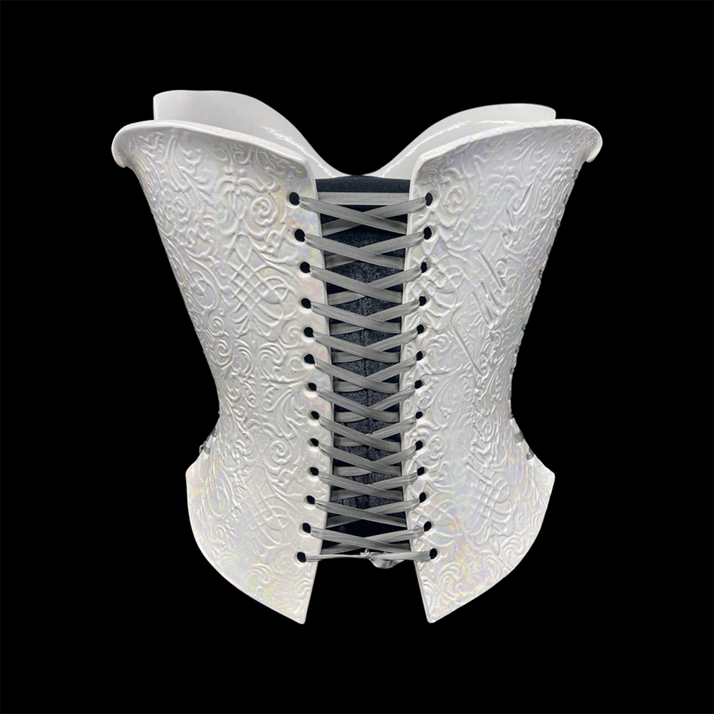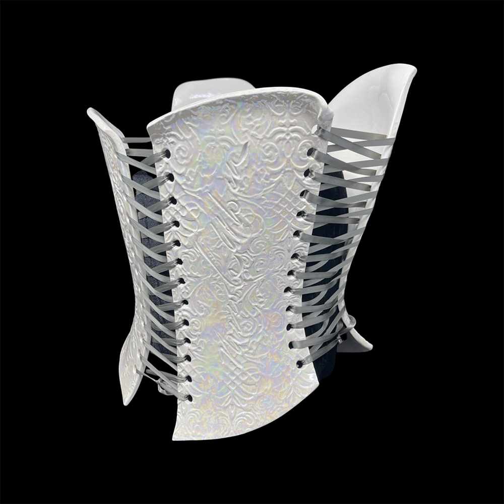 Antonia Flocked Wallpaper series wearable ceramic corset by Nicole Moan