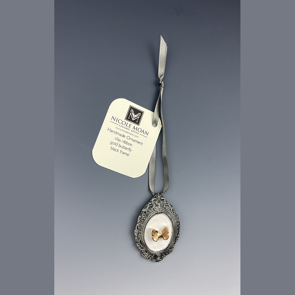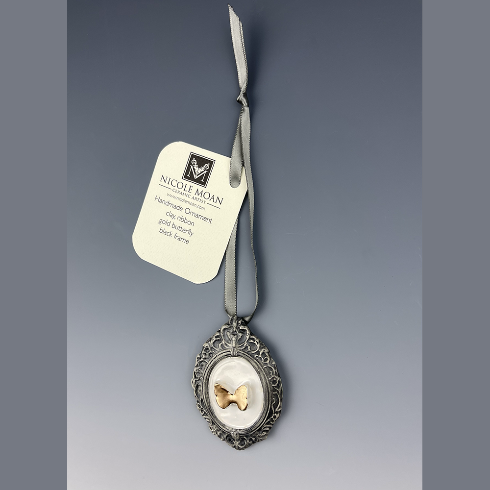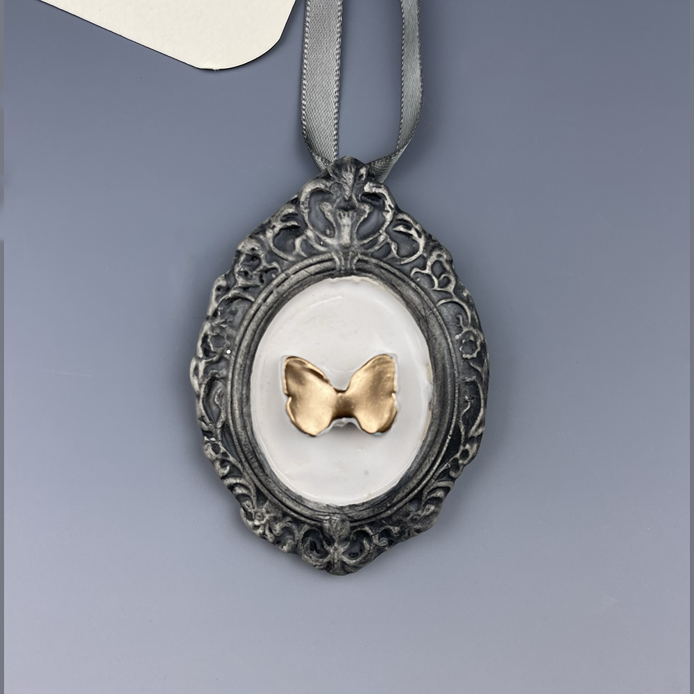 Hand sculpted clay Ornament with hand painted small gold butterfly with black frame