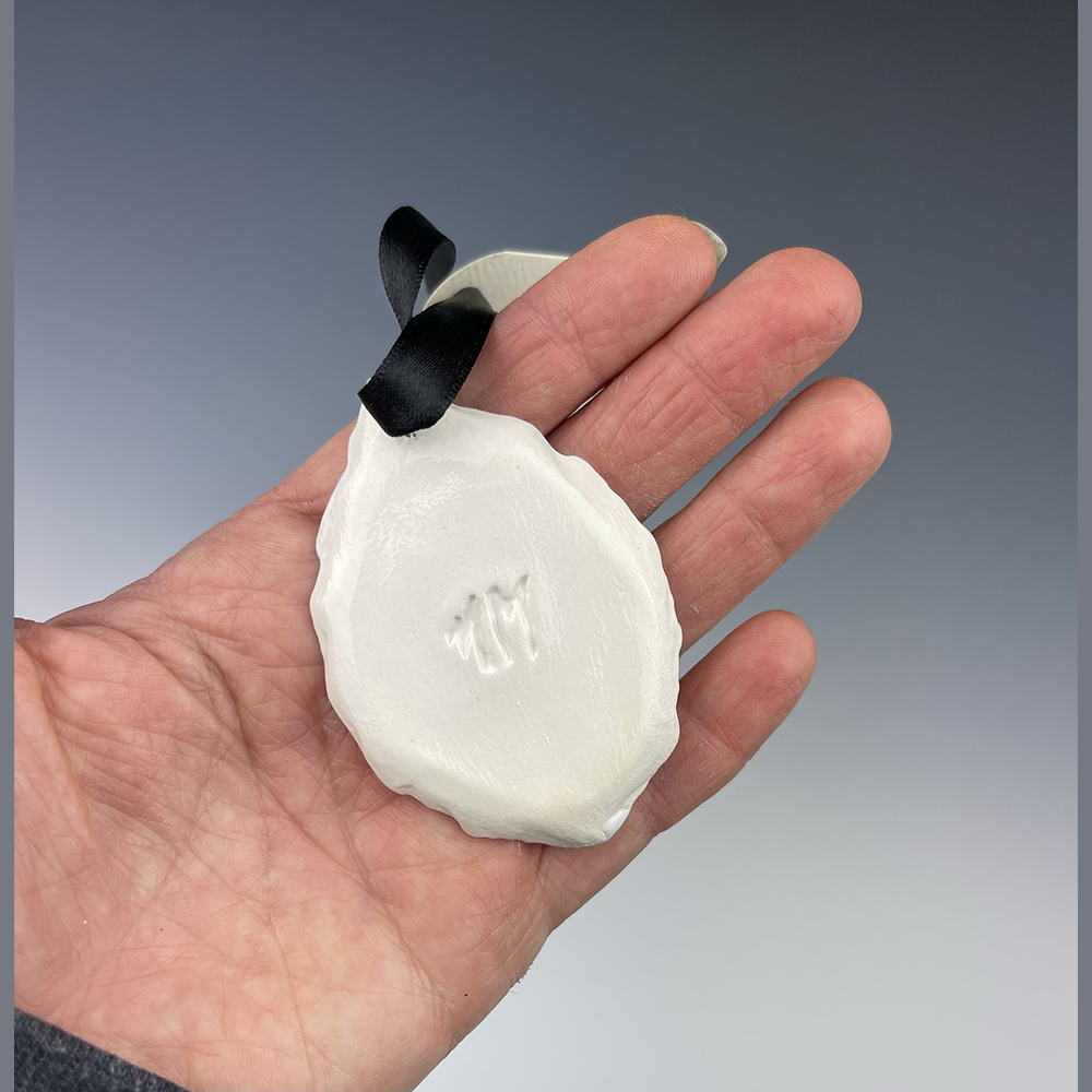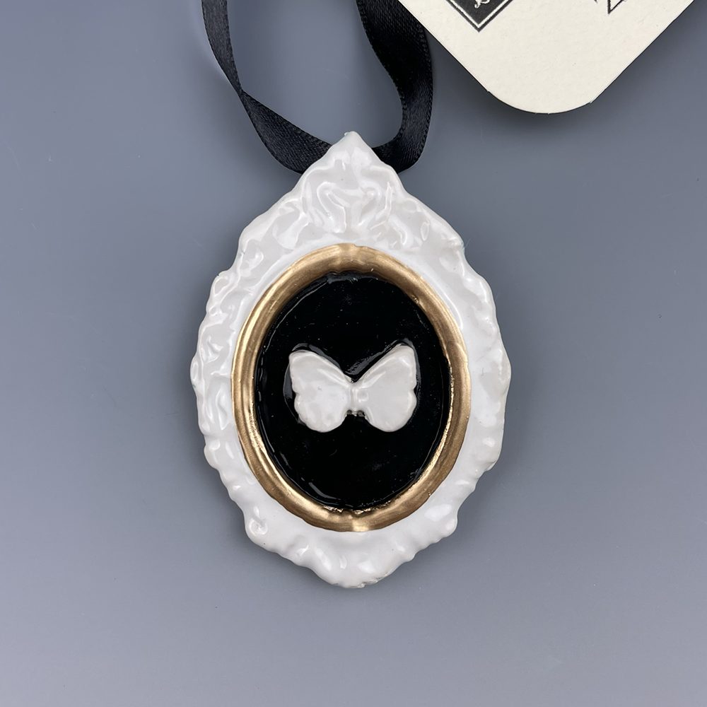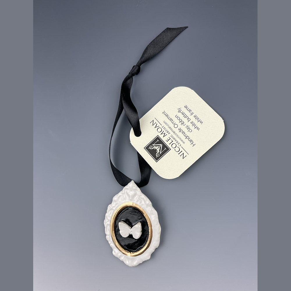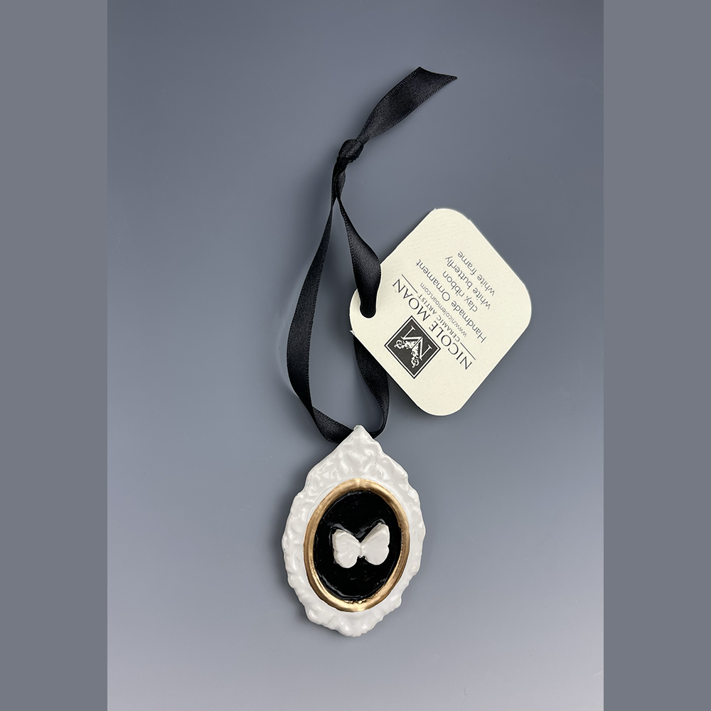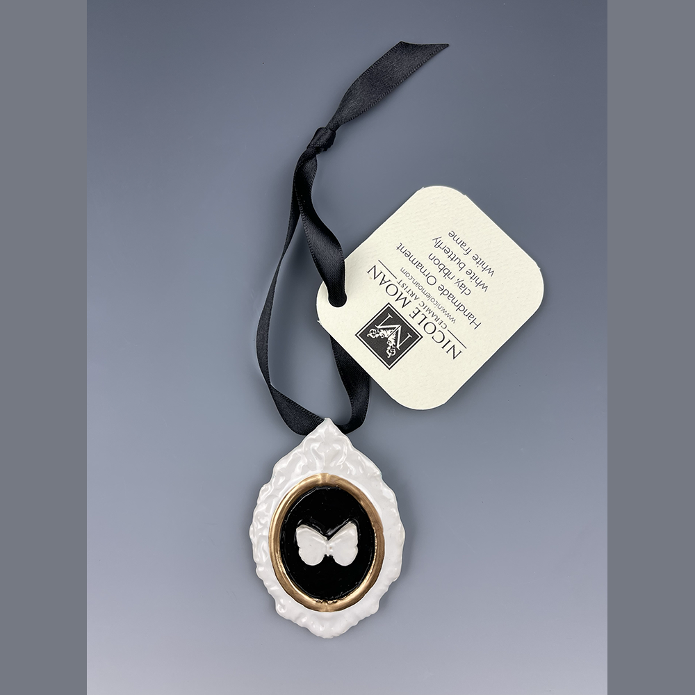Hand sculpted clay Ornament with hand paintedSmall White Butterfly with White Frame and black background Ornament