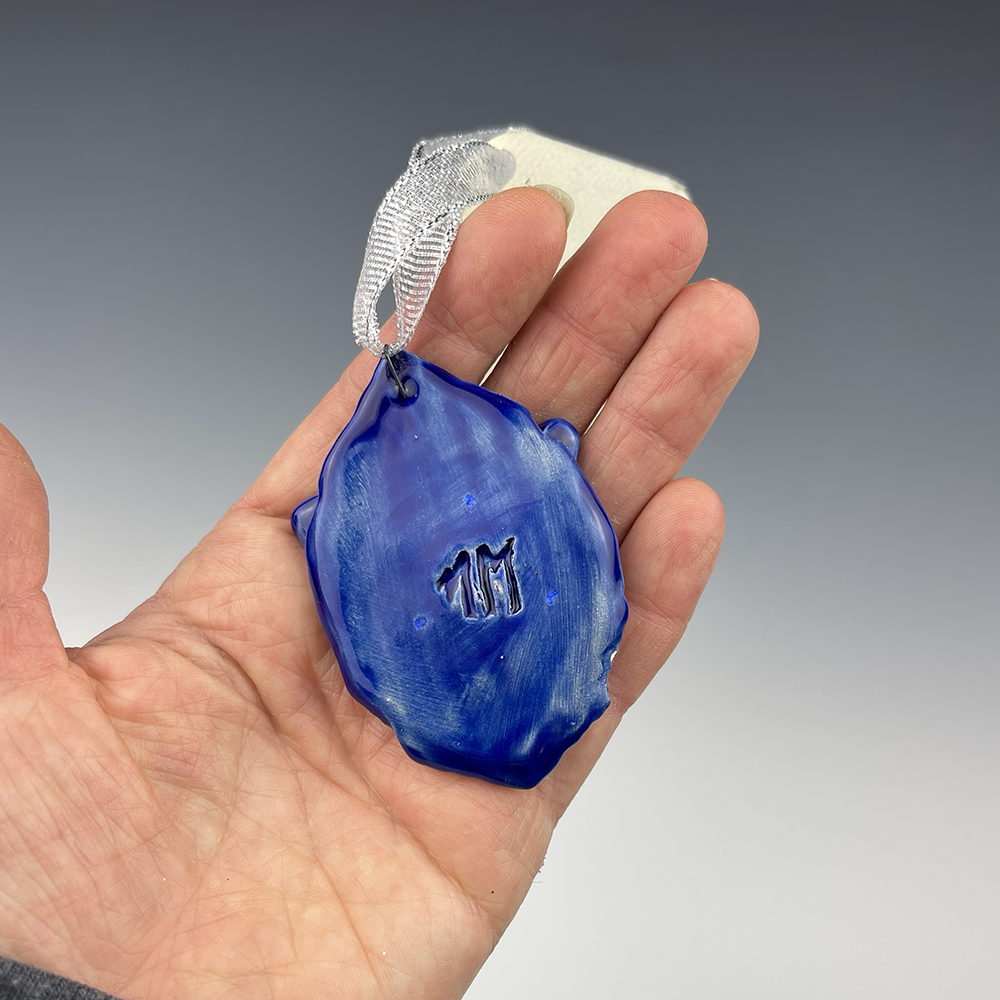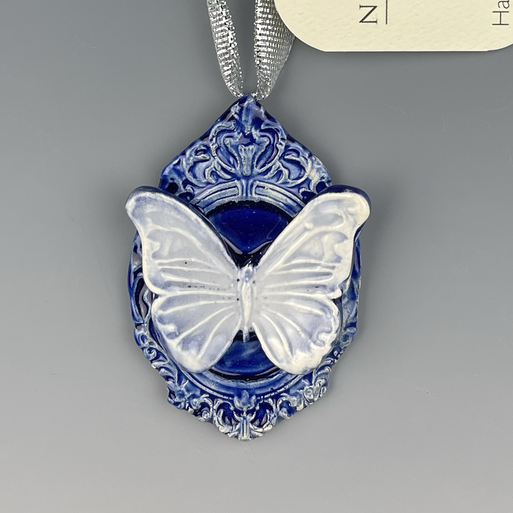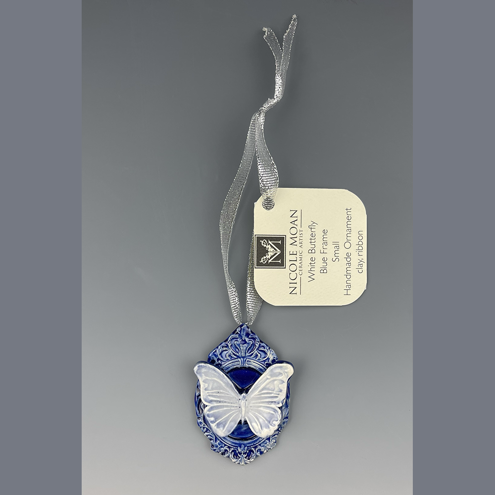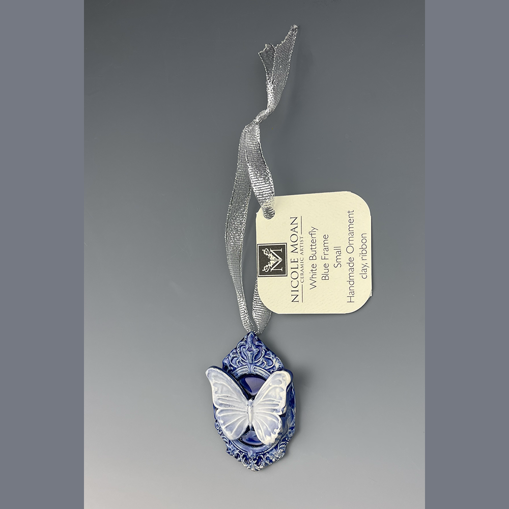 Hand sculpted clay Ornament with hand painted Large White Butterfly with Blue Frame Ornament