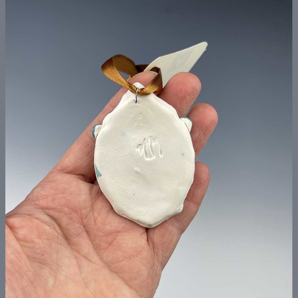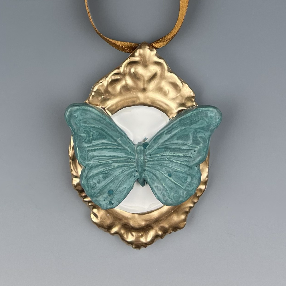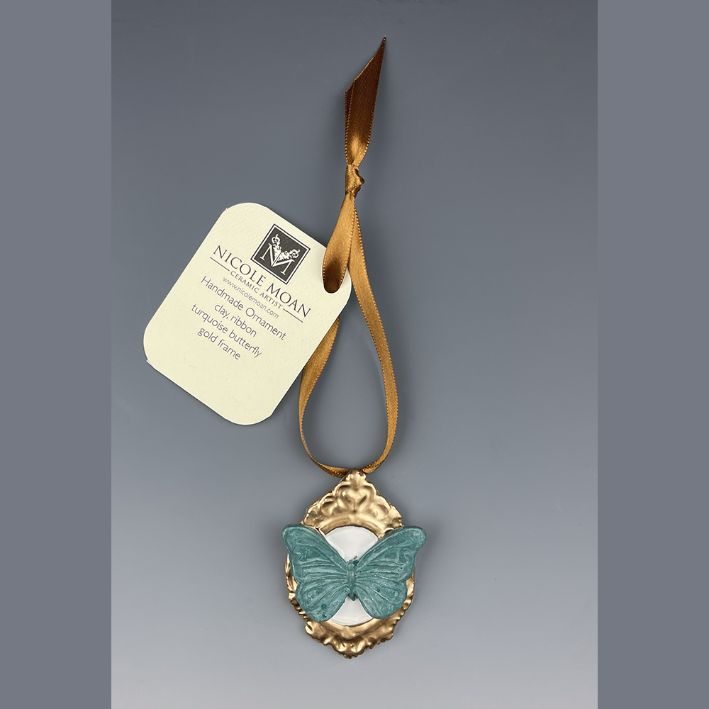 Hand sculpted clay Ornament with hand painted Turquoise Butterfly with gold frame Ornament created by Nicole Moan