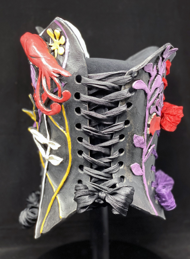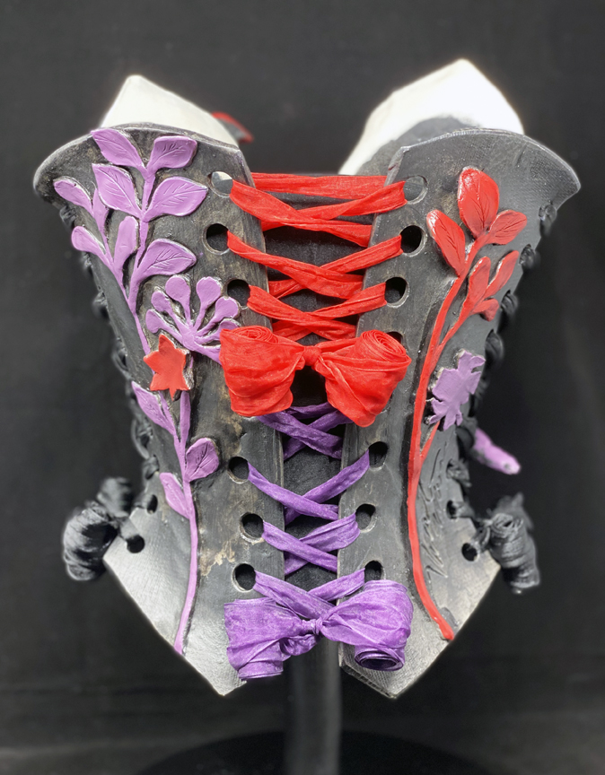Nicole Moan Ceramic Corsets are all hand sculpted clay pieces, glazed with traditional pottery glazes. They are made to be worn or displayed as art. She creates custom pieces as well.