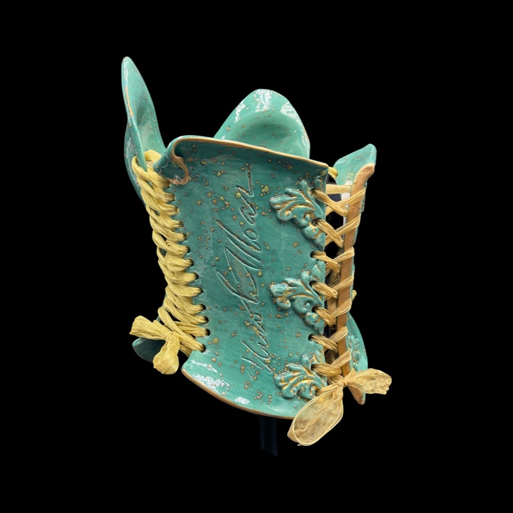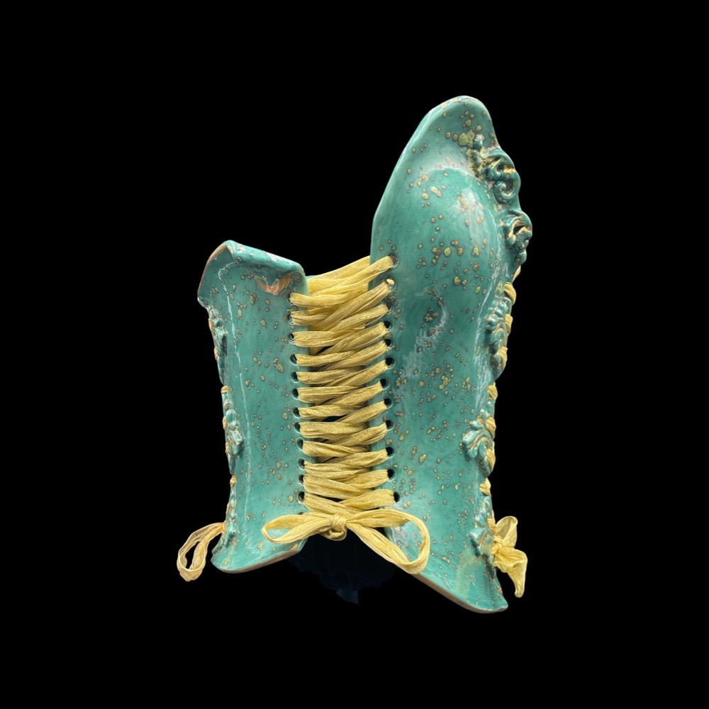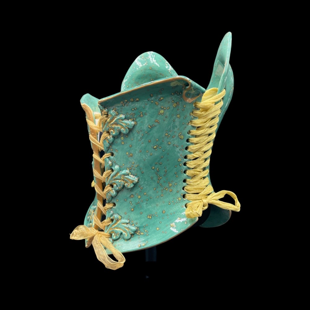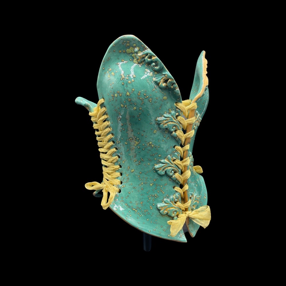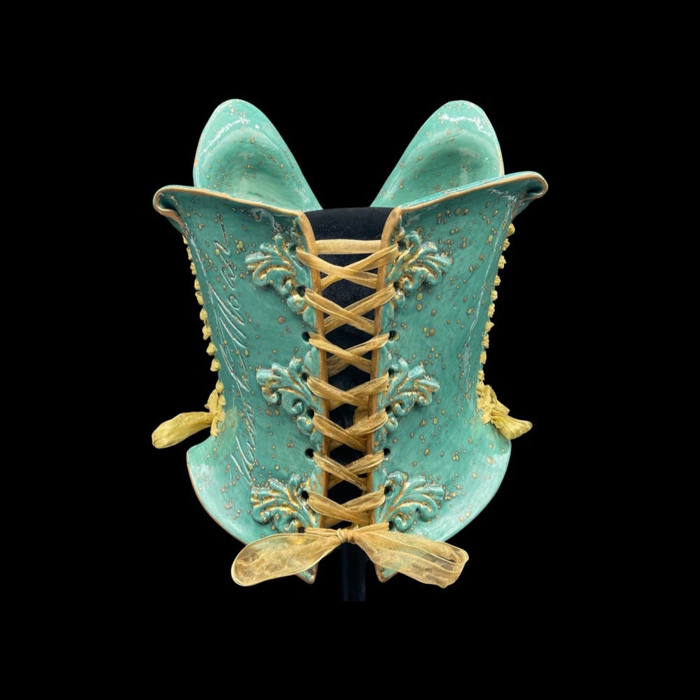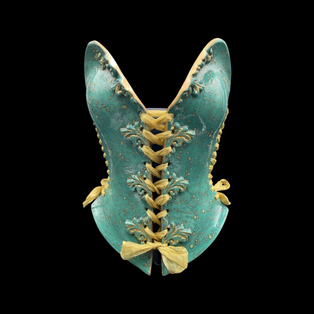 Nicole Moan Ceramic Corsets are all hand sculpted clay pieces, glazed with traditional pottery glazes. They are made to be worn or displayed as art. She creates custom pieces as well.