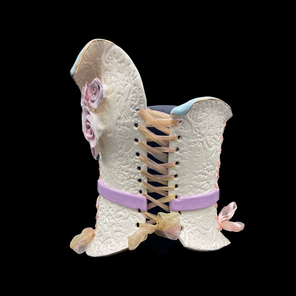 Nicole Moan Ceramic Corsets are all hand sculpted clay pieces, glazed with traditional pottery glazes. They are made to be worn or displayed as art. She creates custom pieces as well.