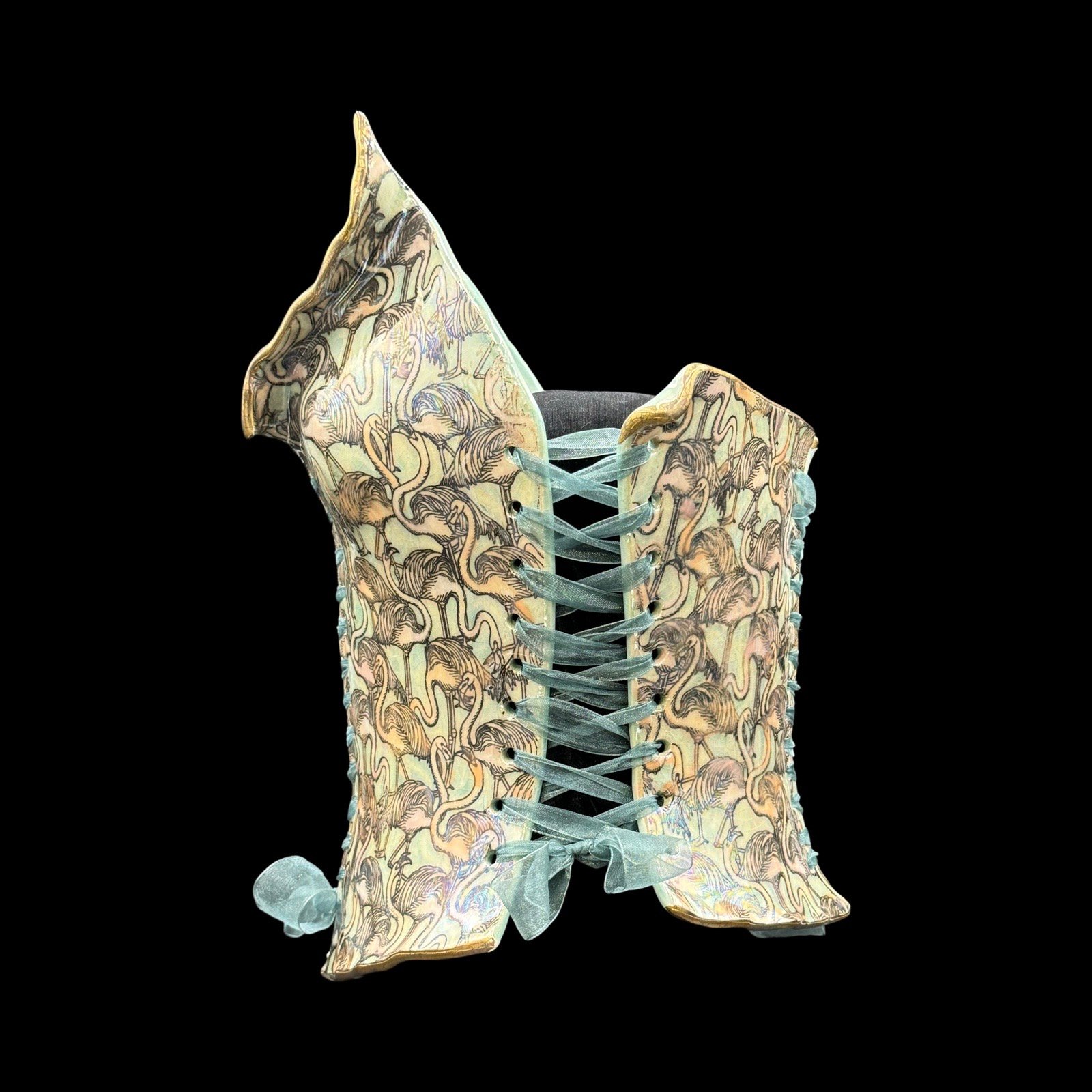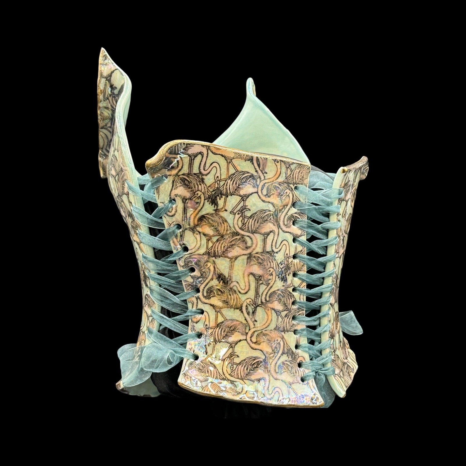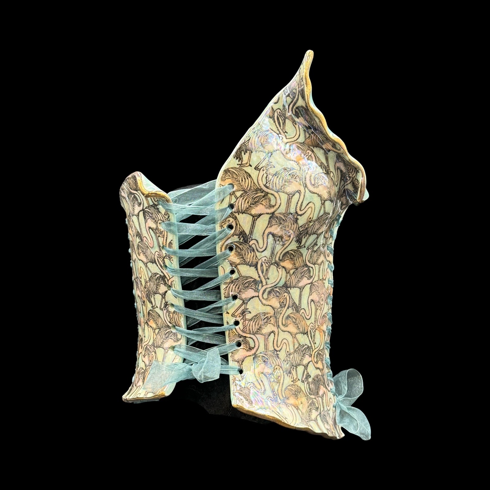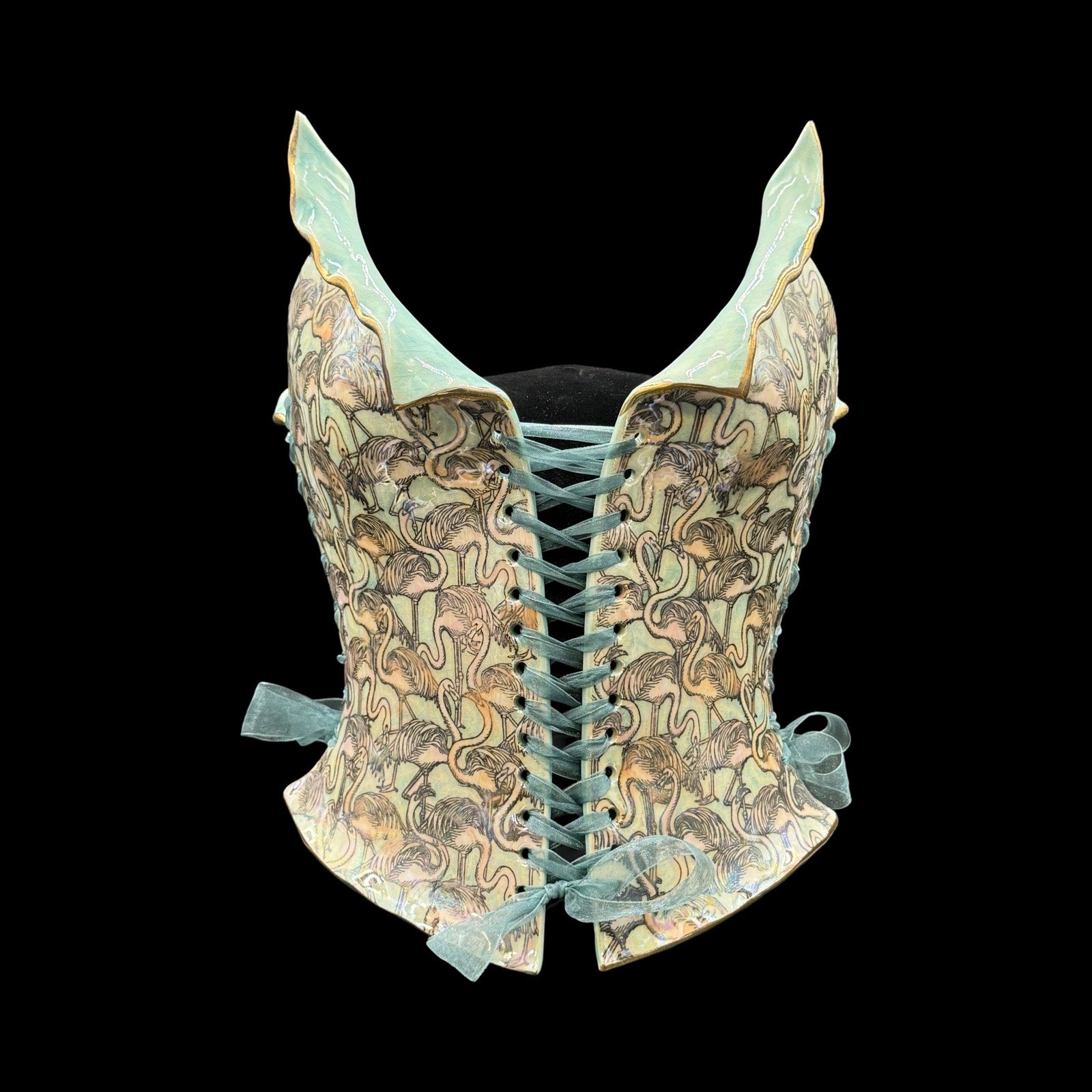 Nicole Moan Ceramic Corsets are all hand sculpted clay pieces, glazed with traditional pottery glazes. They are made to be worn or displayed as art. She creates custom pieces as well.