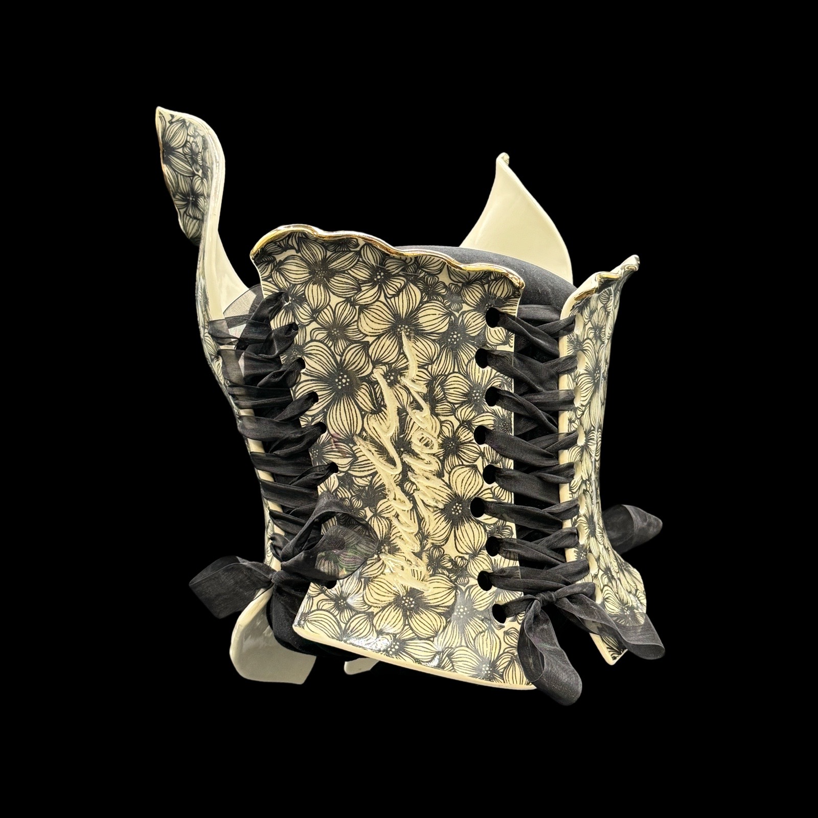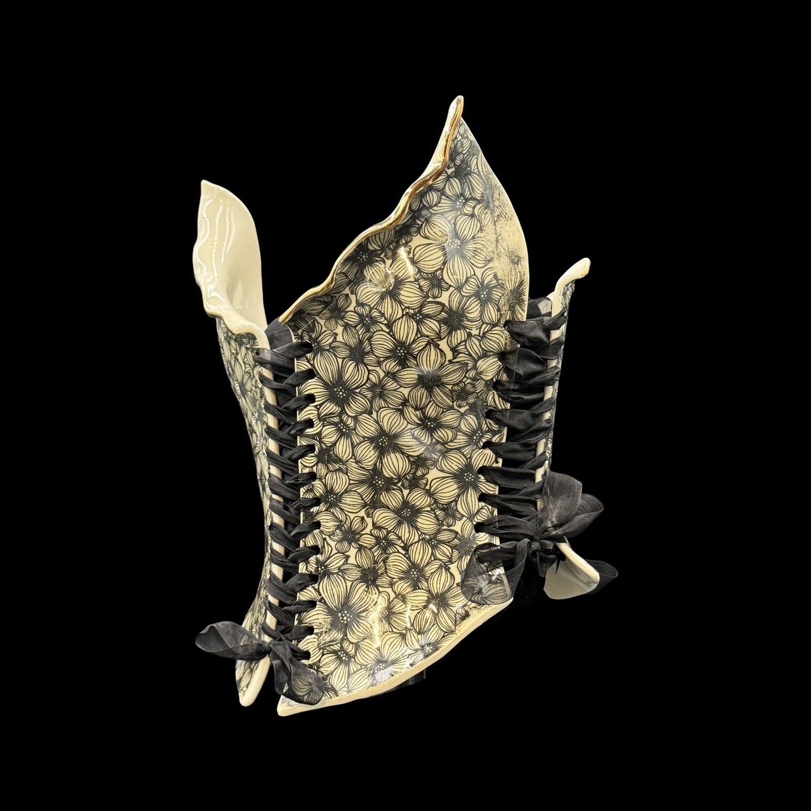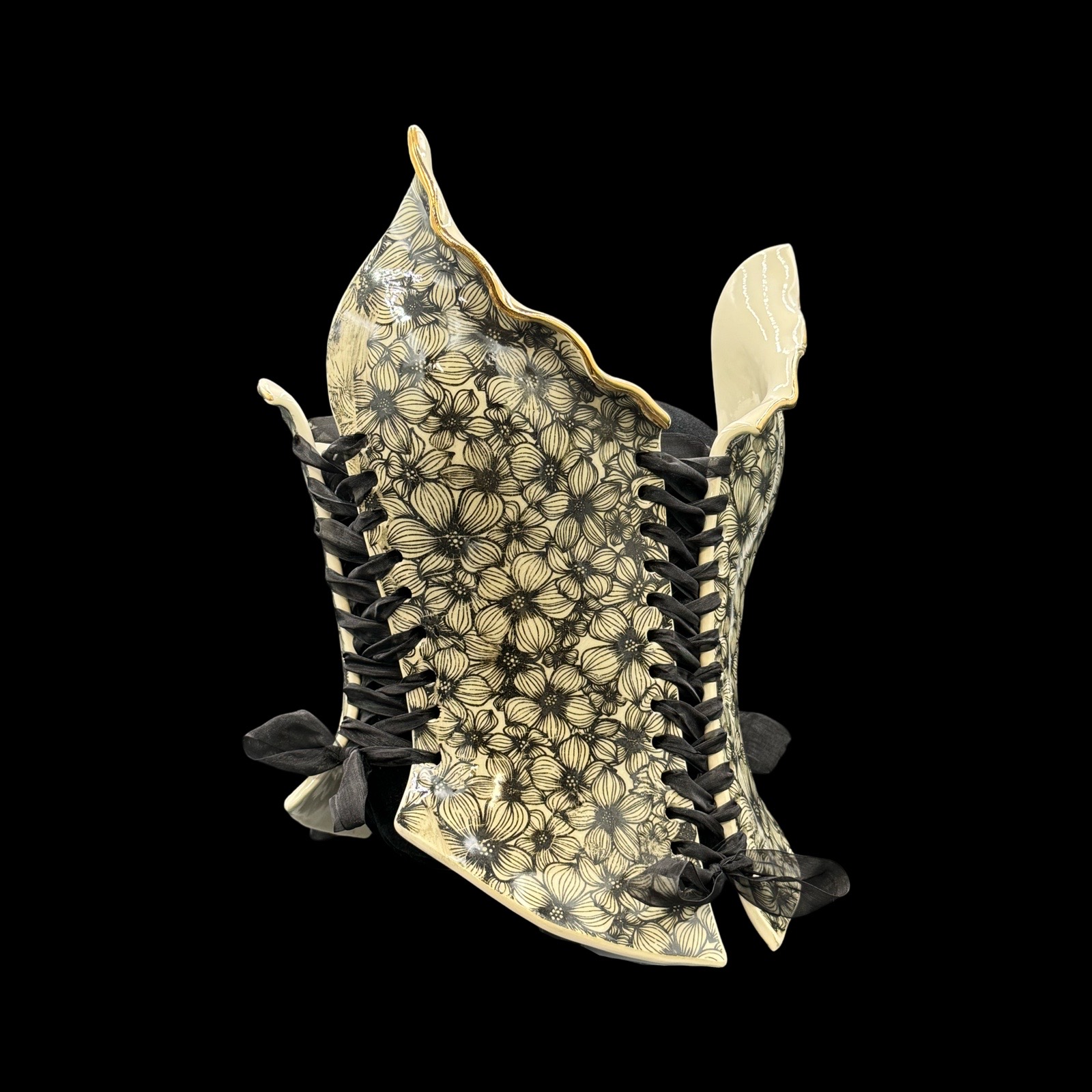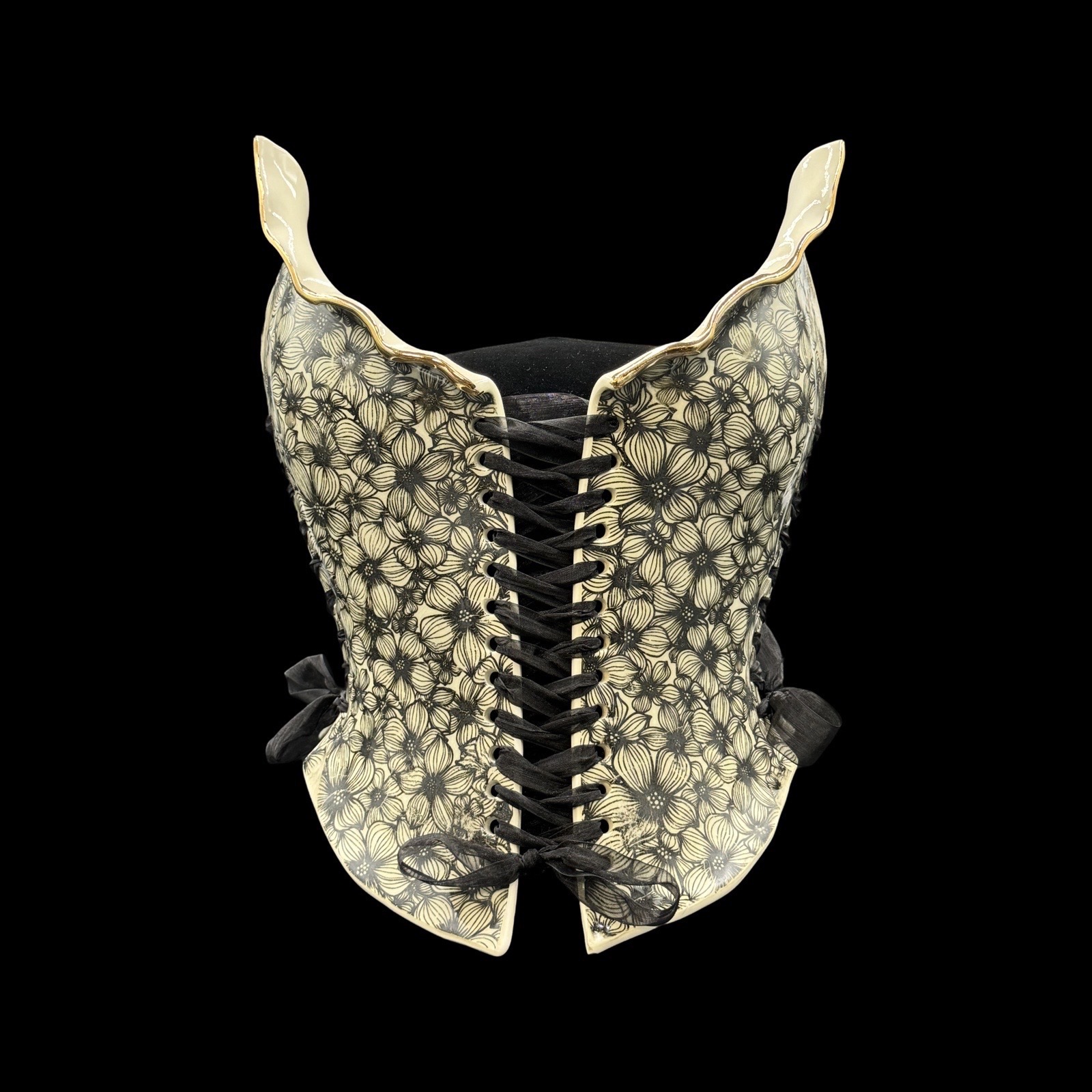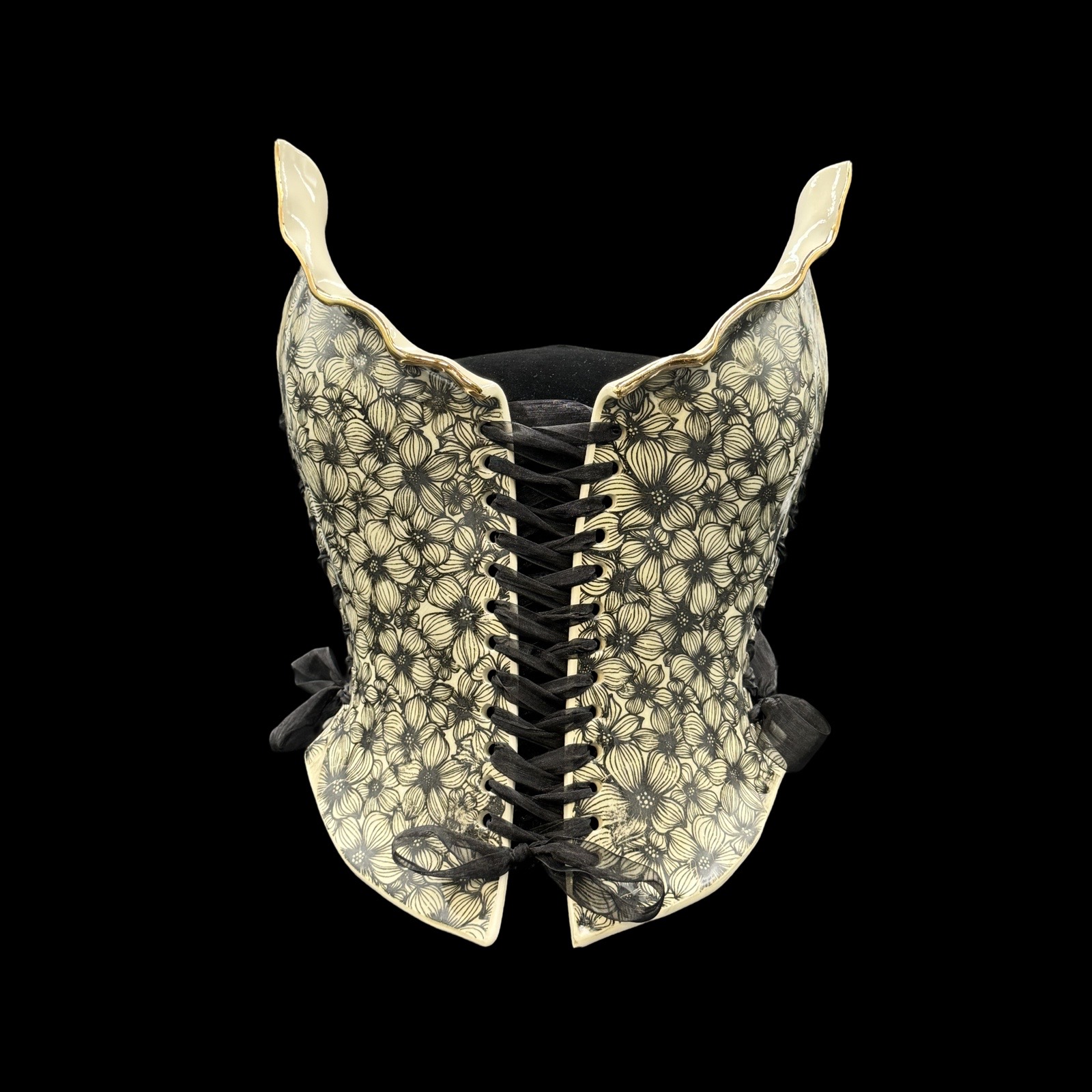 Black and White Bloom Gold Leaf trim wearable ceramic corset by: Nicole Moan