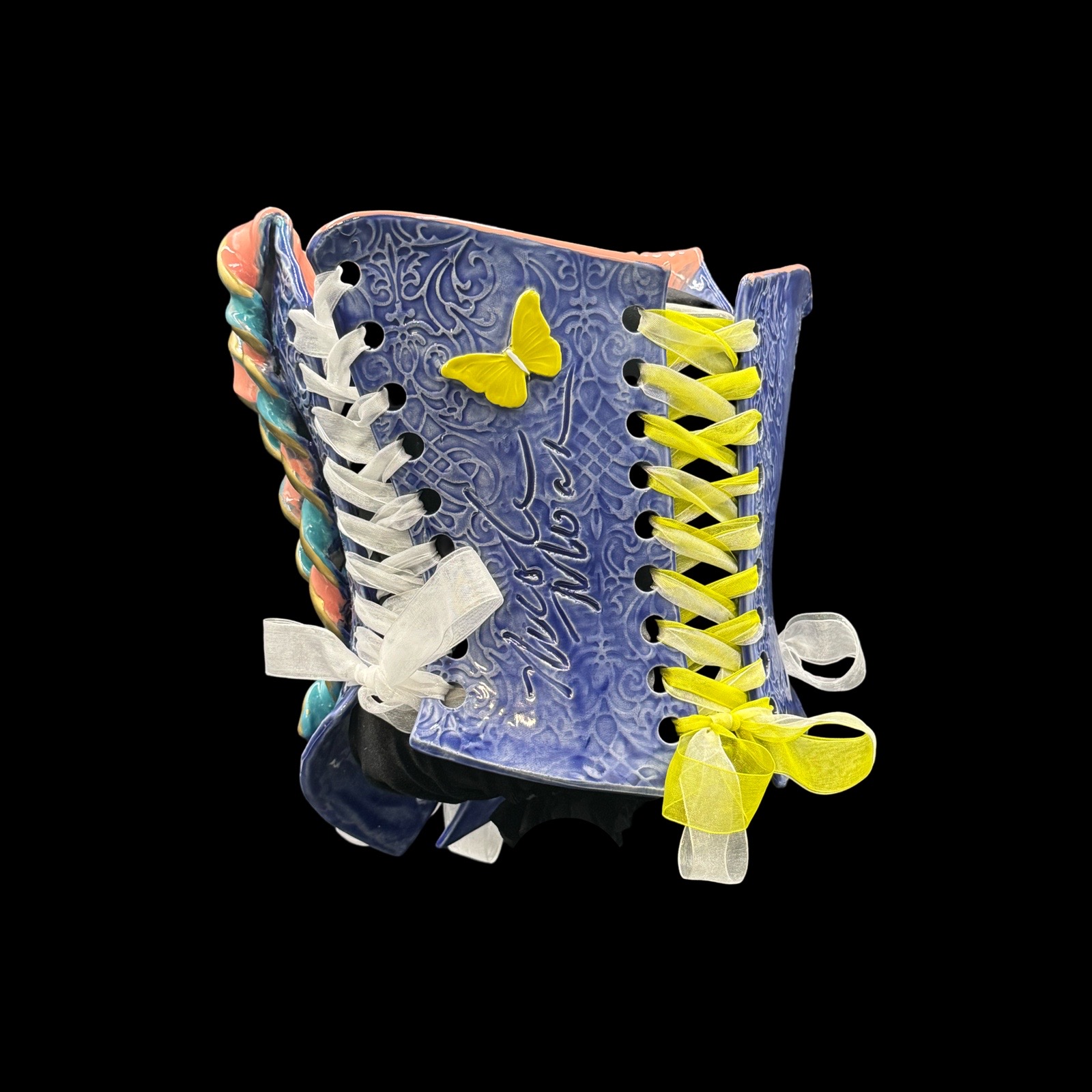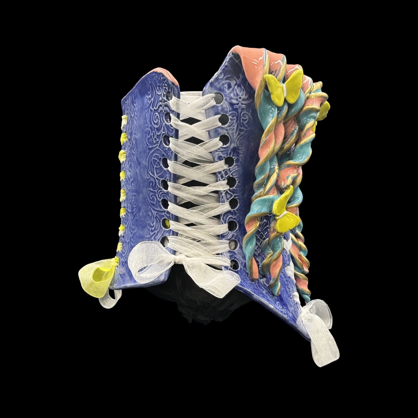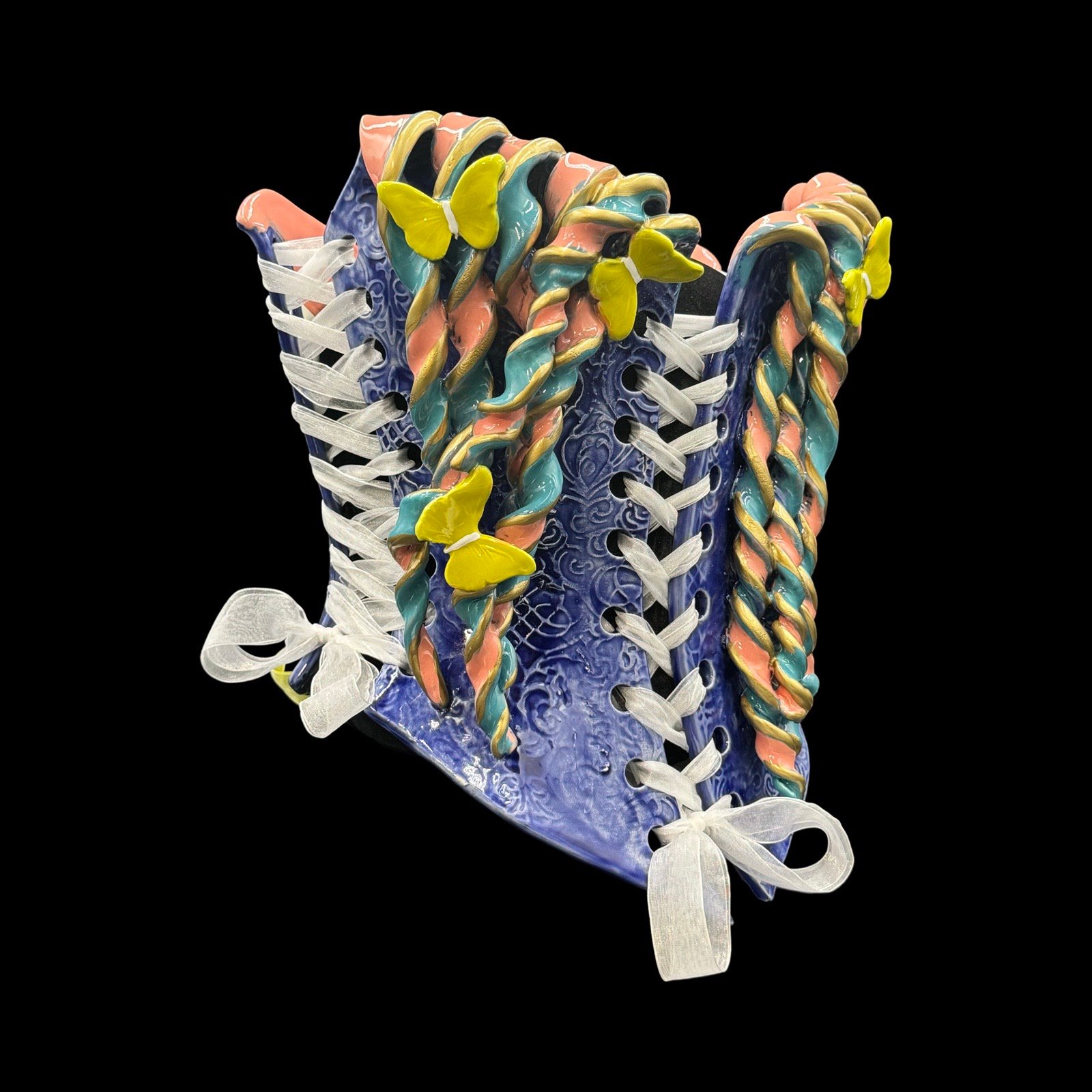 Nicole Moan Ceramic Corsets are all hand sculpted clay pieces, glazed with traditional pottery glazes. They are made to be worn or displayed as art. She creates custom pieces as well.