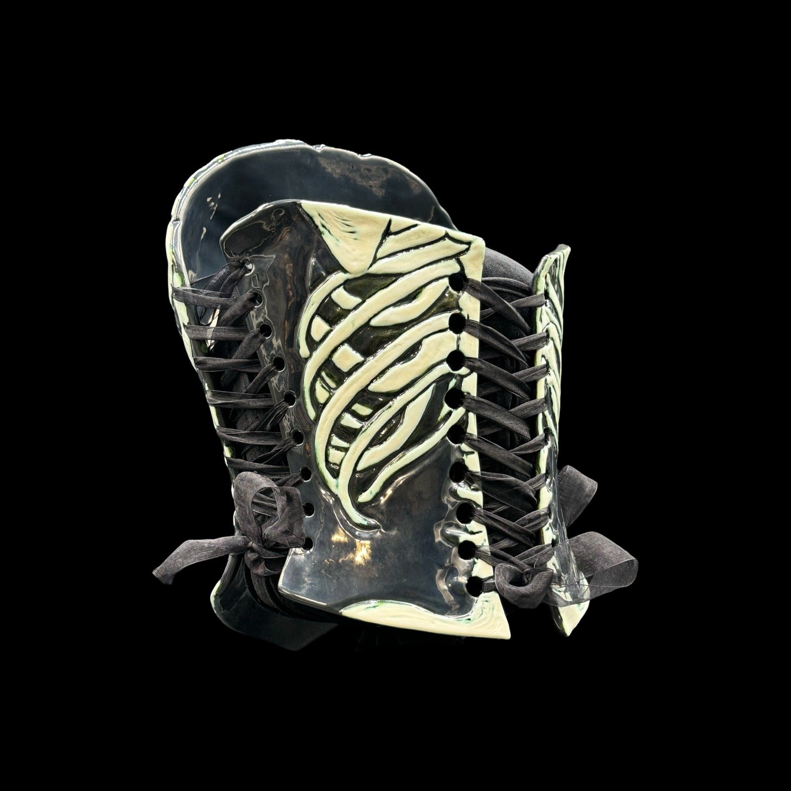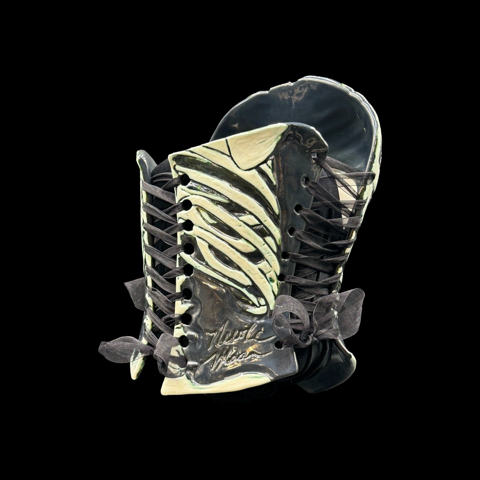 Nicole Moan Ceramic Corsets are all hand sculpted clay pieces, glazed with traditional pottery glazes. They are made to be worn or displayed as art. She creates custom pieces as well.