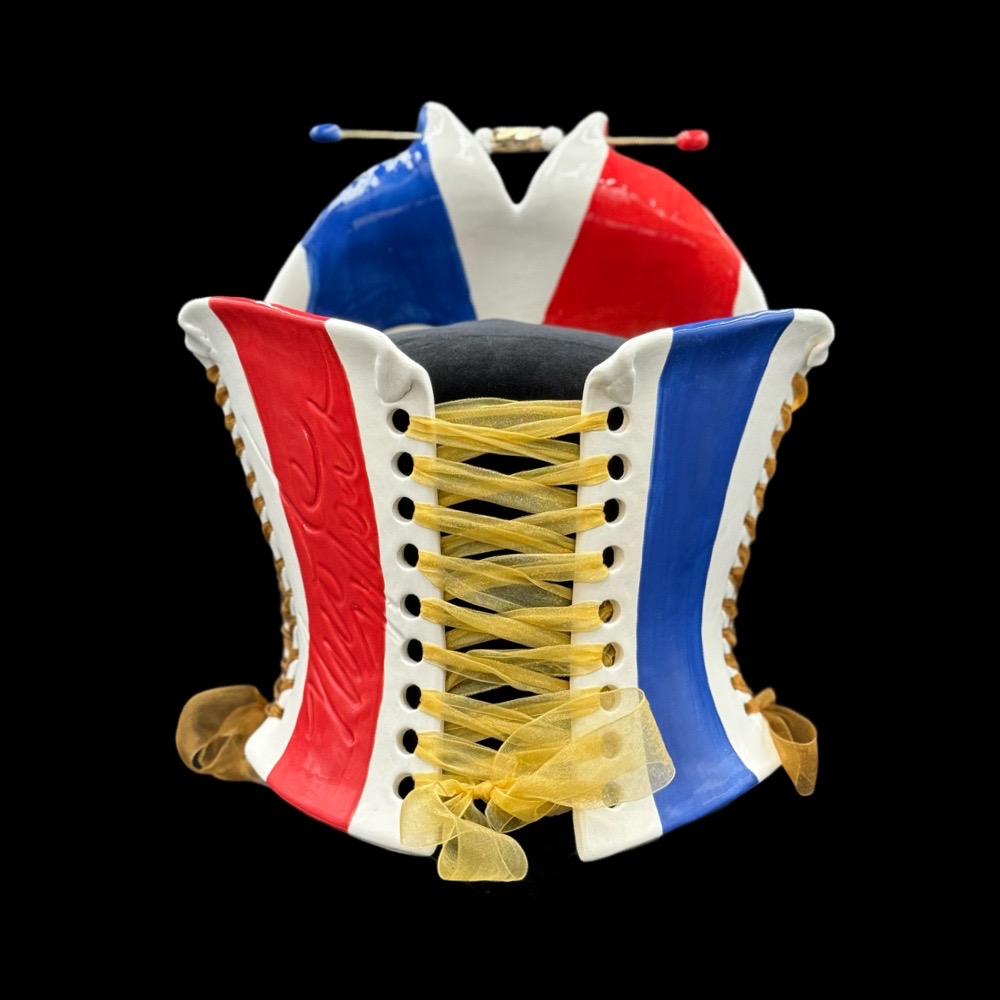 Nicole Moan Ceramic Corsets are all hand sculpted clay pieces, glazed with traditional pottery glazes. They are made to be worn or displayed as art. She creates custom pieces as well.